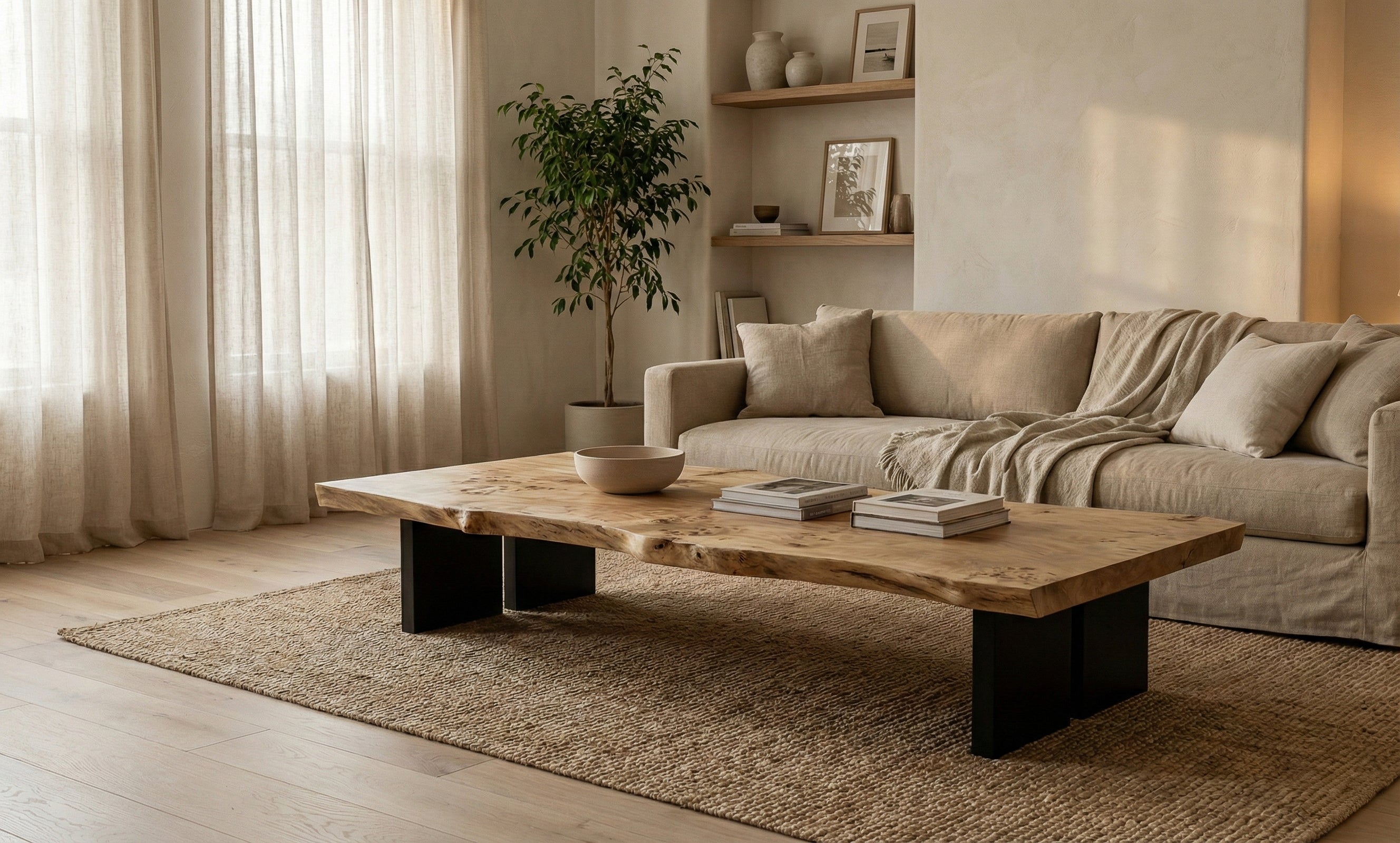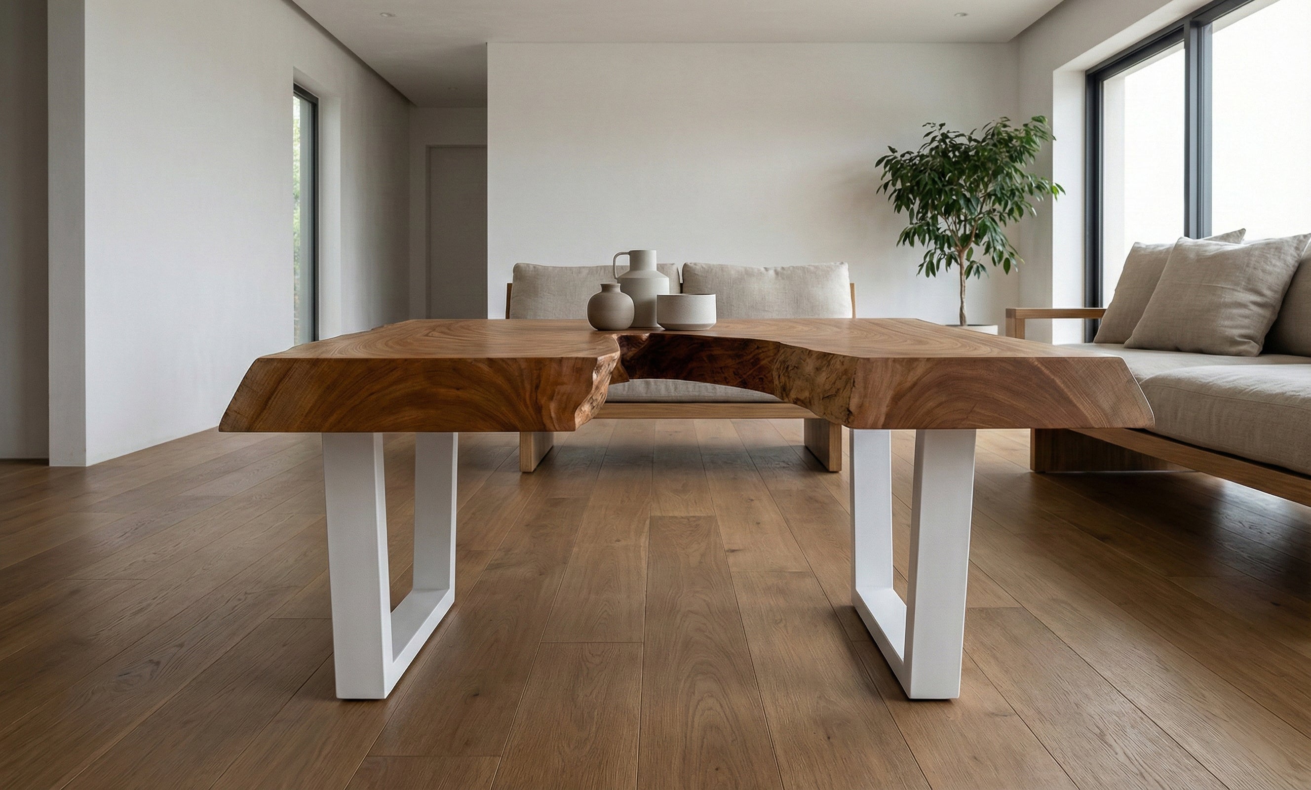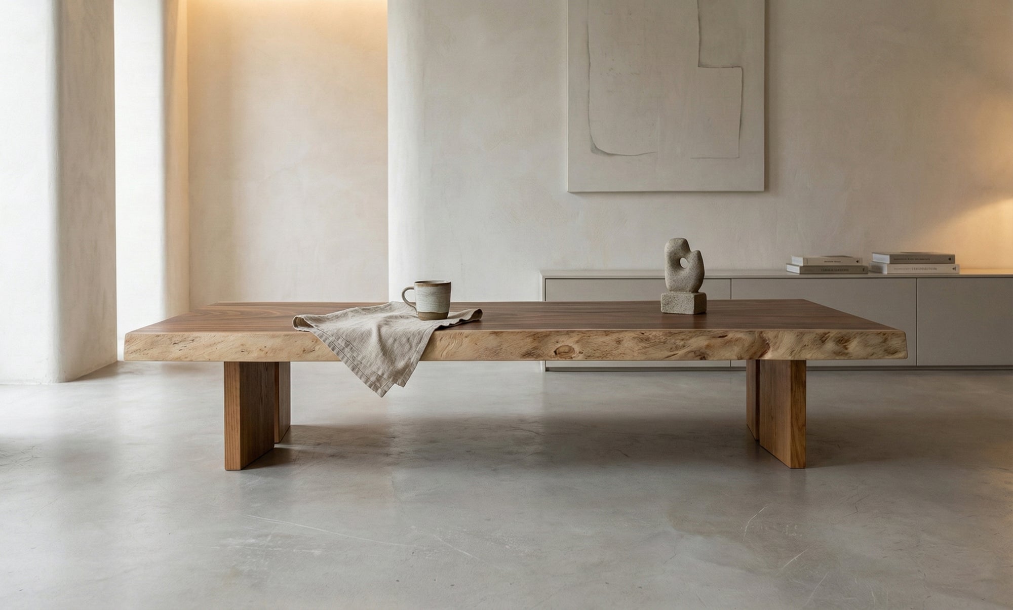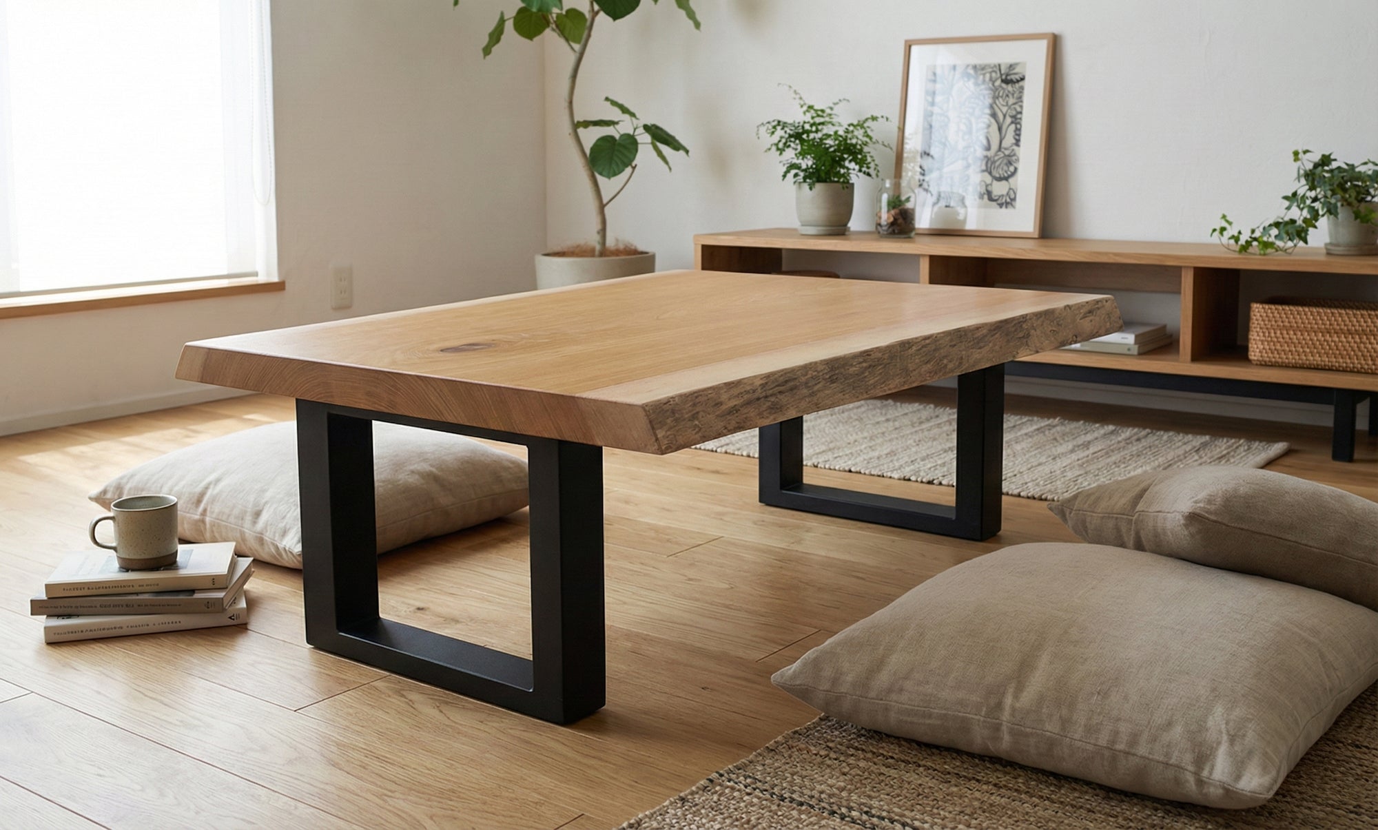 視線が低くなる空間だからこそ、一枚板の木目や輪郭が際立つローテーブルのコーディネート事例をご紹介します。床座やソファ前といった使い方に合わせ、脚の高さや椅子・クッションとの関係性が、空間の心地よさを形づくります。すべて実在する一点ものの一枚板を用いた事例で、写真に登場するテーブルはご購入可能です。日常の動線や過ごし方に、自然と馴染む一枚板の在り方を感じていただけます。