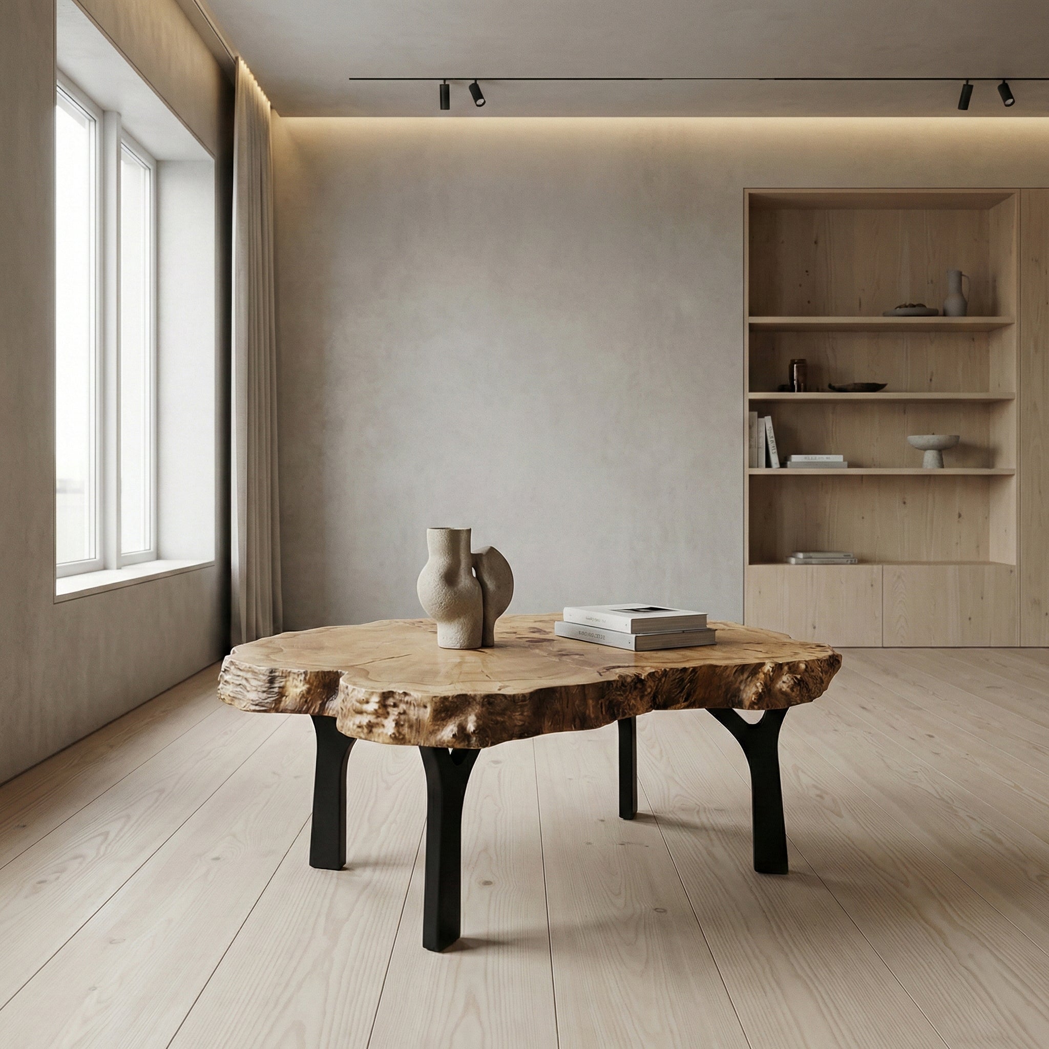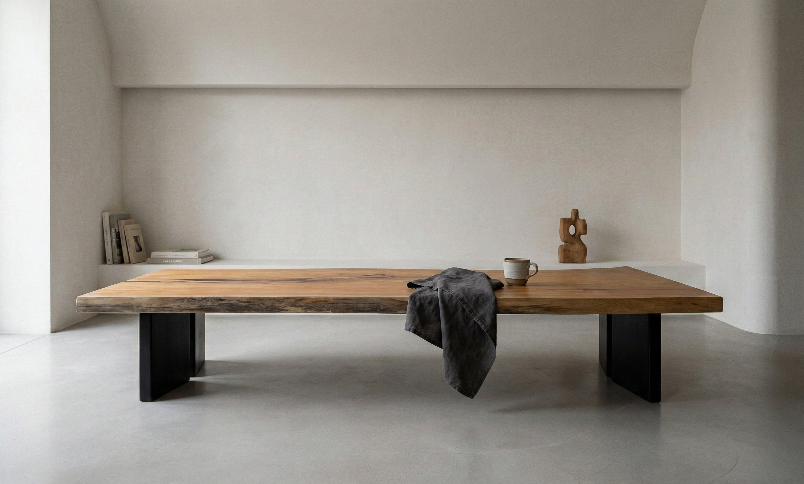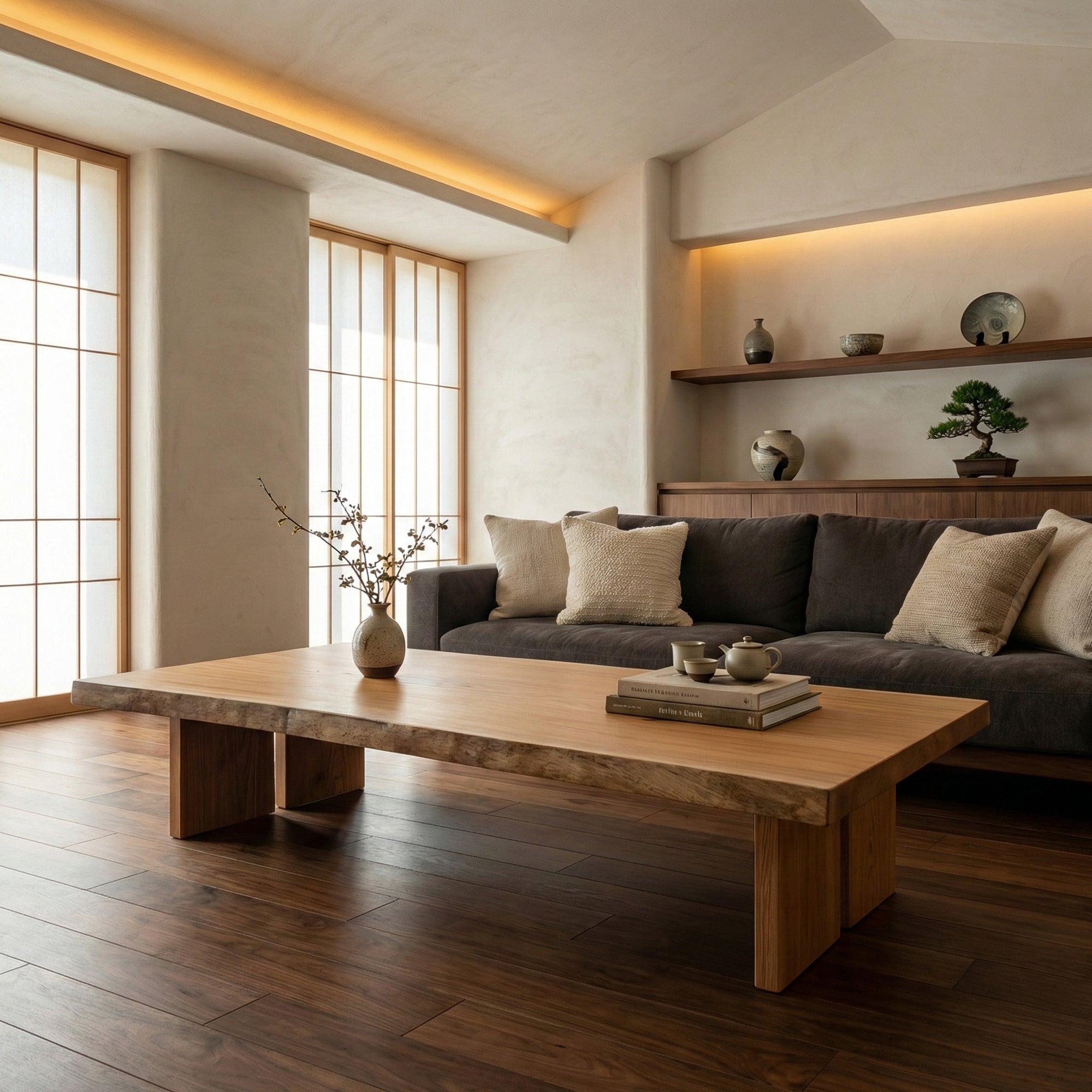 視線が低くなる空間だからこそ、一枚板の木目や輪郭が際立つローテーブルのコーディネート事例をご紹介します。床座やソファ前といった使い方に合わせ、脚の高さや椅子・クッションとの関係性が、空間の心地よさを形づくります。すべて実在する一点ものの一枚板を用いた事例で、写真に登場するテーブルはご購入可能です。日常の動線や過ごし方に、自然と馴染む一枚板の在り方を感じていただけます。