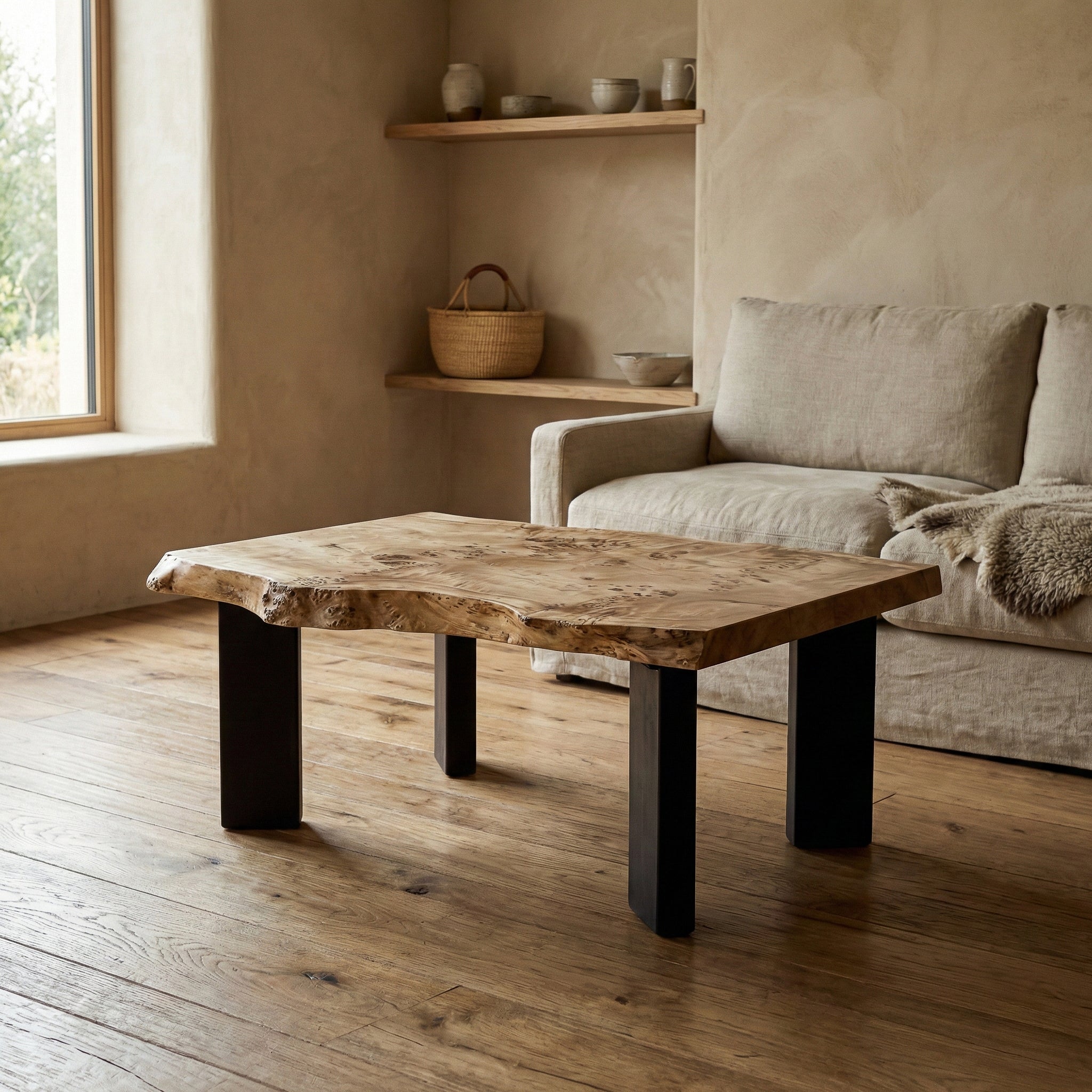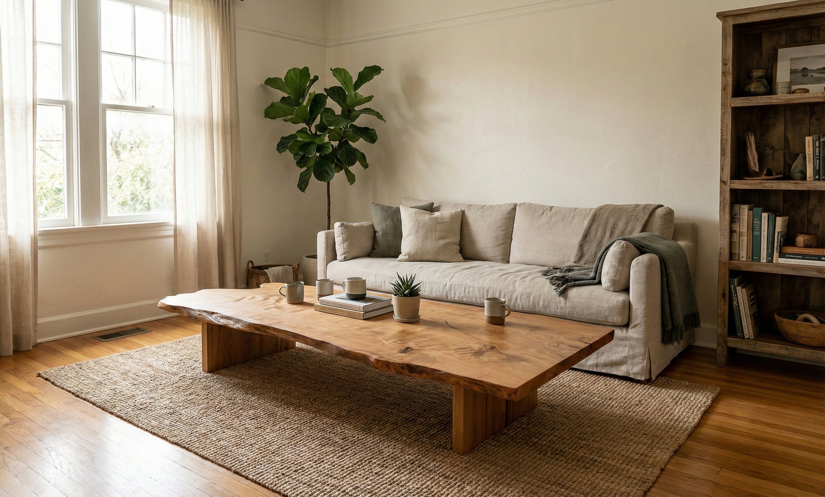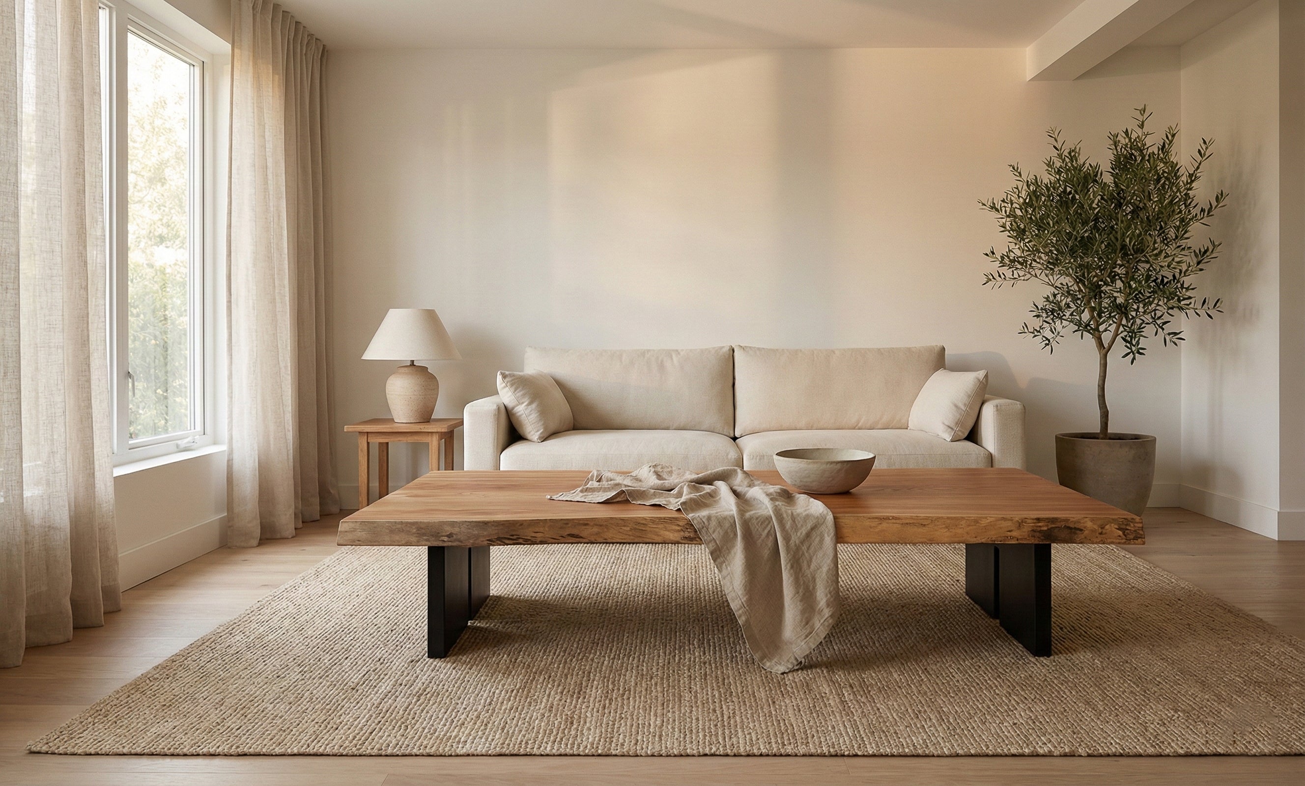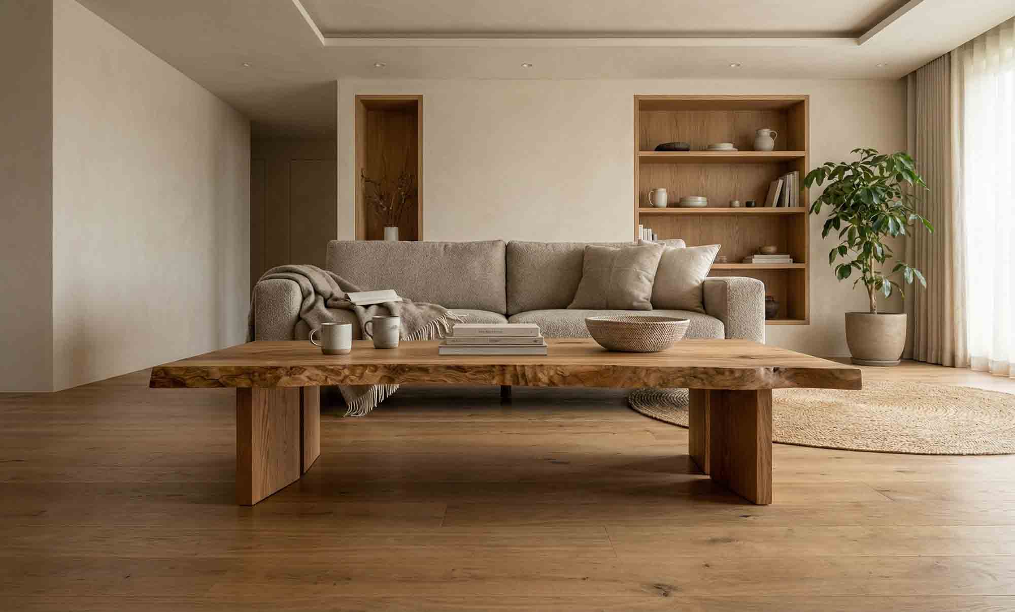 視線が低くなる空間だからこそ、一枚板の木目や輪郭が際立つローテーブルのコーディネート事例をご紹介します。床座やソファ前といった使い方に合わせ、脚の高さや椅子・クッションとの関係性が、空間の心地よさを形づくります。すべて実在する一点ものの一枚板を用いた事例で、写真に登場するテーブルはご購入可能です。日常の動線や過ごし方に、自然と馴染む一枚板の在り方を感じていただけます。
