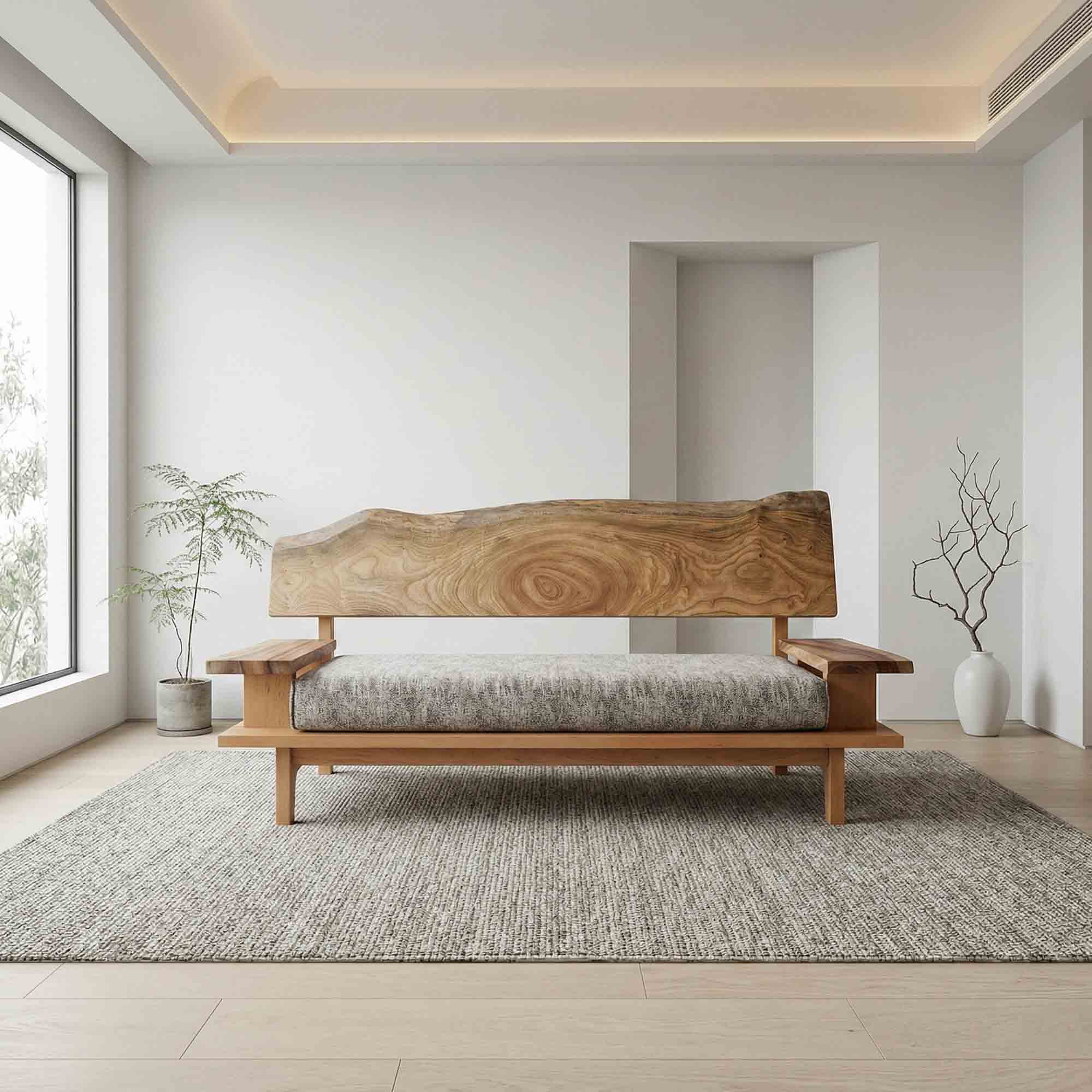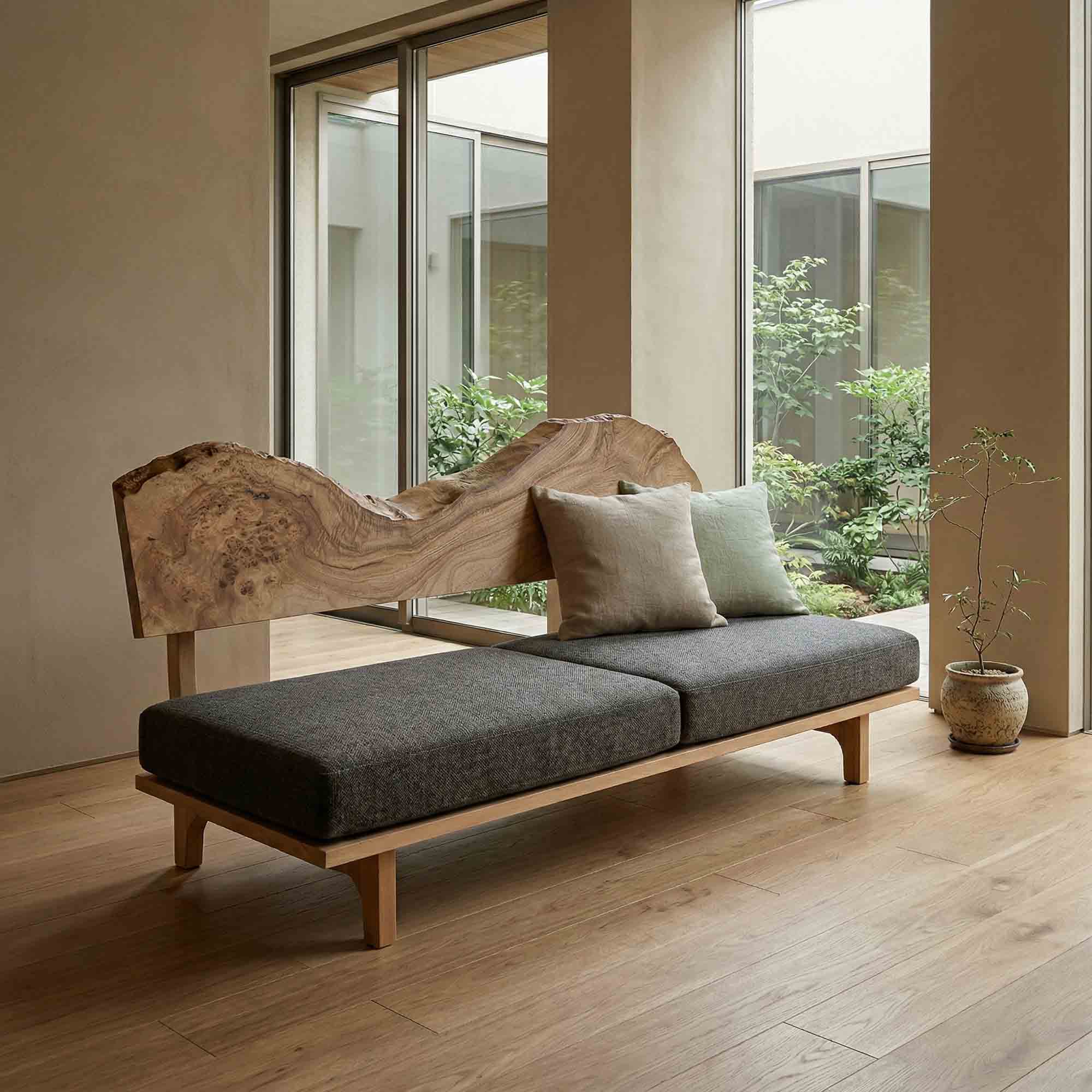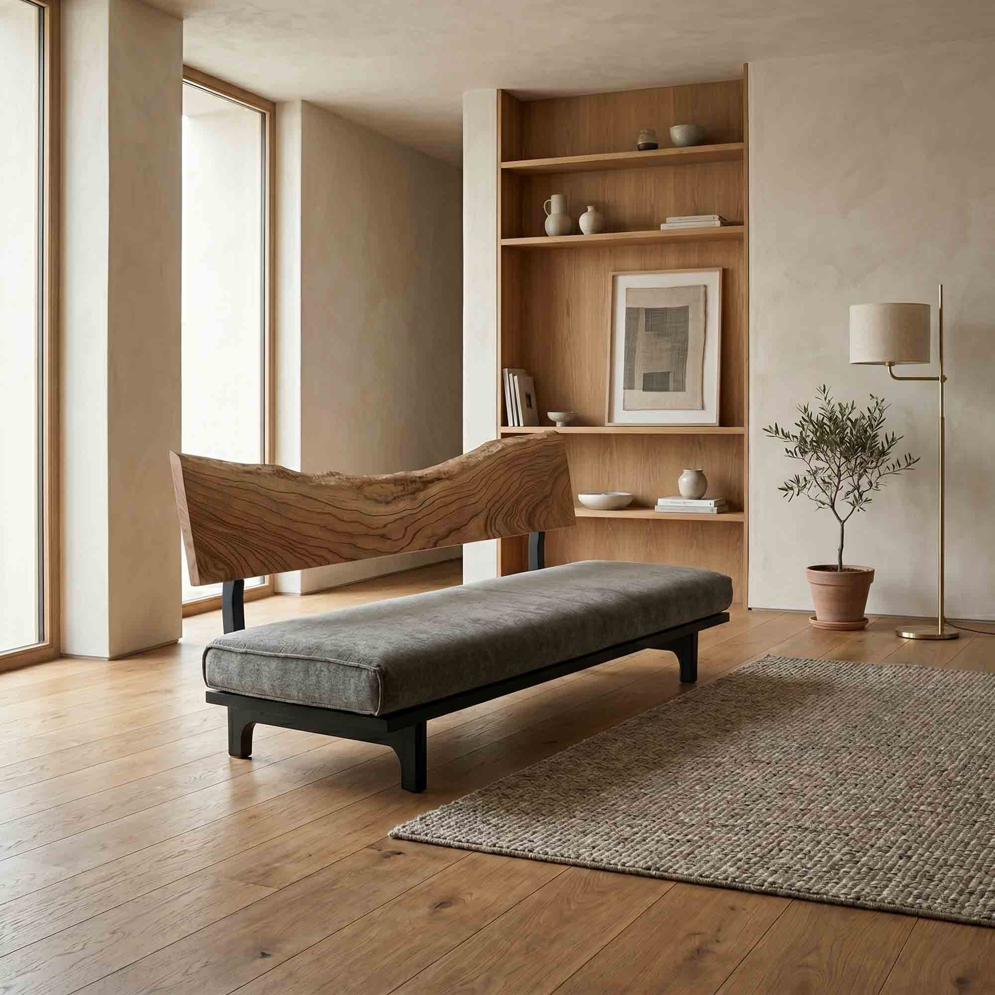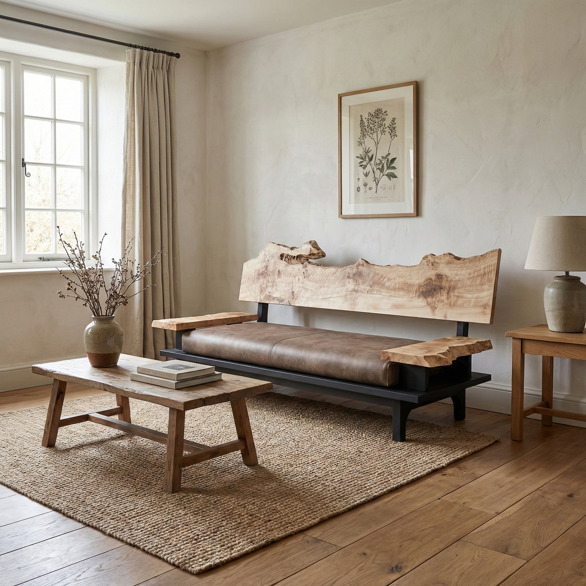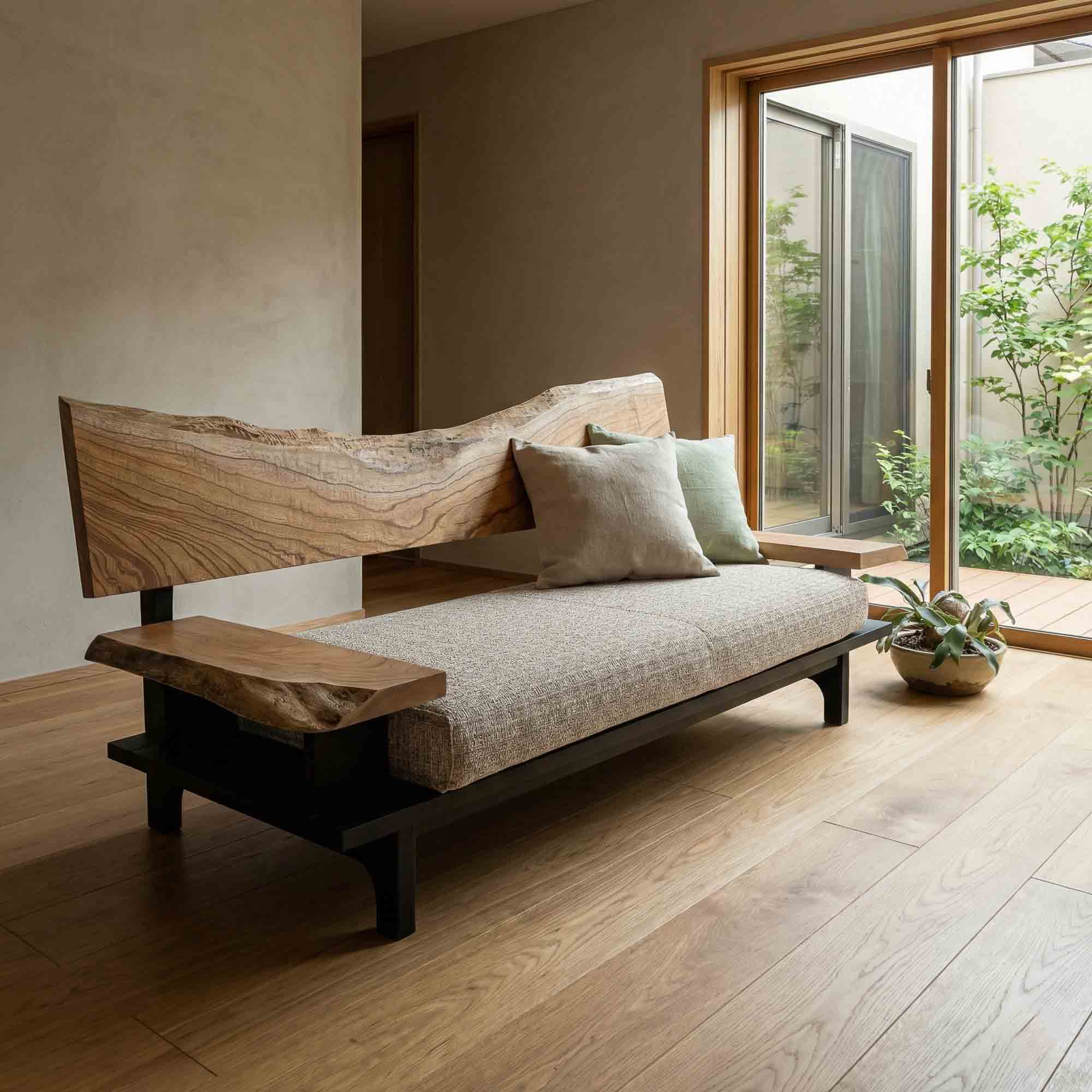 リビング空間の重心となる一枚板を、ソファやラグ、照明と組み合わせたコーディネート事例をご紹介します。天板の存在感を受け止める脚の形状や、ソファとの高さ・奥行きの関係が、くつろぎの質を大きく左右します。掲載しているのはすべて一点ものの一枚板による実例で、写真内のテーブルや周辺アイテムは実際にお選びいただけます。木の表情が空間に溶け込み、暮らしに静かな豊かさをもたらす様子をご覧ください。
