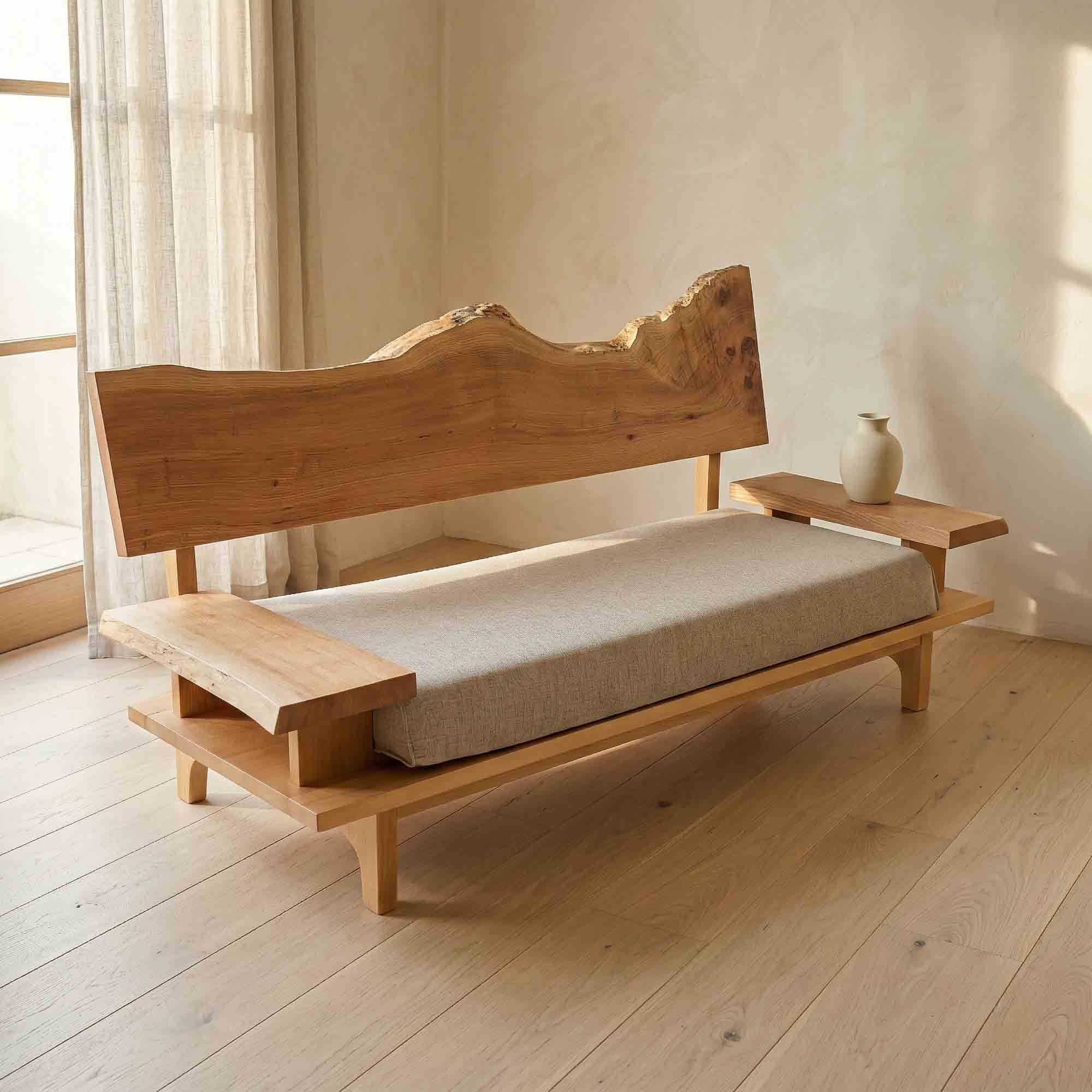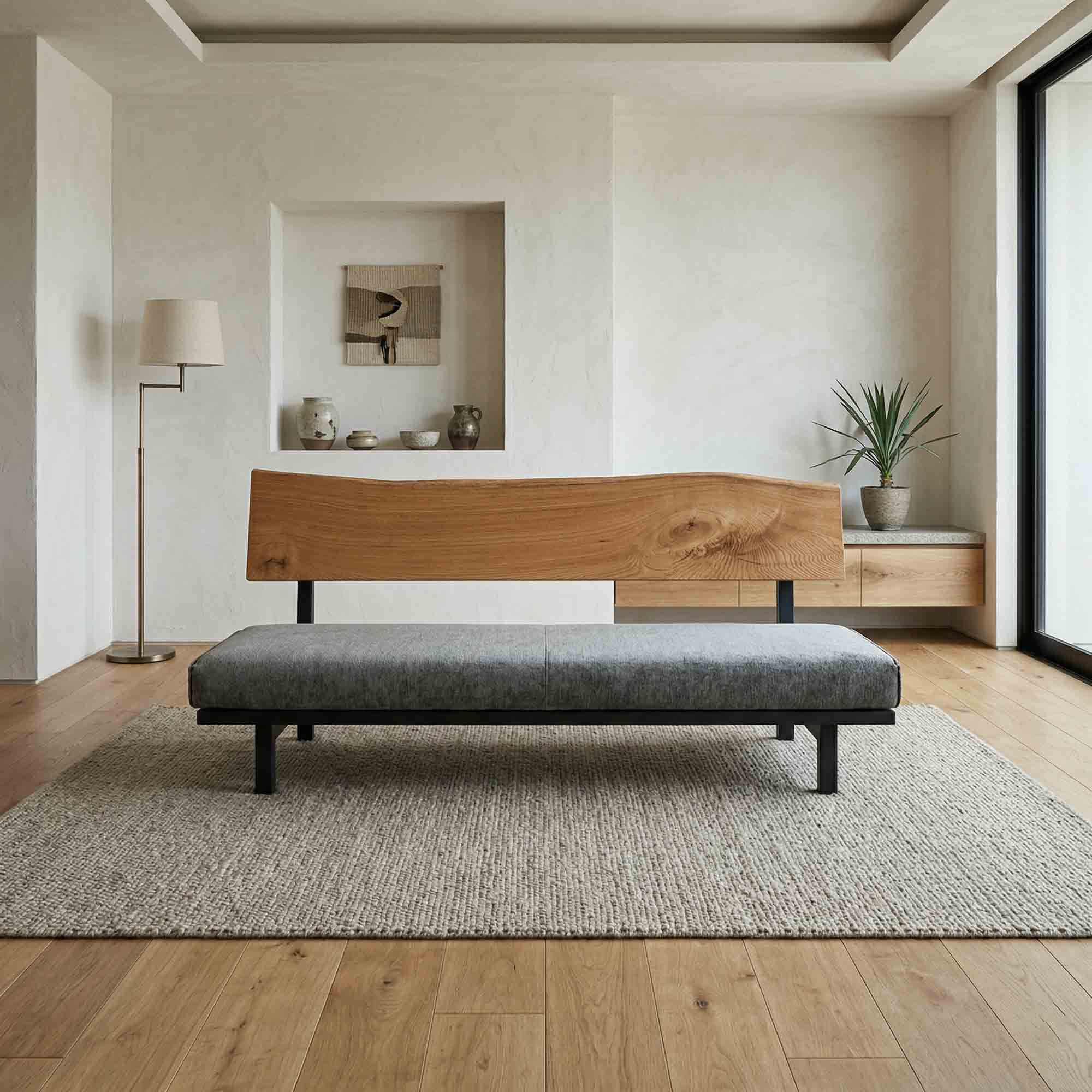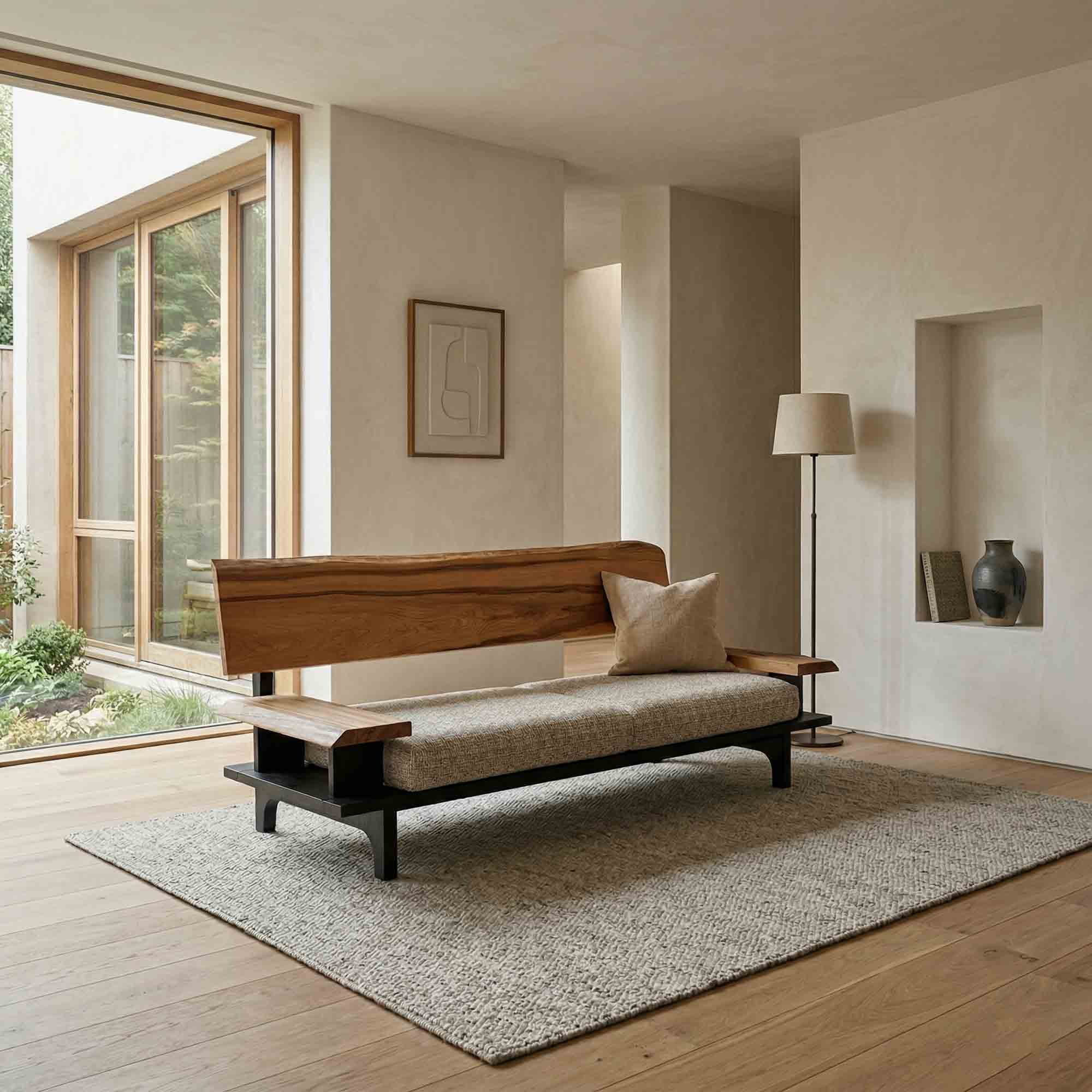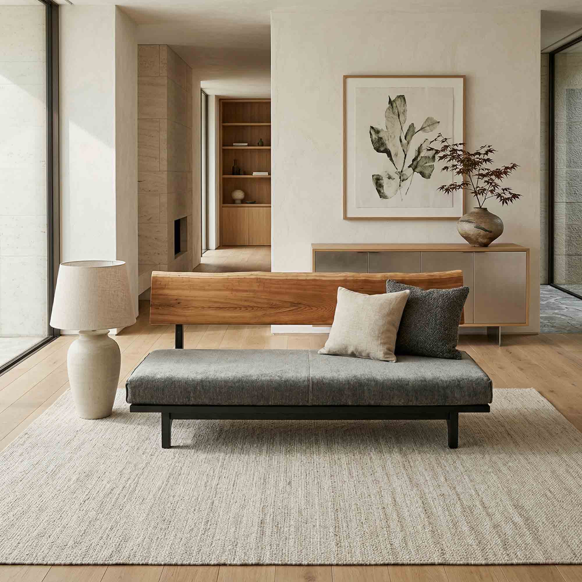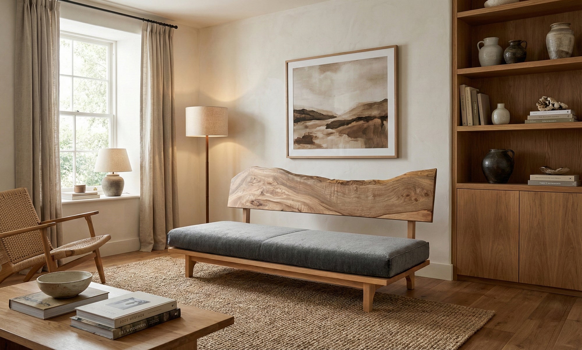 リビング空間の重心となる一枚板を、ソファやラグ、照明と組み合わせたコーディネート事例をご紹介します。天板の存在感を受け止める脚の形状や、ソファとの高さ・奥行きの関係が、くつろぎの質を大きく左右します。掲載しているのはすべて一点ものの一枚板による実例で、写真内のテーブルや周辺アイテムは実際にお選びいただけます。木の表情が空間に溶け込み、暮らしに静かな豊かさをもたらす様子をご覧ください。