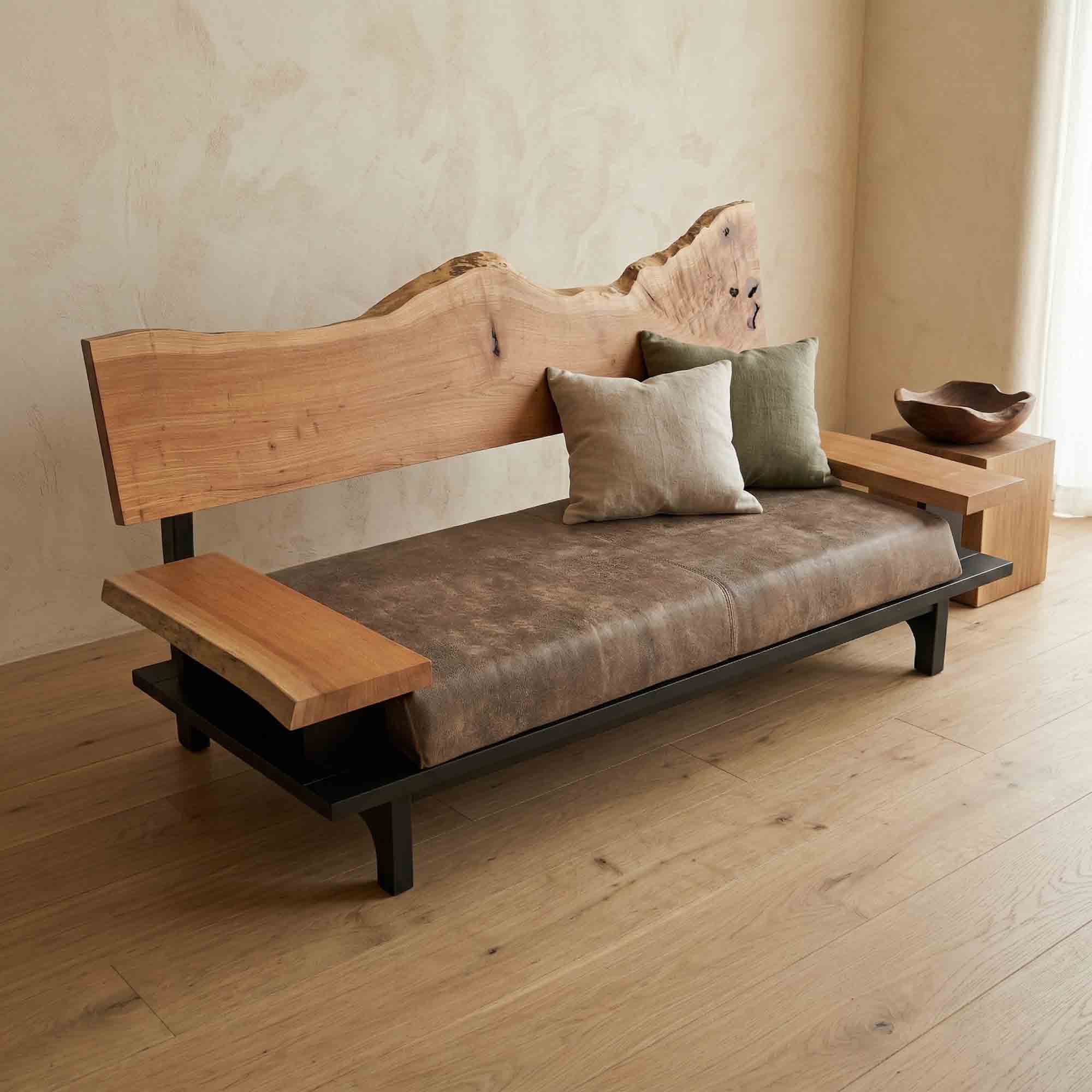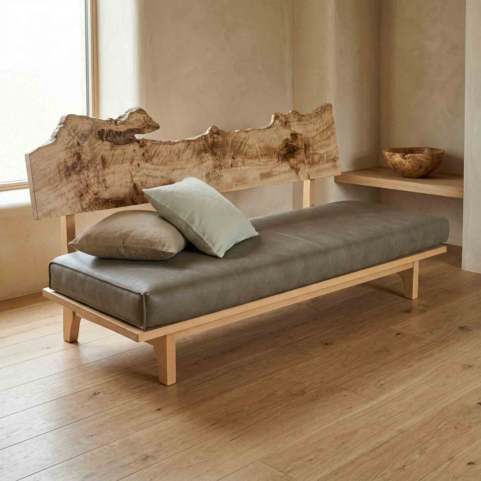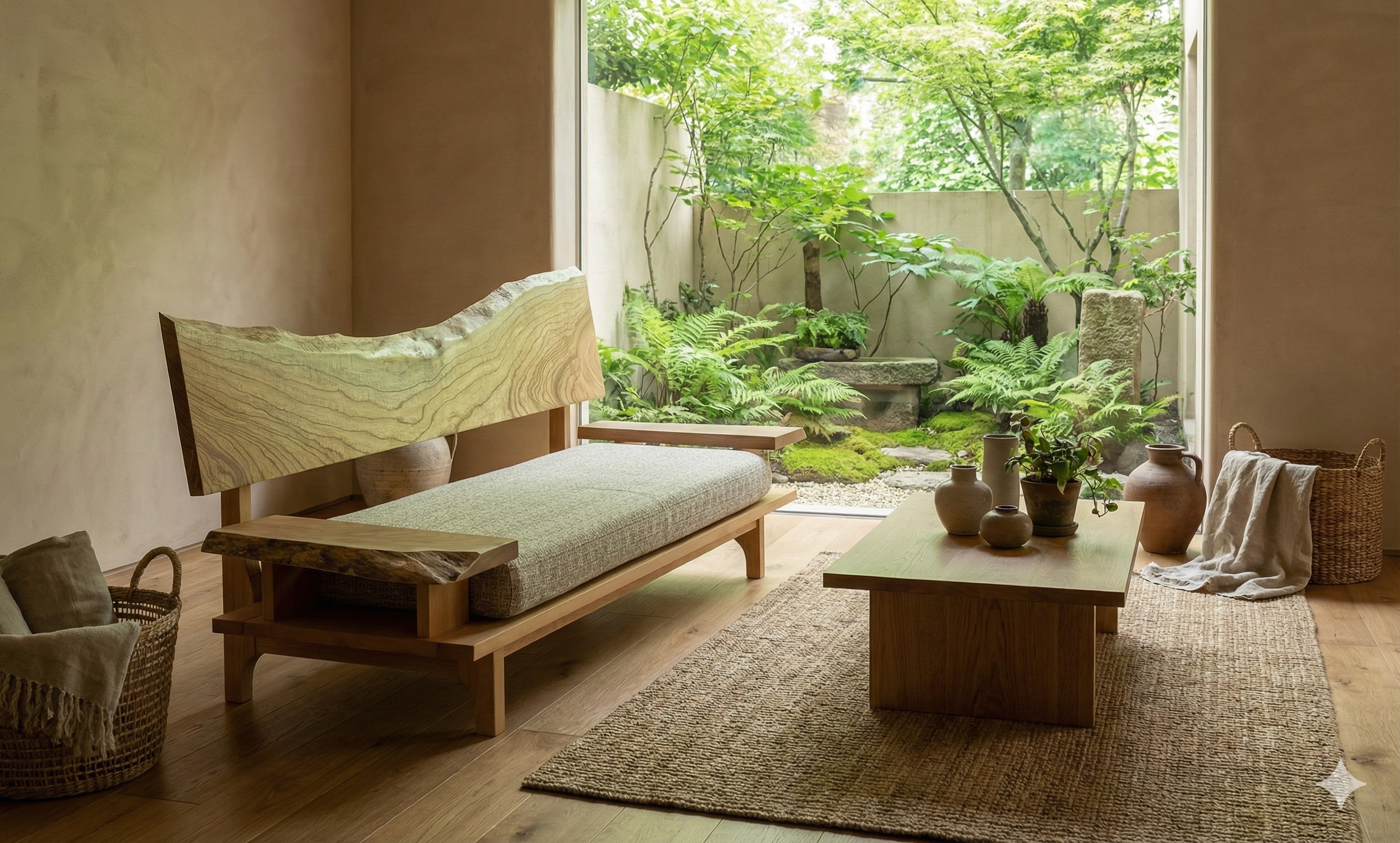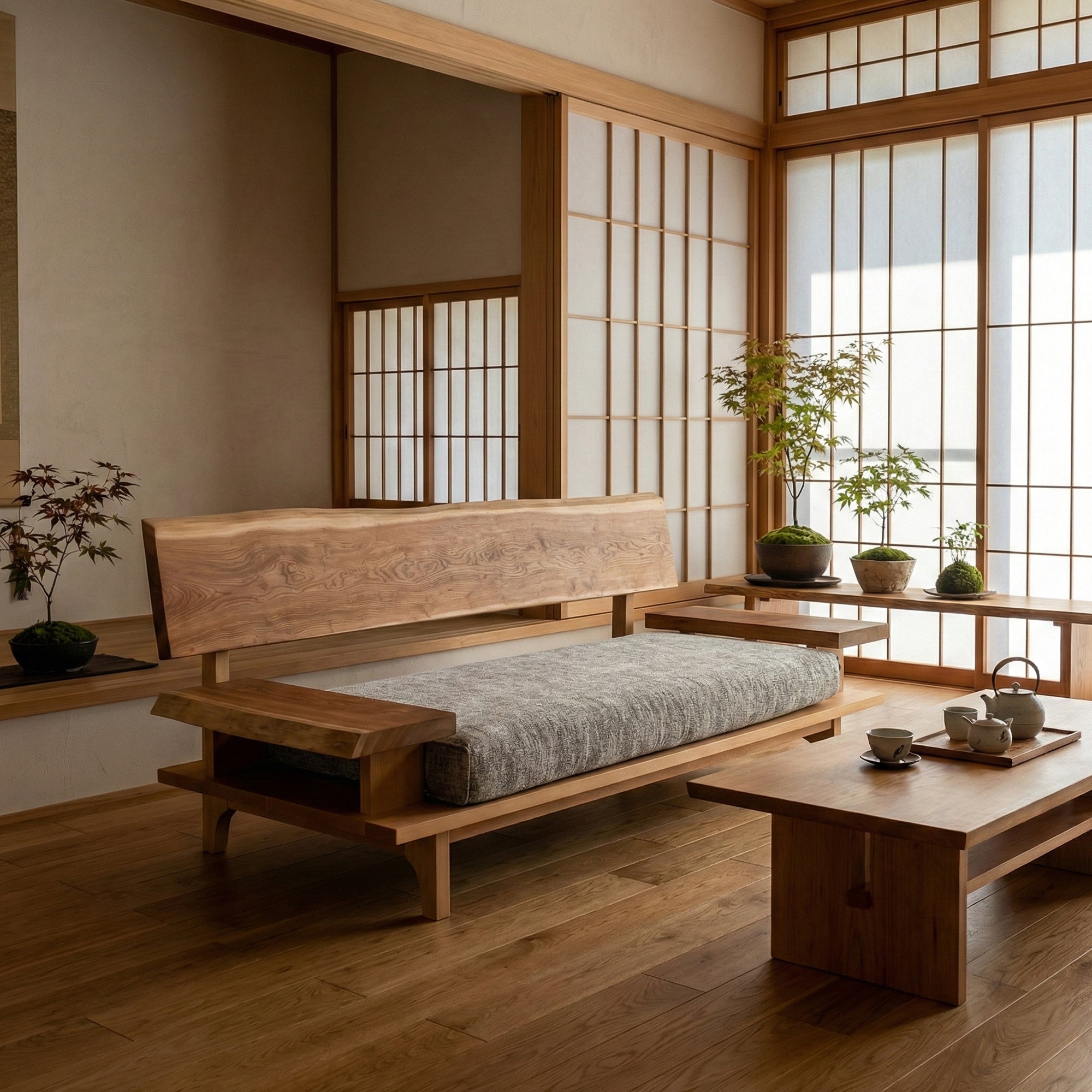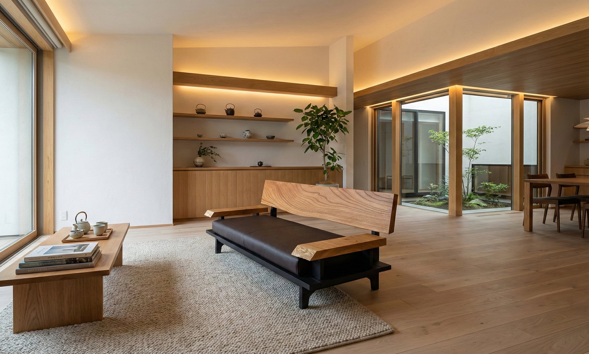 リビング空間の重心となる一枚板を、ソファやラグ、照明と組み合わせたコーディネート事例をご紹介します。天板の存在感を受け止める脚の形状や、ソファとの高さ・奥行きの関係が、くつろぎの質を大きく左右します。掲載しているのはすべて一点ものの一枚板による実例で、写真内のテーブルや周辺アイテムは実際にお選びいただけます。木の表情が空間に溶け込み、暮らしに静かな豊かさをもたらす様子をご覧ください。