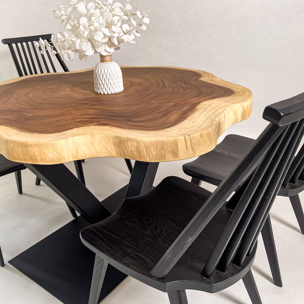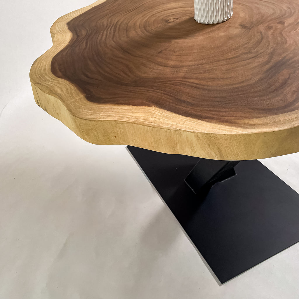 木材の中心部分の心材は濃いダーク色を持ち、耳・皮の部分となる辺材は白い色味が特徴的。綺麗ではっきりと異なるコントラストが美しいモンキーポッド。一枚板の最大の特徴である躍動感も強く感じることができ、お部屋のアクセントとしても活躍する一枚板です。