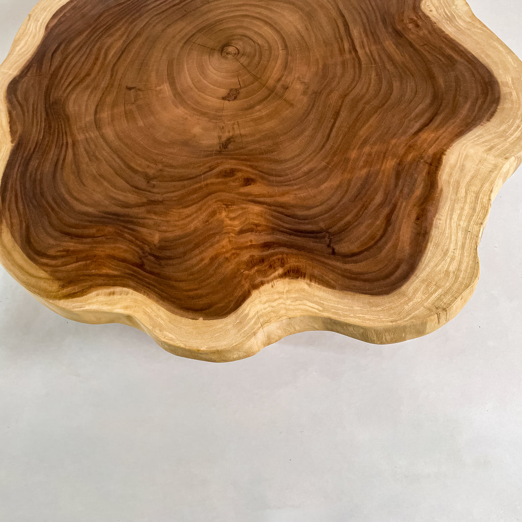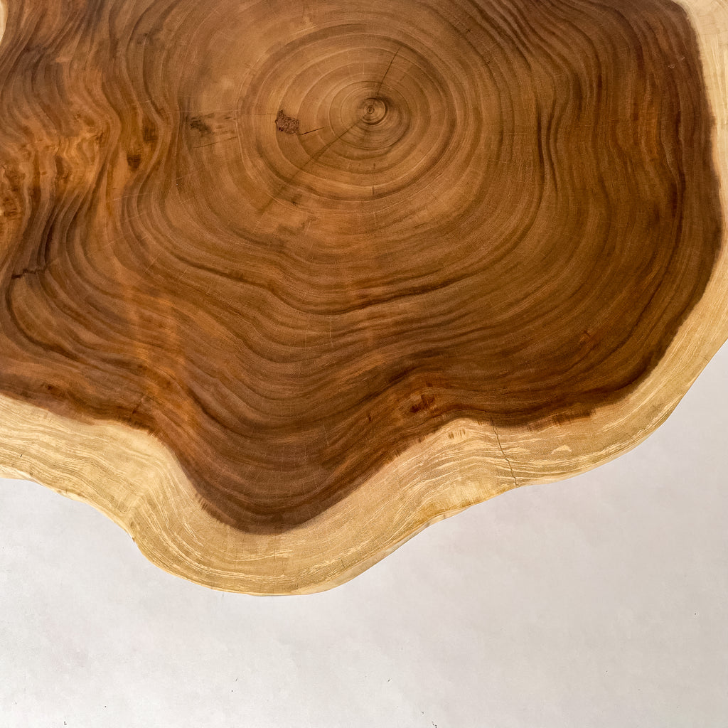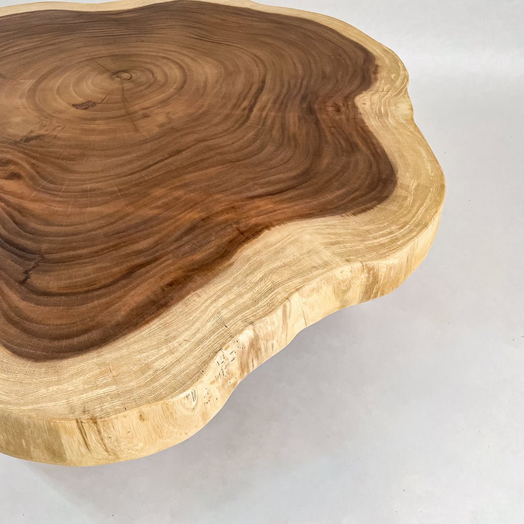 深いこげ茶から淡い黄金色へと移ろう木肌。モンキーポッドが熱帯の陽光と雨を受けながらゆっくりと育った証です。自然の曲線を活かした職人の手仕事が、樹の息づかいをそのままに残しています。