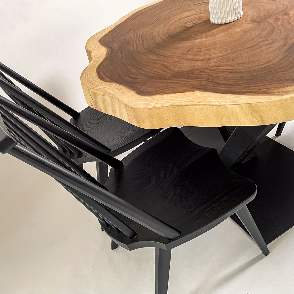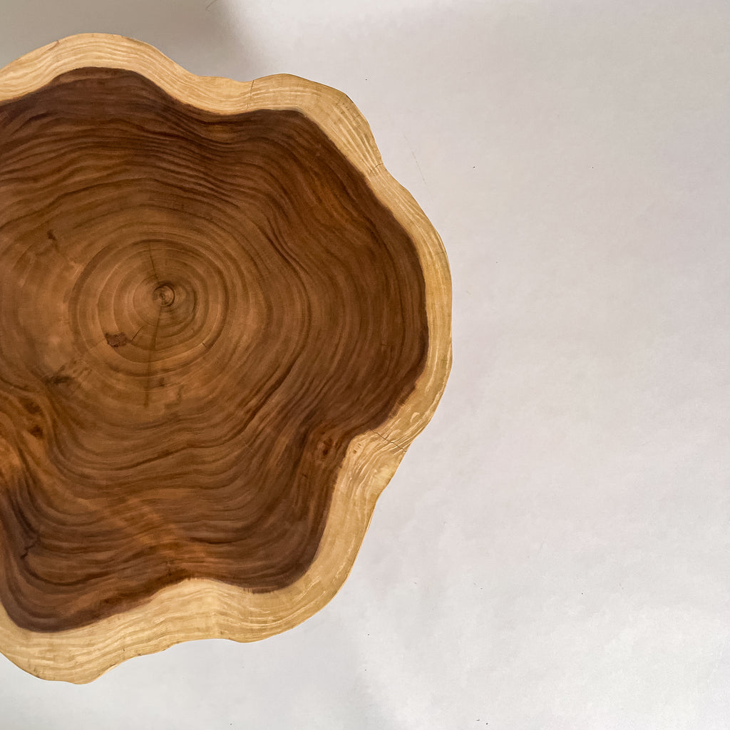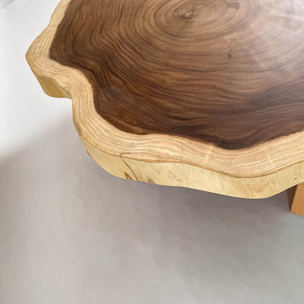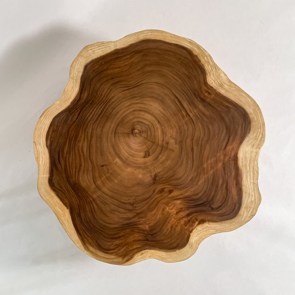 深いこげ茶から淡い黄金色へと移ろう木肌。モンキーポッドが熱帯の陽光と雨を受けながらゆっくりと育った証です。自然の曲線を活かした職人の手仕事が、樹の息づかいをそのままに残しています。