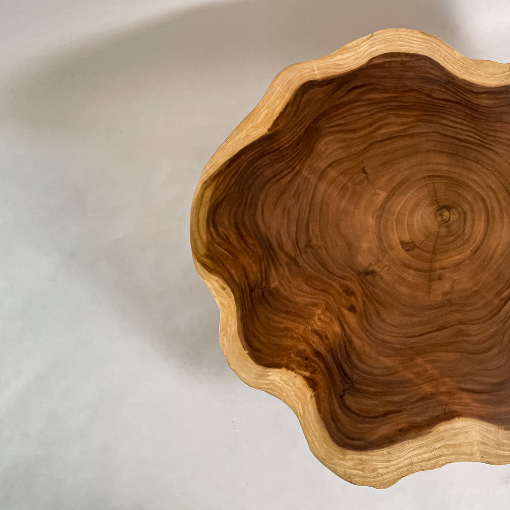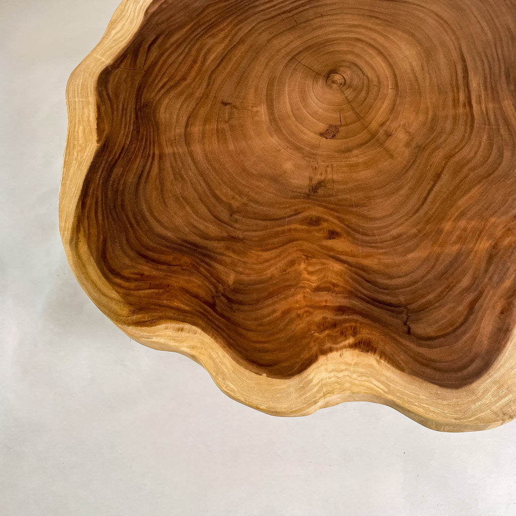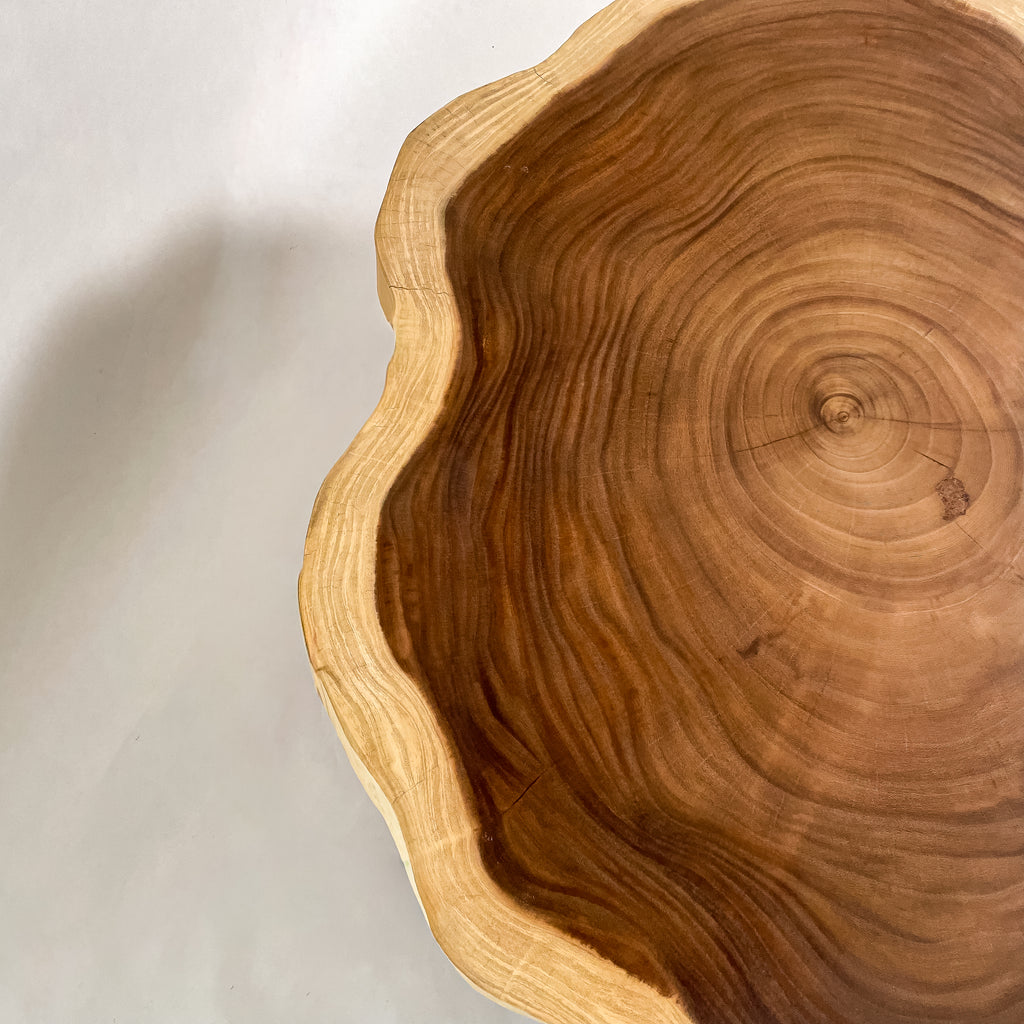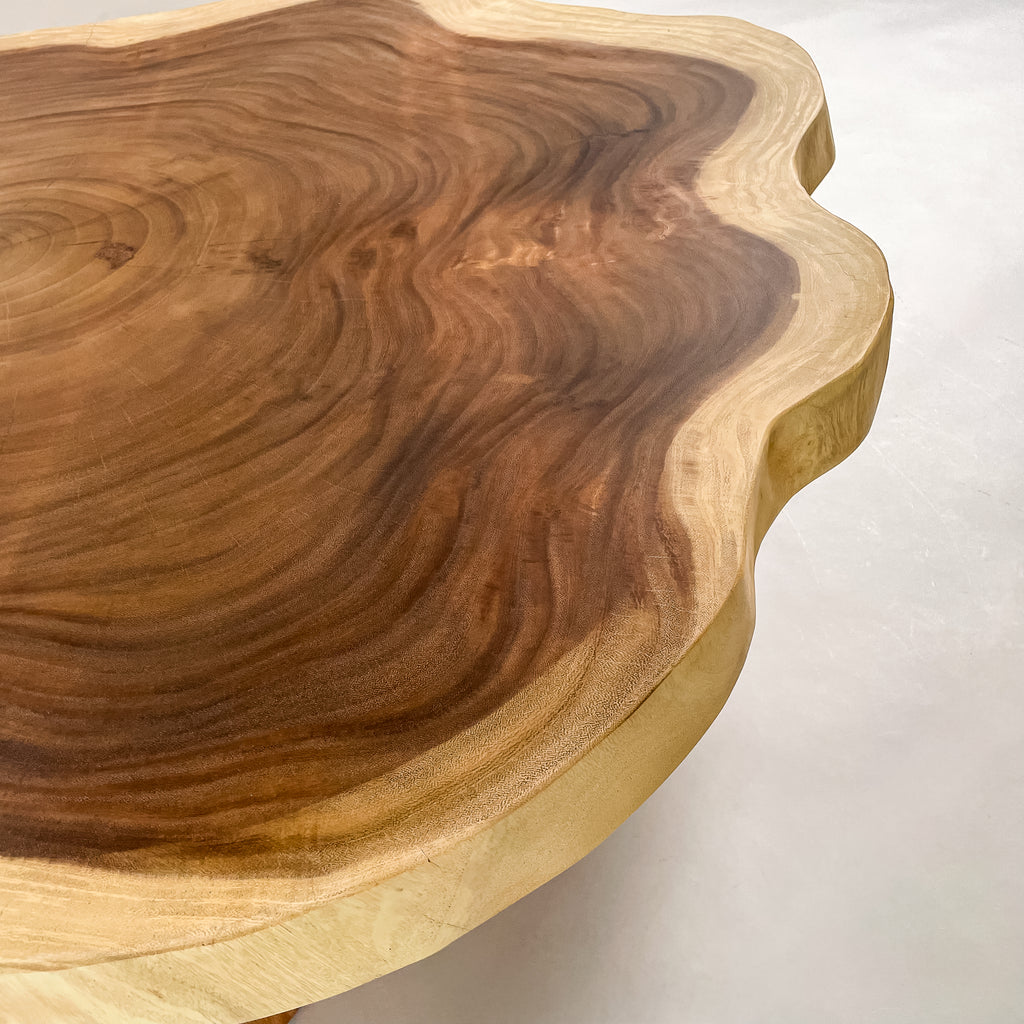 深いこげ茶から淡い黄金色へと移ろう木肌。モンキーポッドが熱帯の陽光と雨を受けながらゆっくりと育った証です。自然の曲線を活かした職人の手仕事が、樹の息づかいをそのままに残しています。