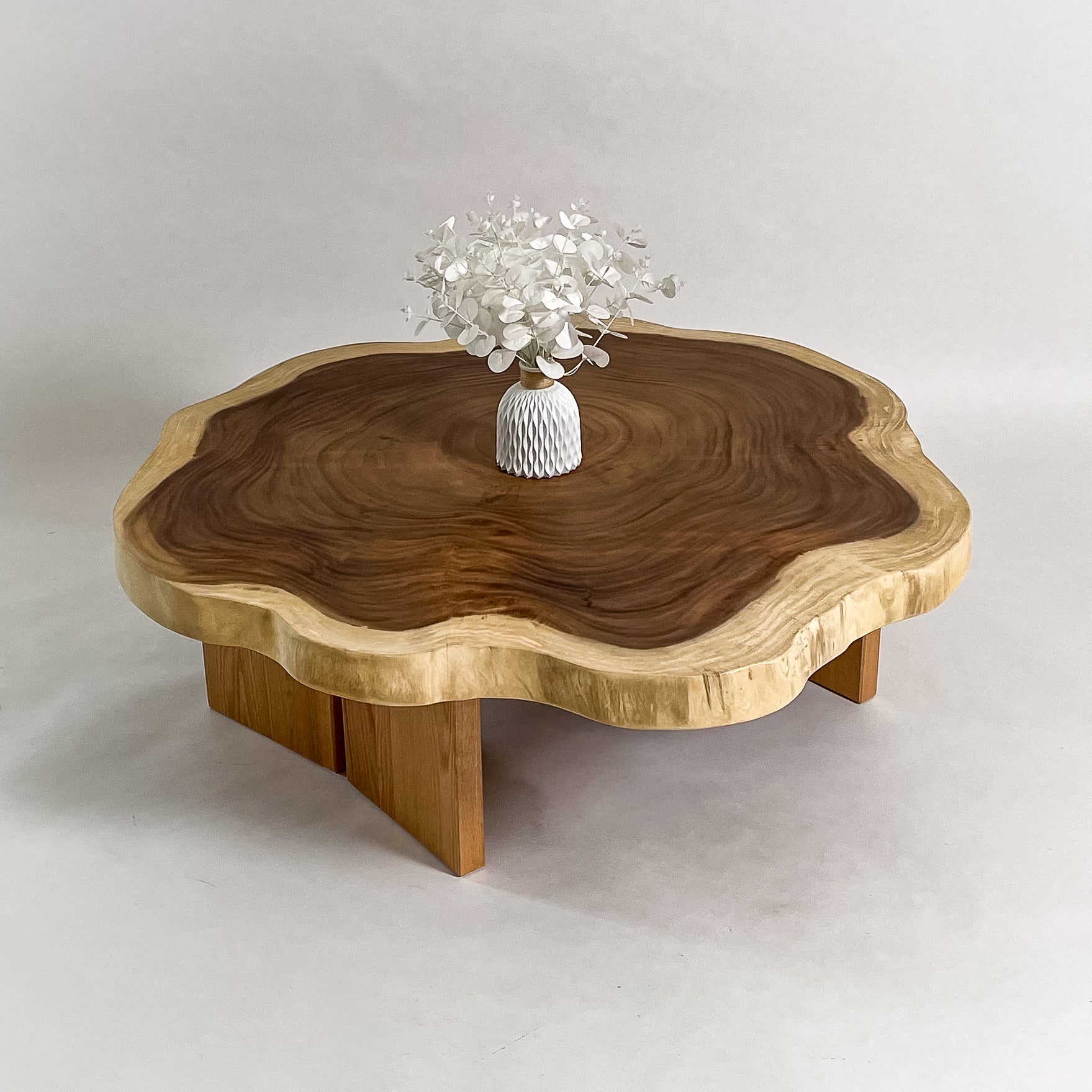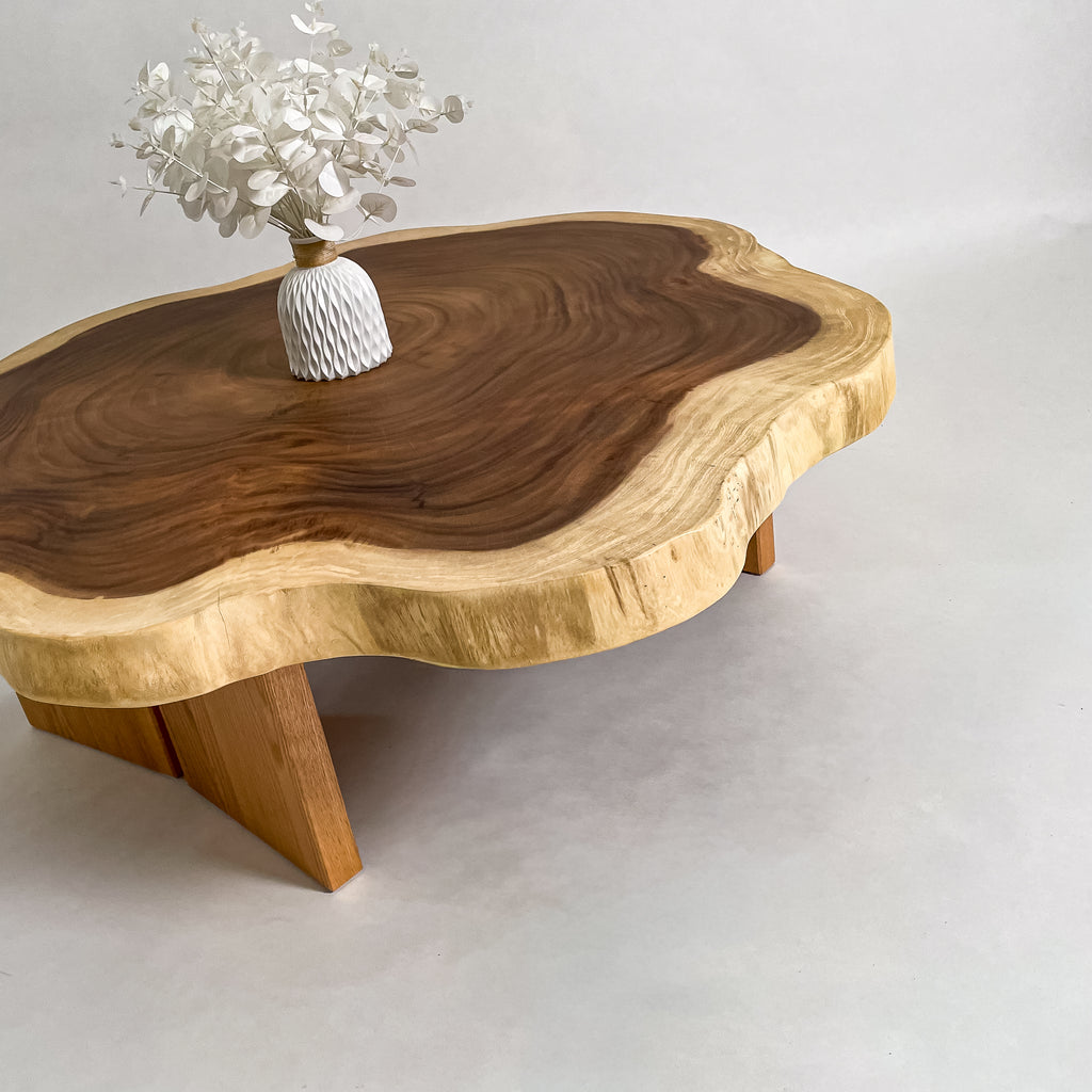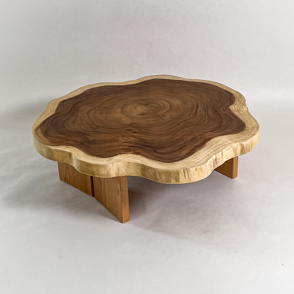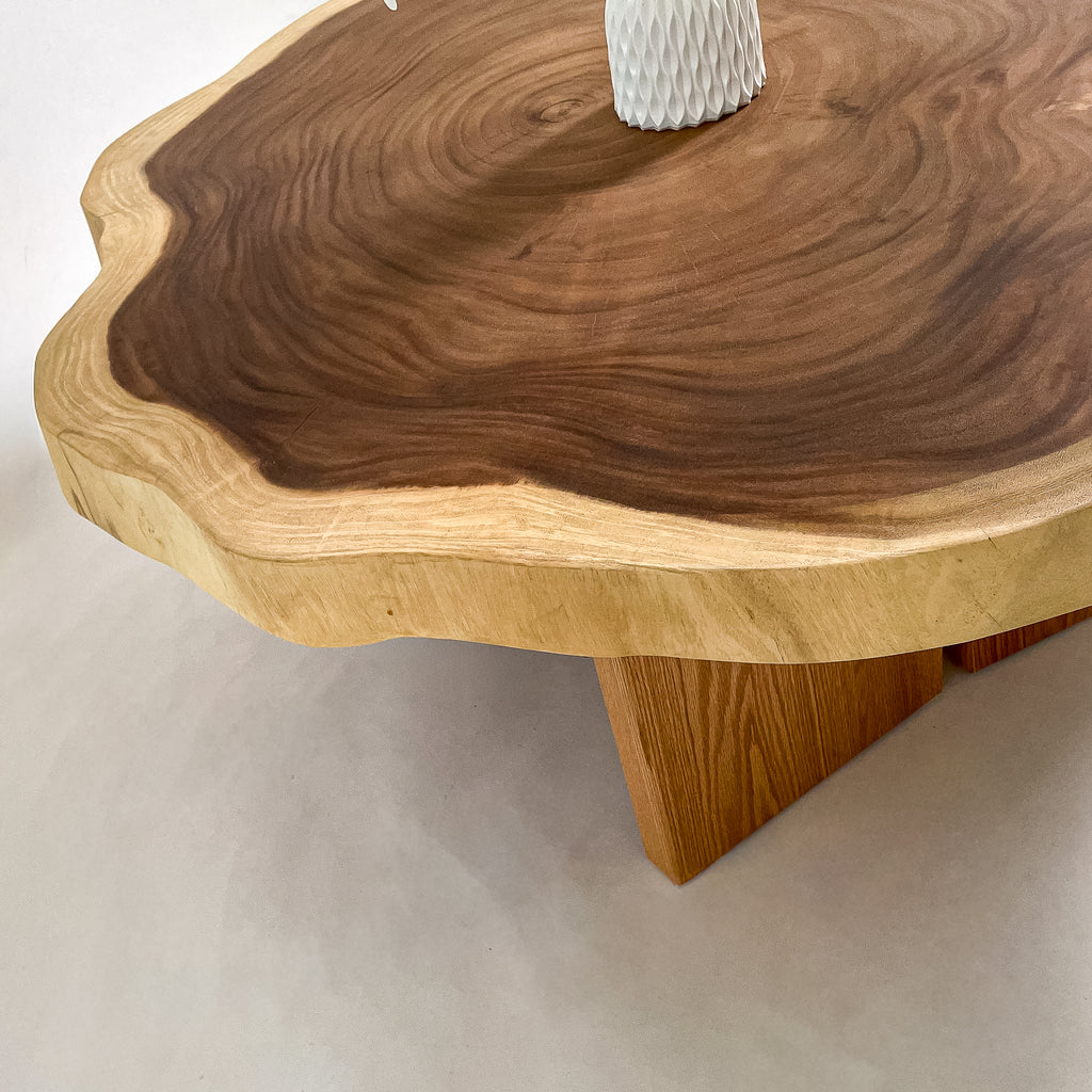 深いこげ茶から淡い黄金色へと移ろう木肌。モンキーポッドが熱帯の陽光と雨を受けながらゆっくりと育った証です。自然の曲線を活かした職人の手仕事が、樹の息づかいをそのままに残しています。