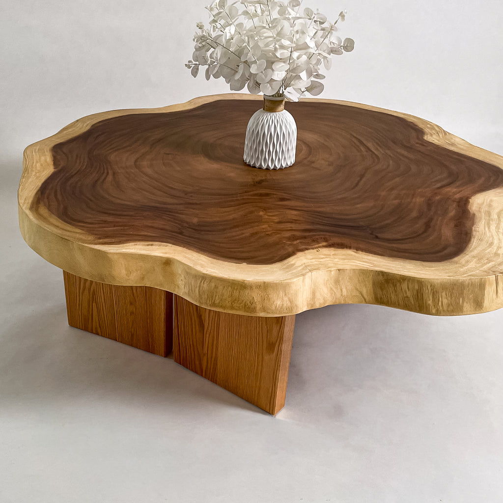 木材の中心部分の心材は濃いダーク色を持ち、耳・皮の部分となる辺材は白い色味が特徴的。綺麗ではっきりと異なるコントラストが美しいモンキーポッド。一枚板の最大の特徴である躍動感も強く感じることができ、お部屋のアクセントとしても活躍する一枚板です。