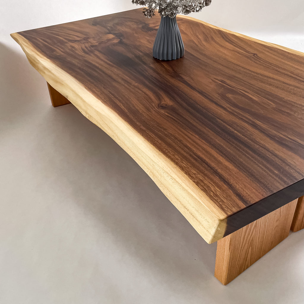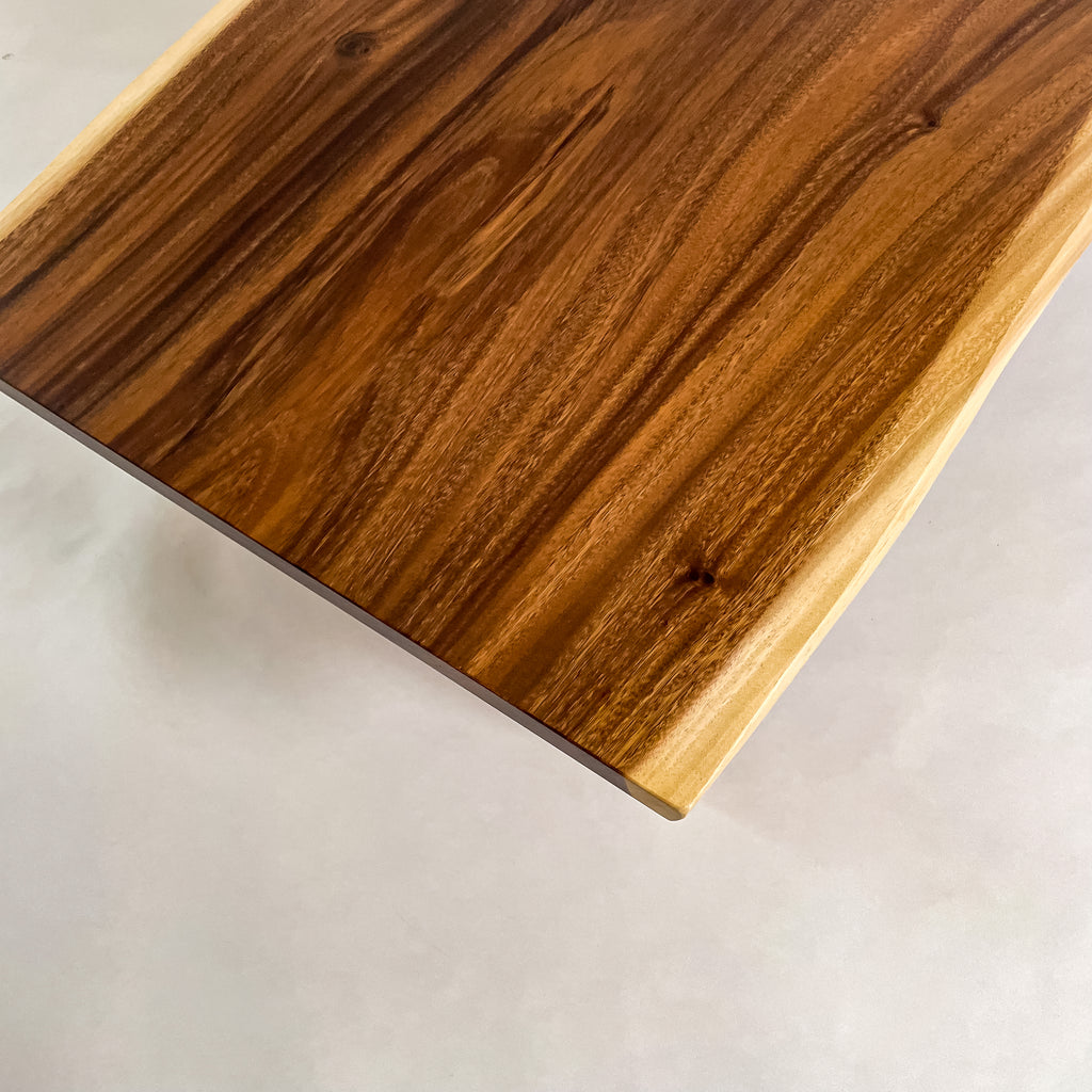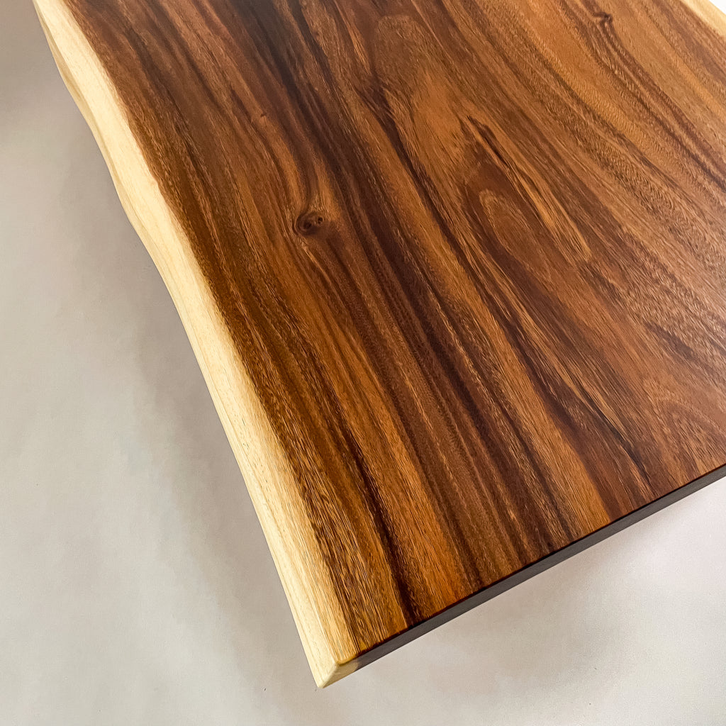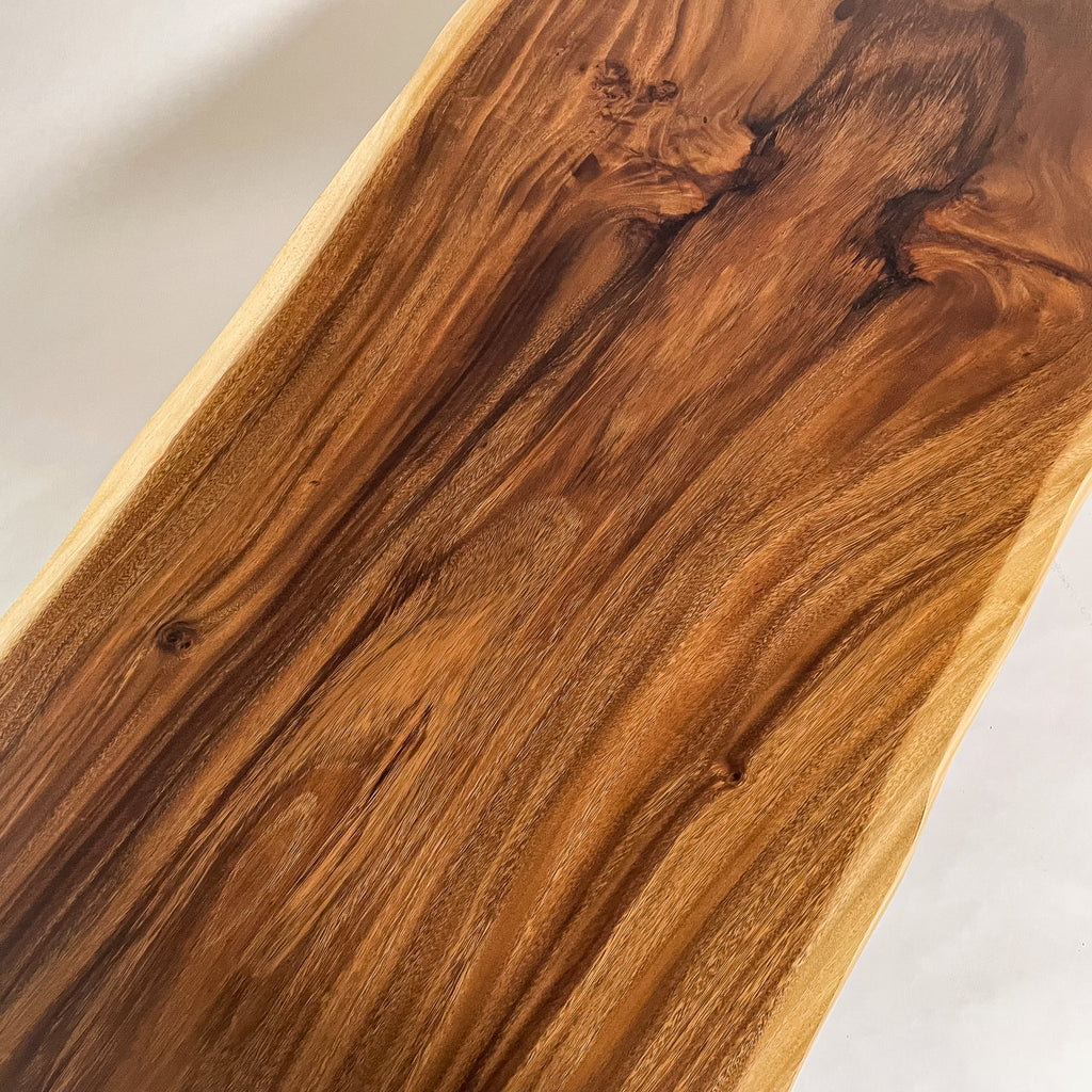 木材の中心部分の心材は濃いダーク色を持ち、耳・皮の部分となる辺材は白い色味が特徴的。綺麗ではっきりと異なるコントラストが美しいモンキーポッド。一枚板の最大の特徴である躍動感も強く感じることができ、お部屋のアクセントとしても活躍する一枚板です。
