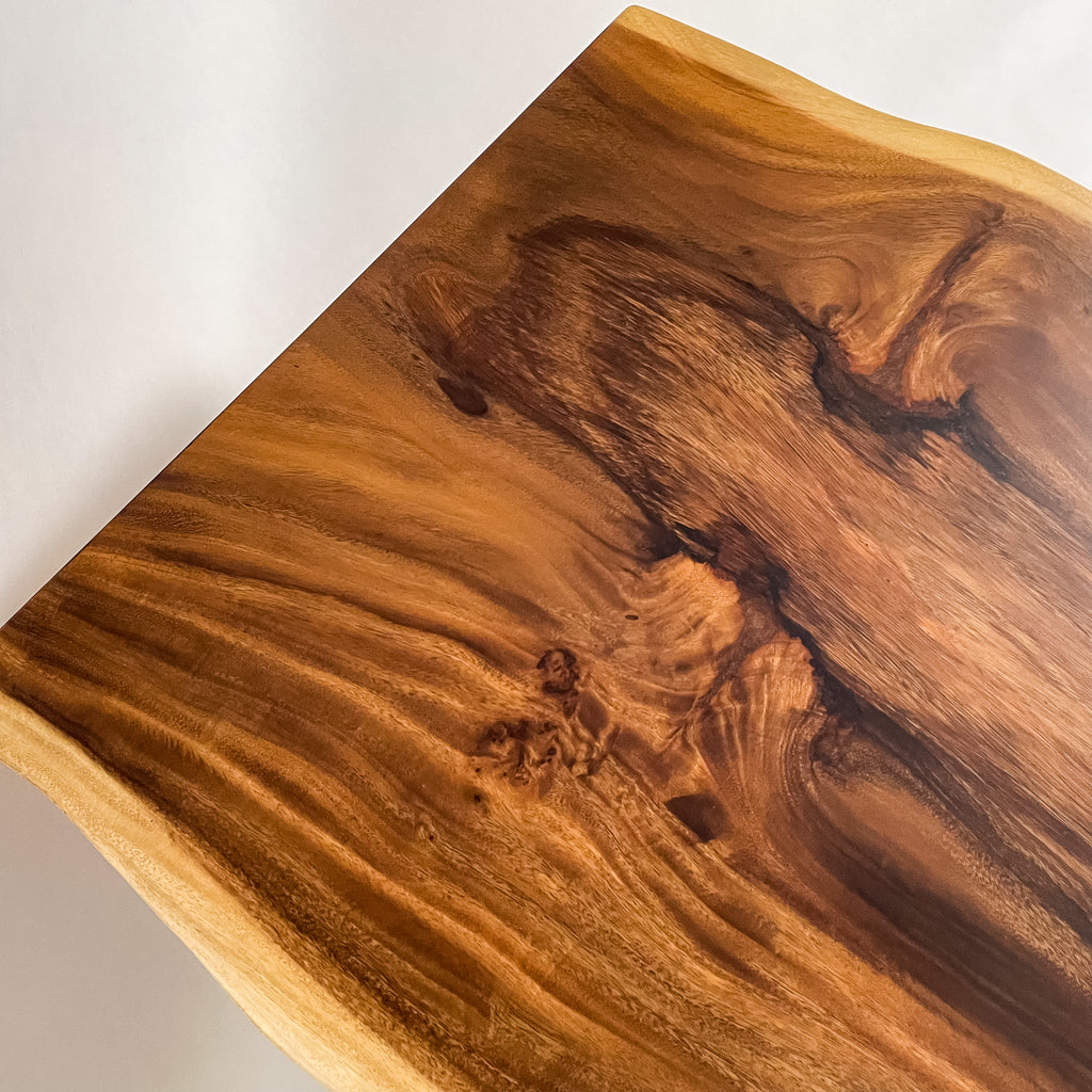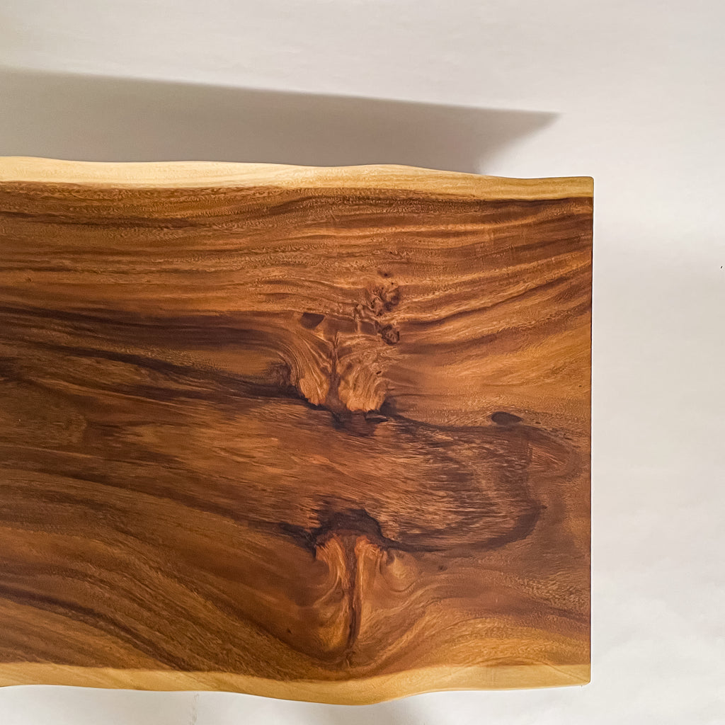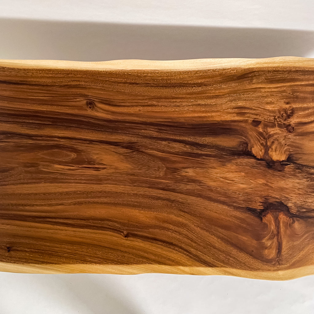 熱帯の森で陽と雨を浴び、ゆるやかに育ったモンキーポッド。深い焦茶と淡いベージュの境は、まるで夕暮れの地平線。木の記憶をそのままに、職人が自然の曲線を生かして磨き上げた一枚。静けさの中に宿る力強さ。