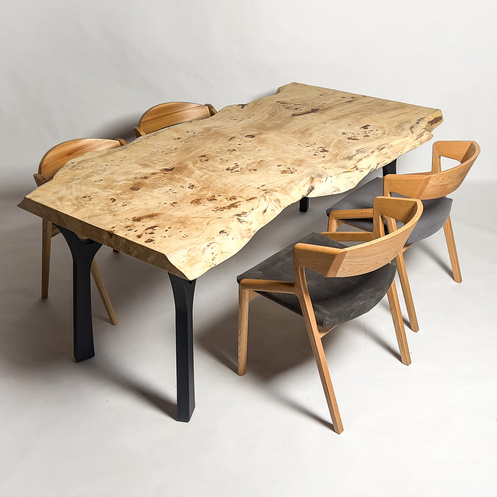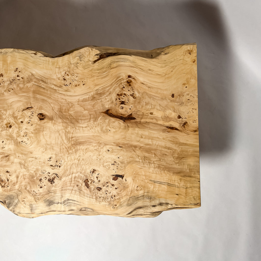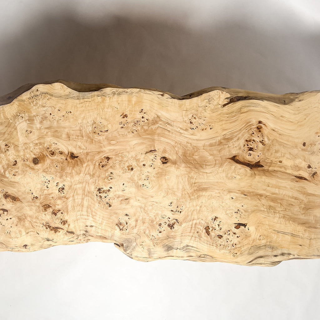 高級感漂う瘤杢(こぶもく)を持ち、荒々しく躍動的な形も魅力的なポプラ。立体感と光沢感ある杢目と雰囲気が魅力的でお部屋を上質で高級な印象に。白く煌びやかに輝き、一際異彩を放つ一枚板。