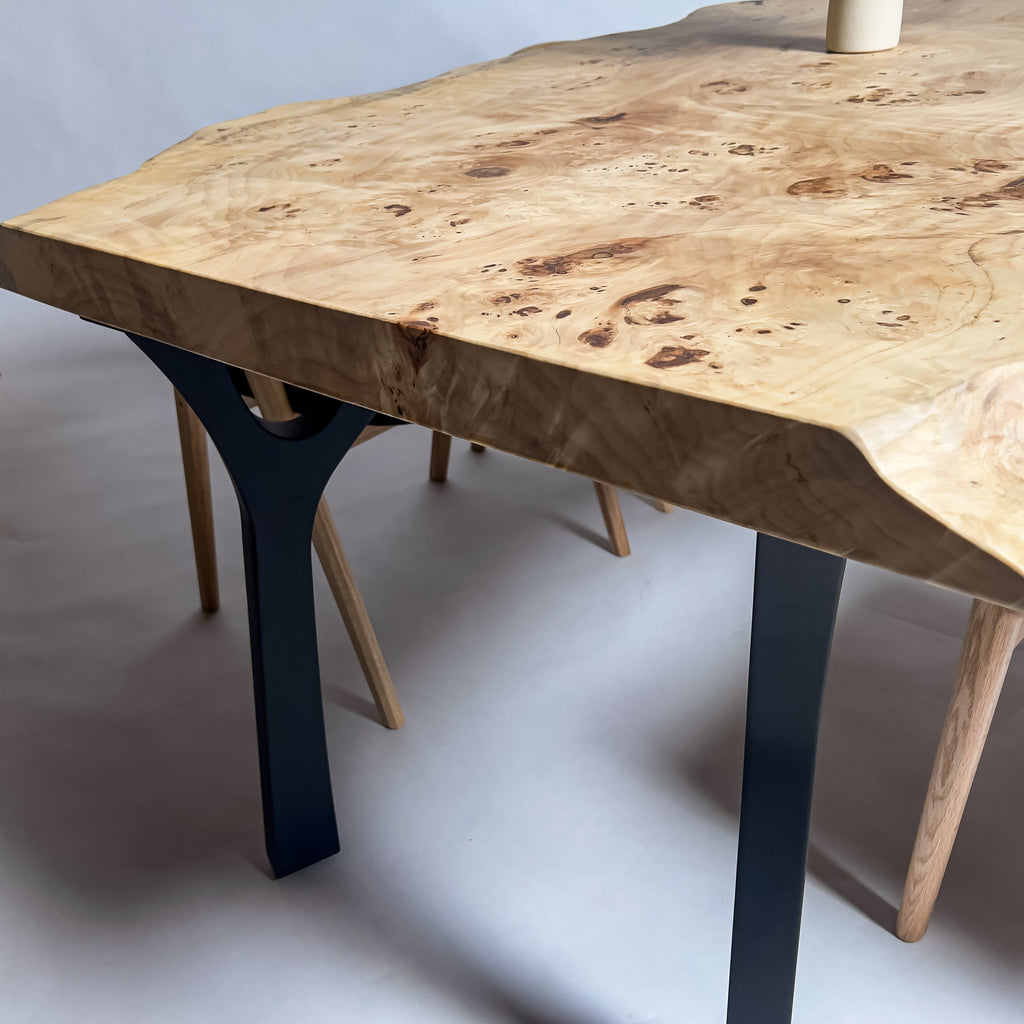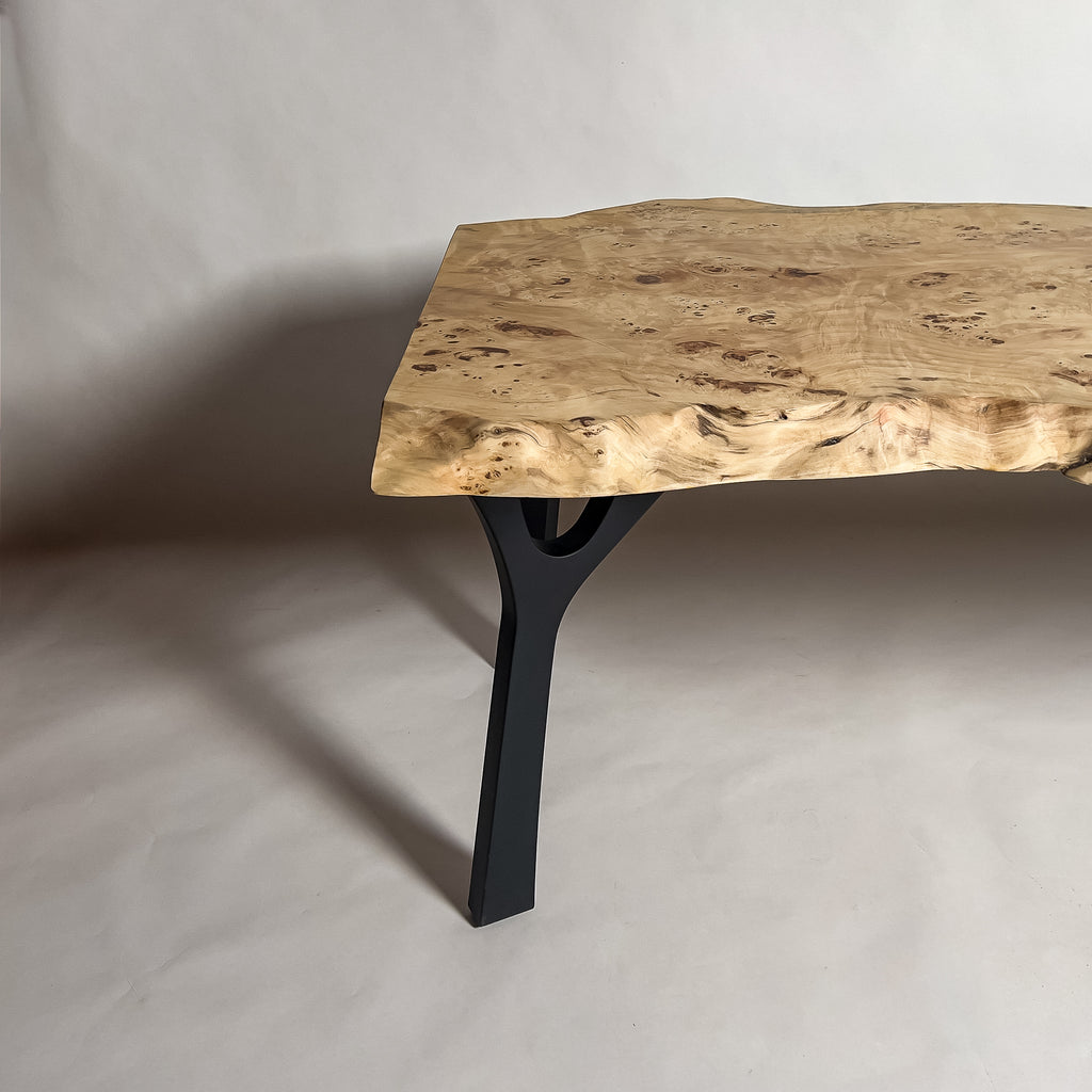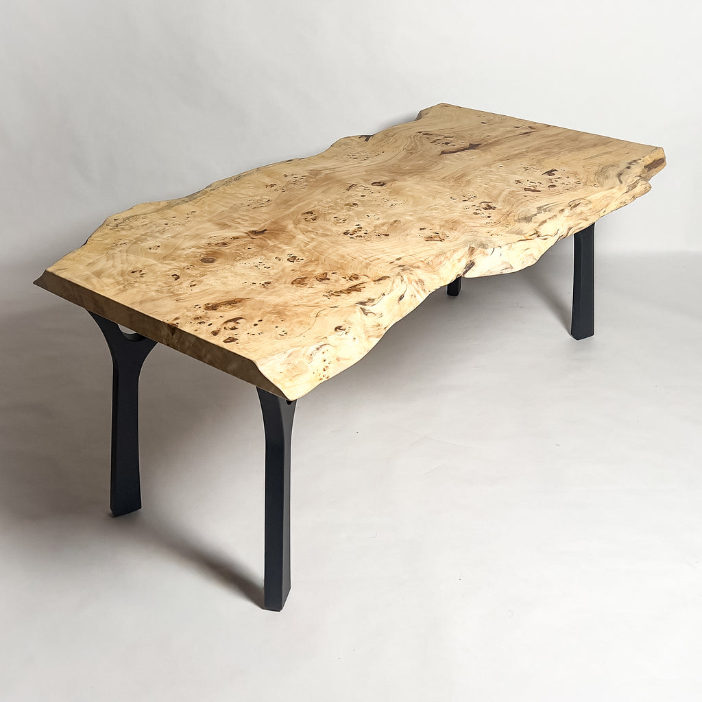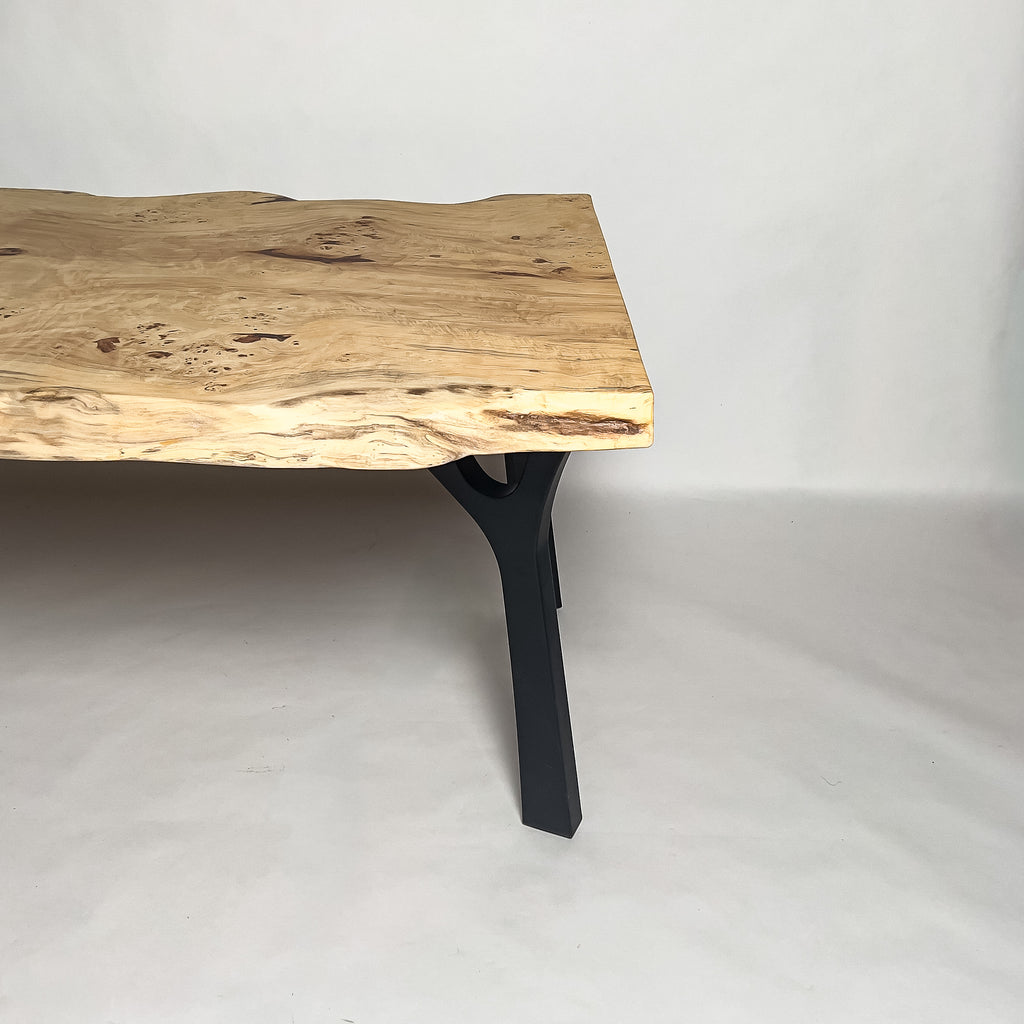 高級感漂う瘤杢(こぶもく)を持ち、荒々しく躍動的な形も魅力的なポプラ。立体感と光沢感ある杢目と雰囲気が魅力的でお部屋を上質で高級な印象に。白く煌びやかに輝き、一際異彩を放つ一枚板。