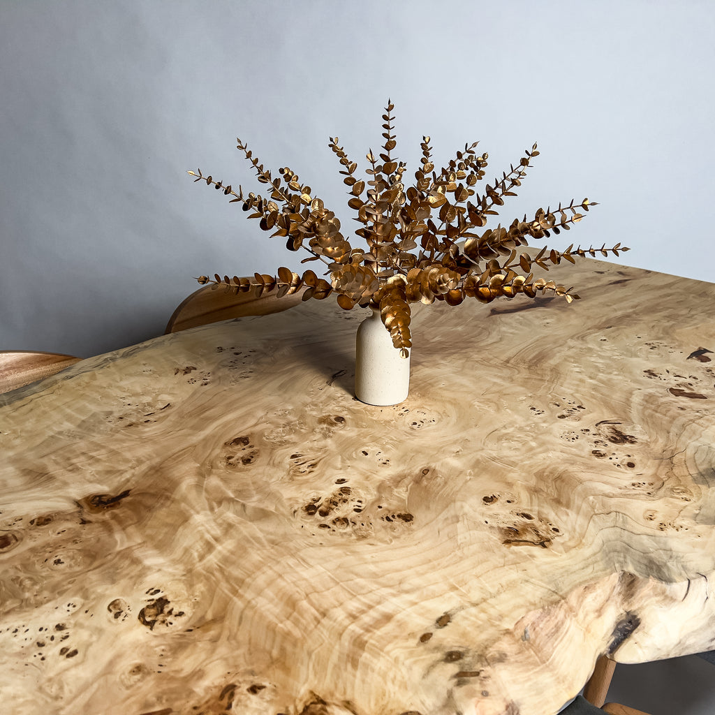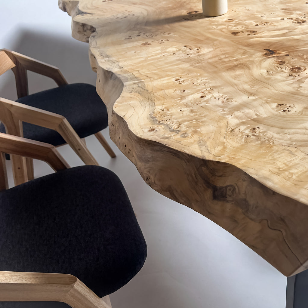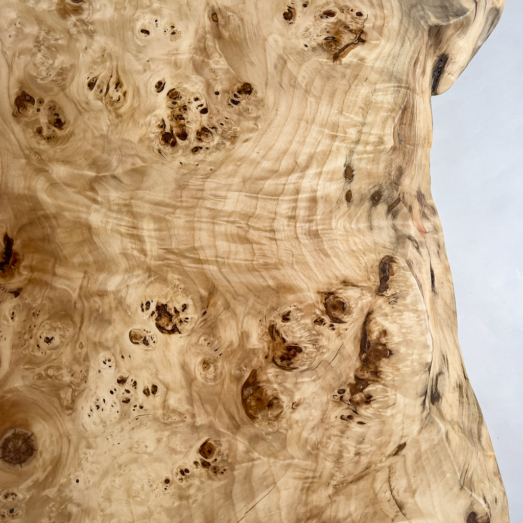 ポプラ特有の瘤杢が立体的に浮かび上がり、風雨に育まれた模様が淡い木肌に広がります。自然の曲線を上品に残した仕上げが柔らかな景色をつくり、毎日の食卓に穏やかなぬくもりを添え、心地よい時間を育みます。