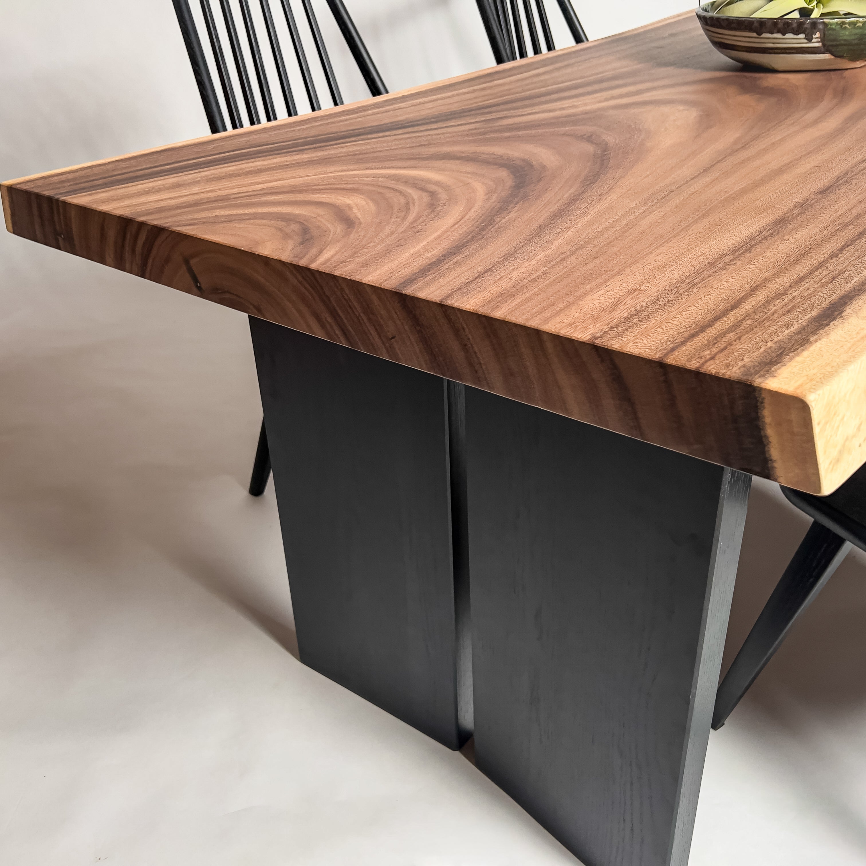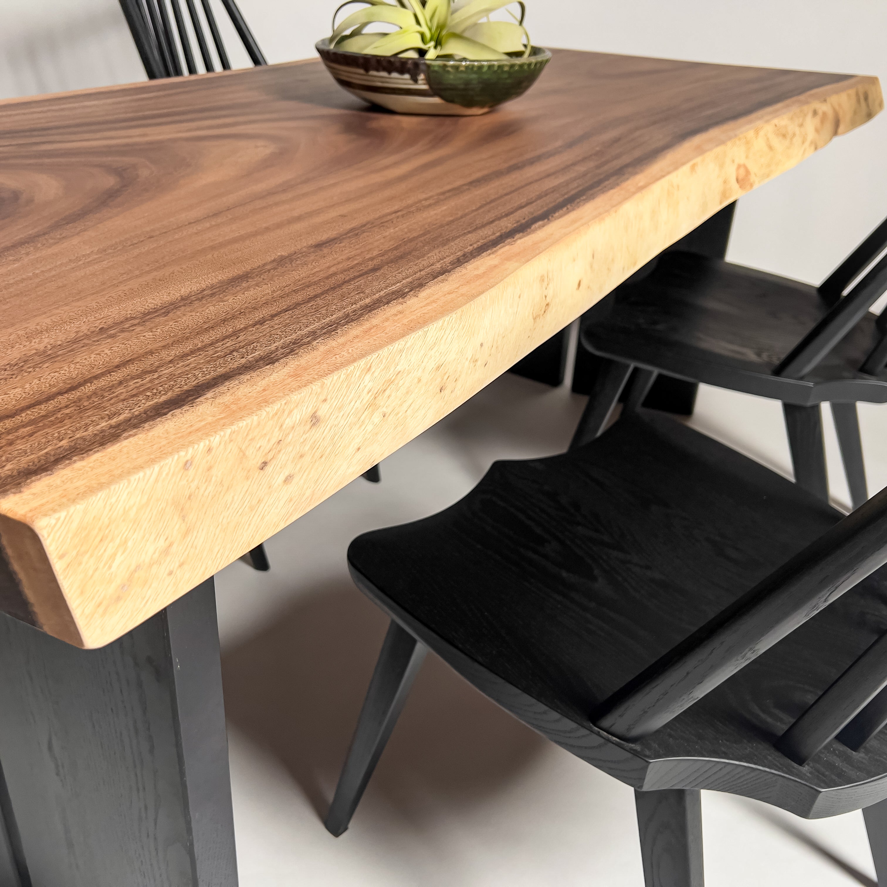 木材の中心部分の心材は濃いダーク色を持ち、耳・皮の部分となる辺材は白い色味が特徴的。綺麗ではっきりと異なるコントラストが美しいモンキーポッド。一枚板の最大の特徴である躍動感も強く感じることができ、お部屋のアクセントとしても活躍する一枚板です。