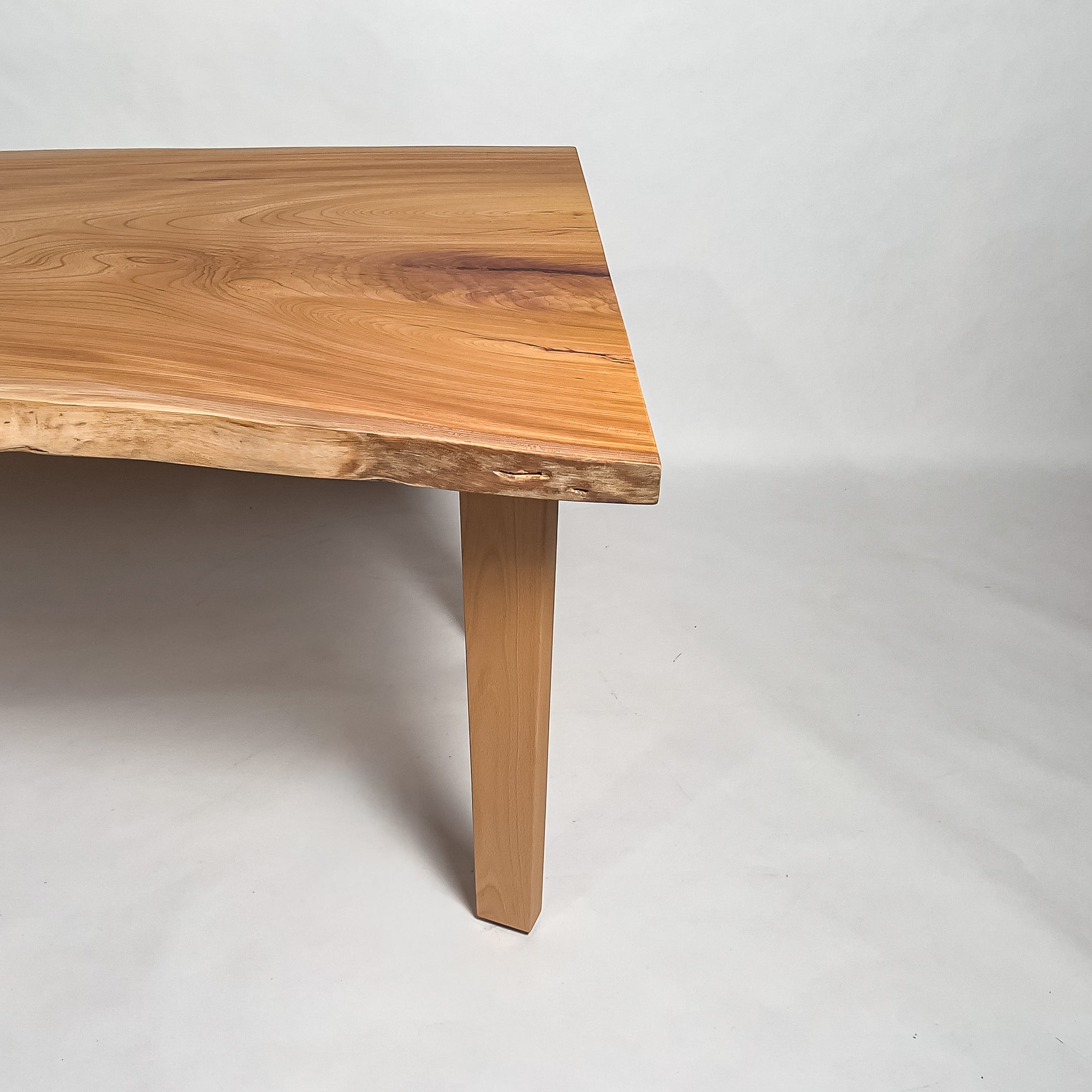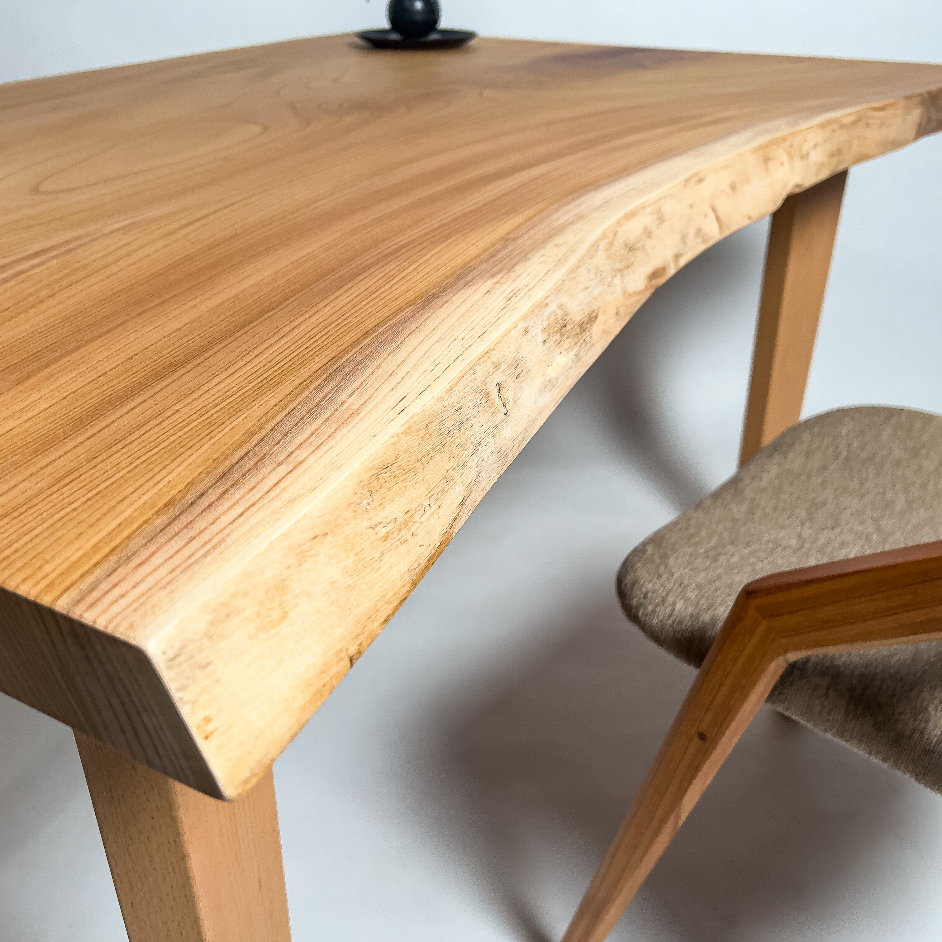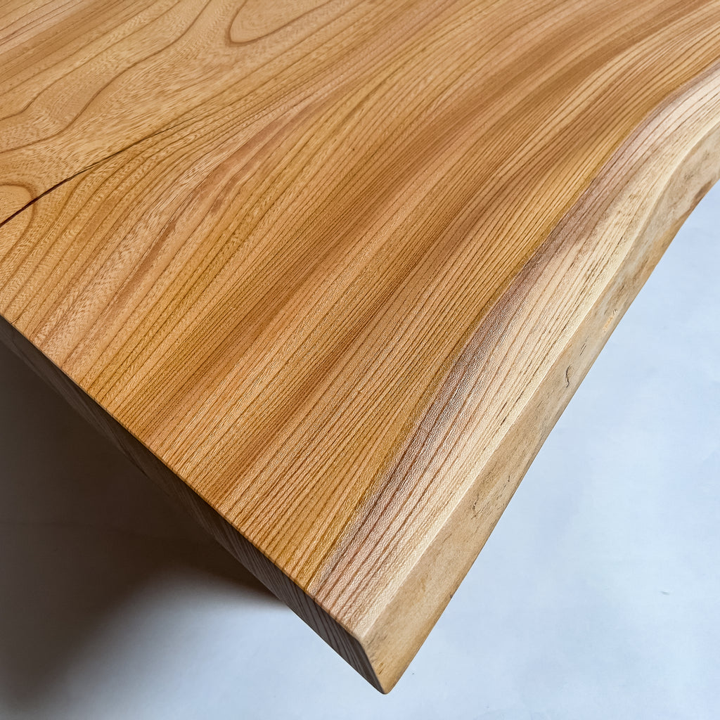 仕上がりの質感や印象にまで細やかに気を配り、使われる空間や暮らしを見据えた、やわらかな佇まいへと丁寧に仕上げる。 木が持つ節や皮、杢目の表情に寄り添い、その一つひとつを活かすことで、唯一無二の素材美を際立たせた一枚板づくりを行う。