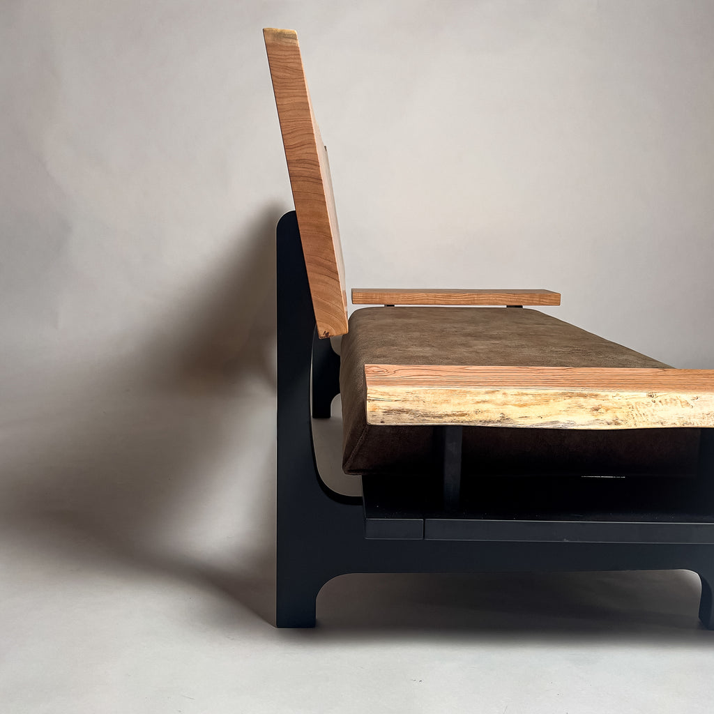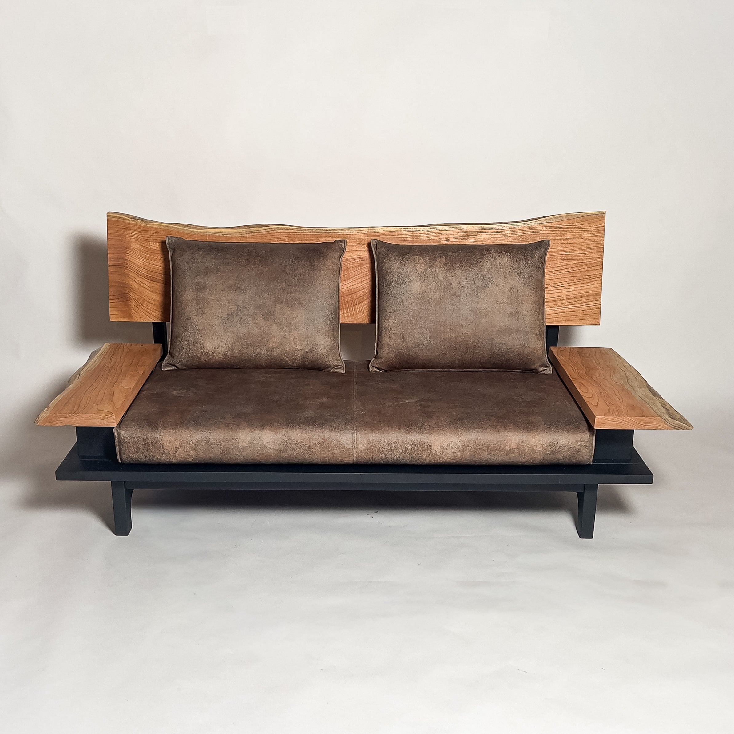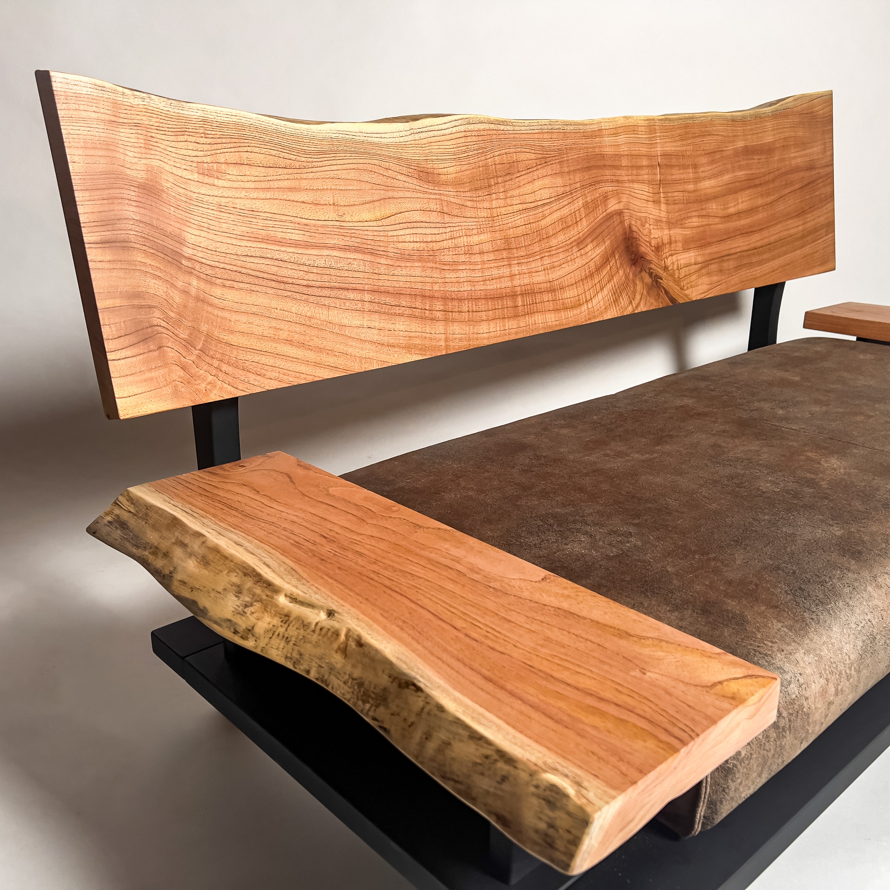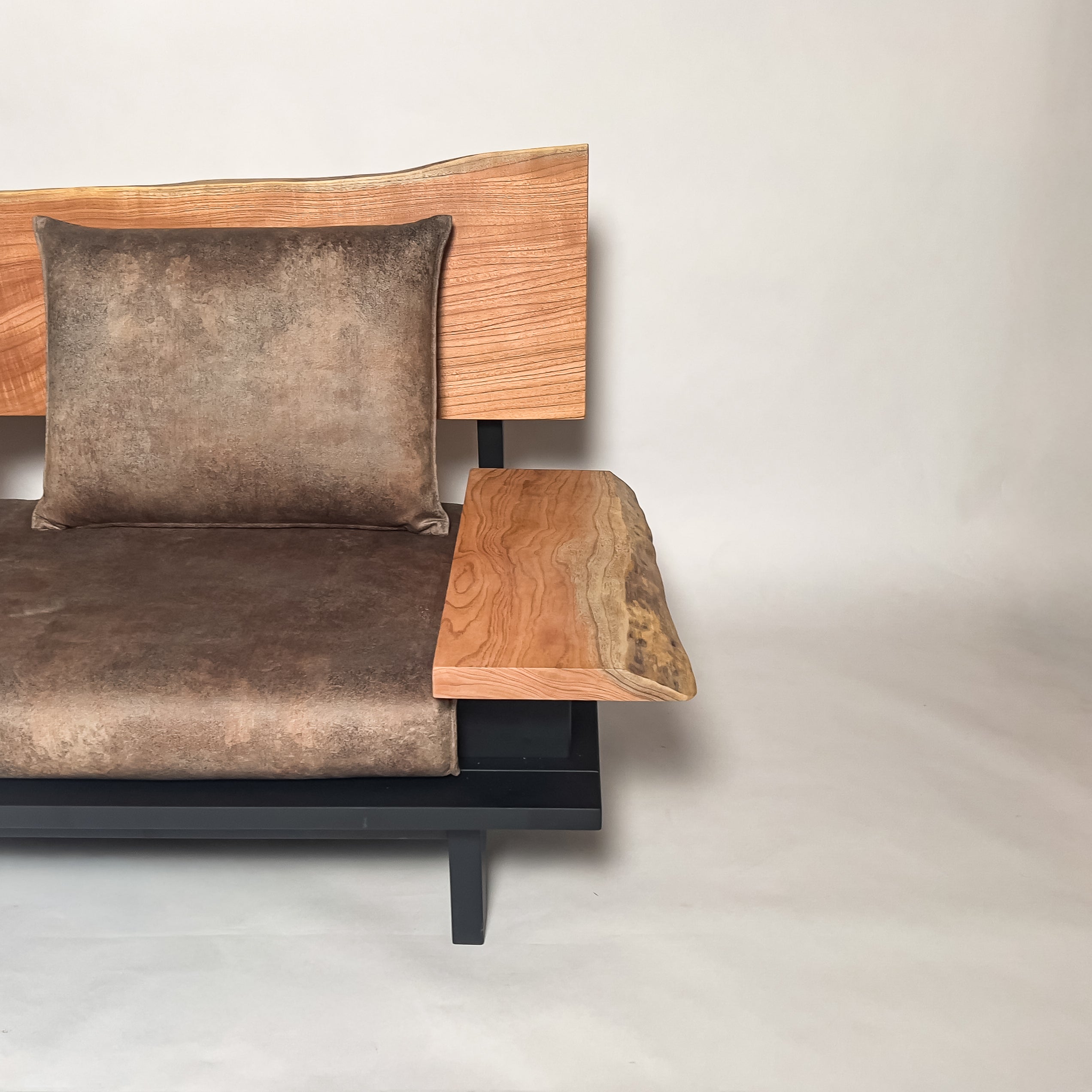 背もたれと肘置きにセンダンの一枚板を用いた高級ソファです。自然の形を活かした加工が木目の豊かさを際立たせ、木肌の温もりと職人の技が調和します。空間に心地よい落ち着きを添え、暮らしに寄り添う特別な存在です。