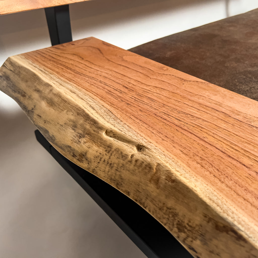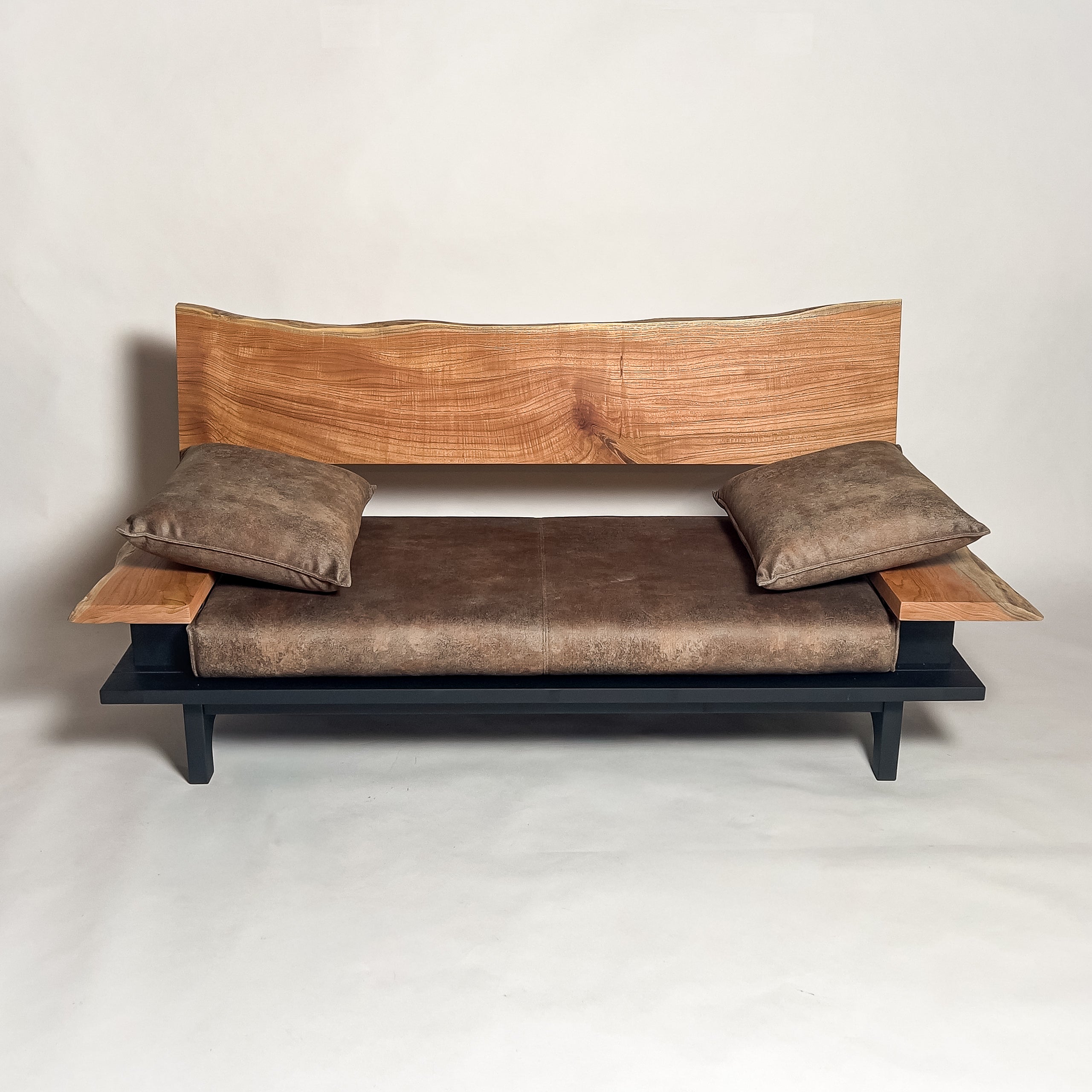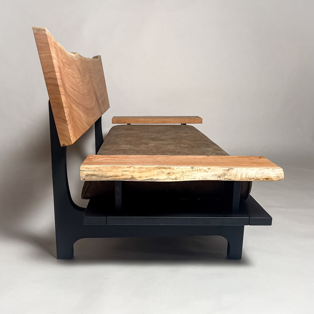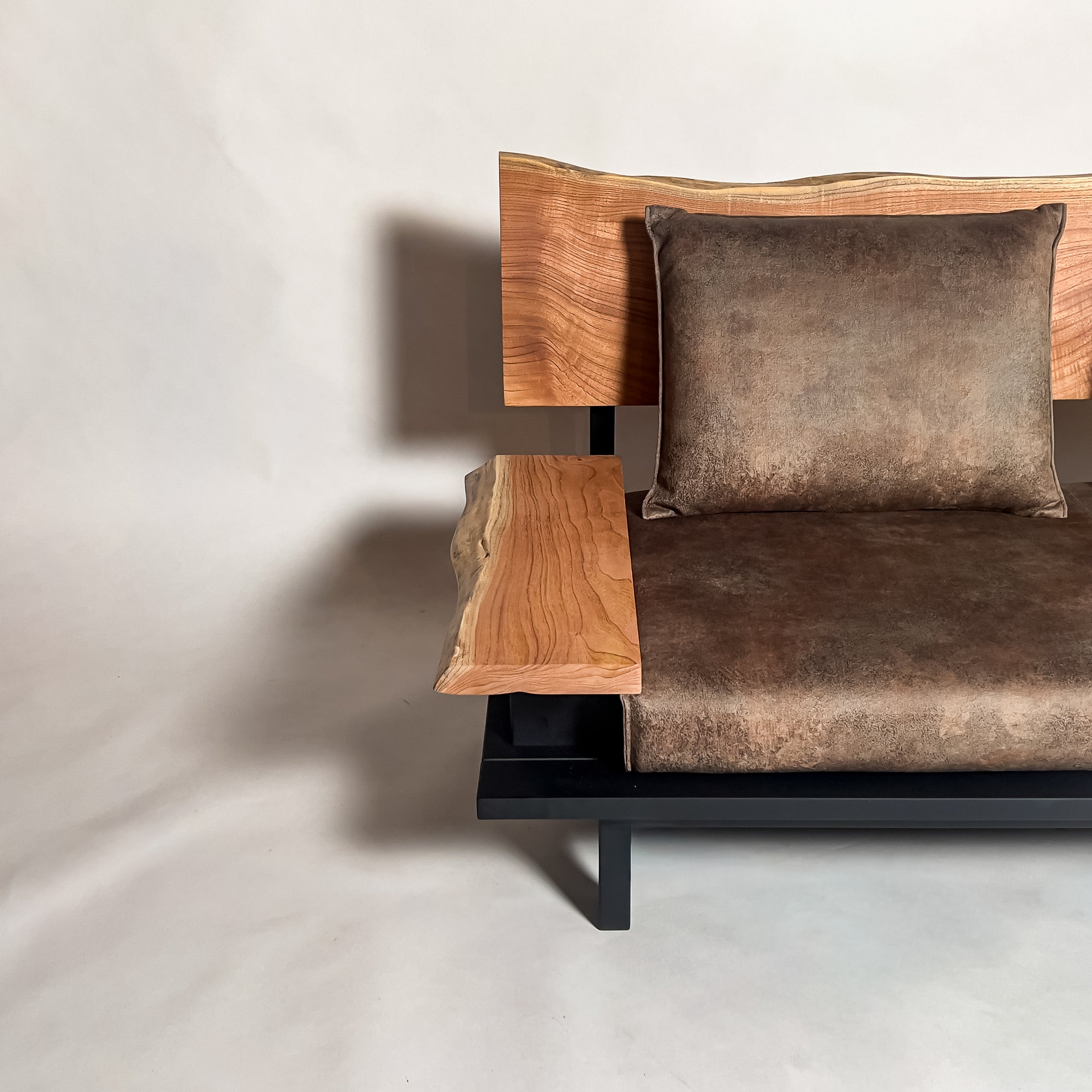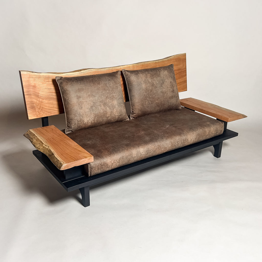 背もたれと肘置きにセンダンの一枚板を用いた高級ソファです。自然の形を活かした加工が木目の豊かさを際立たせ、木肌の温もりと職人の技が調和します。空間に心地よい落ち着きを添え、暮らしに寄り添う特別な存在です。