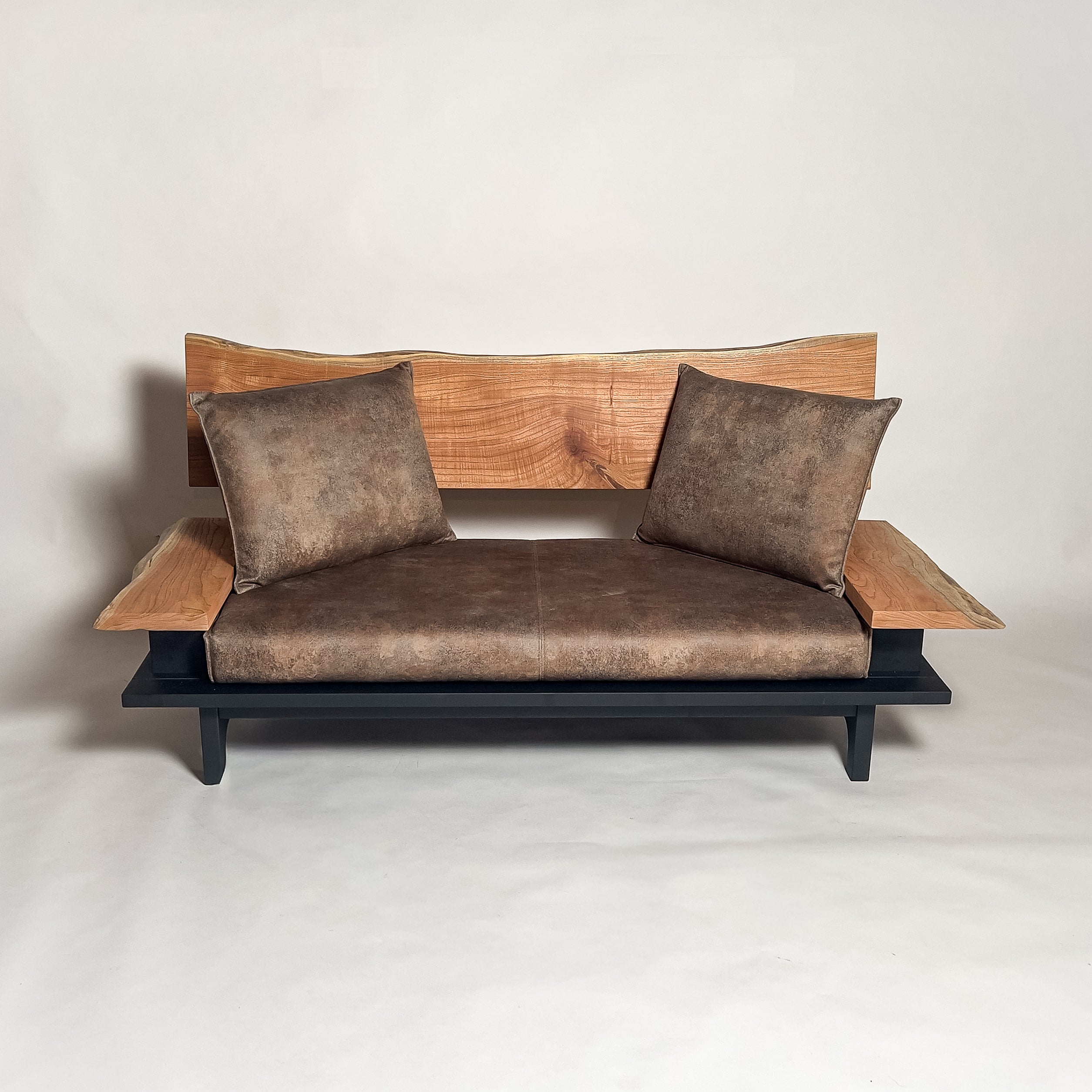 肘置き・背もたれに一枚板をあしらい、空間全体を洗練された雰囲気で包み込む2人掛けソファ。造形の美しさと素材感が空間を格調高く彩ります。さらに、緻密に設計されたクッションが身体をやさしく支え、長時間でも心地よく寛げる使いやすさを実現しました。