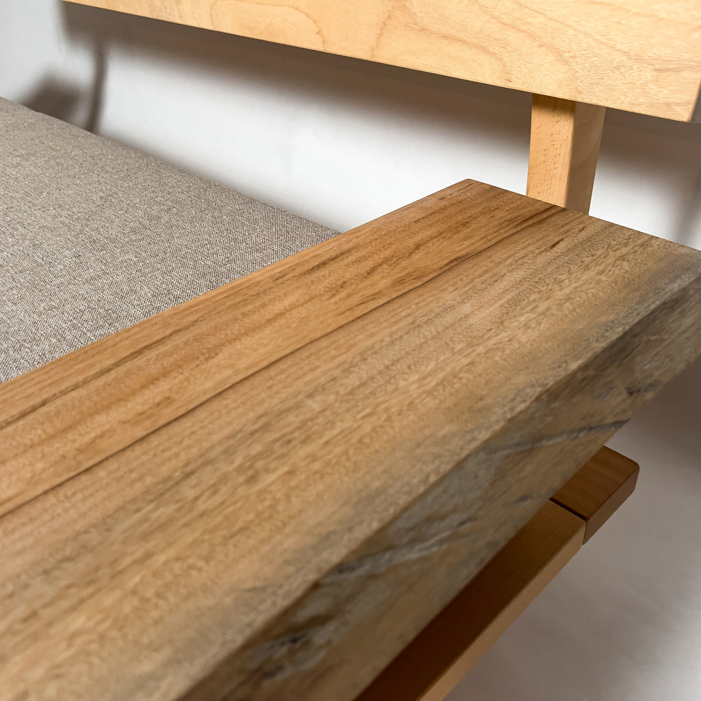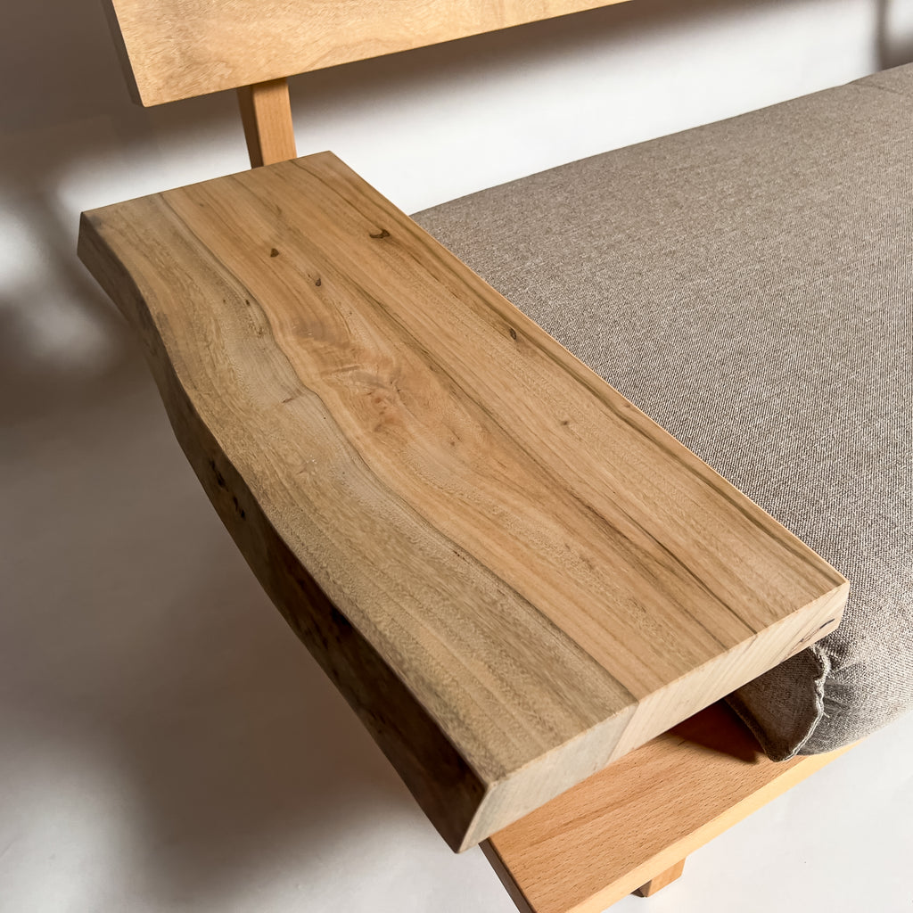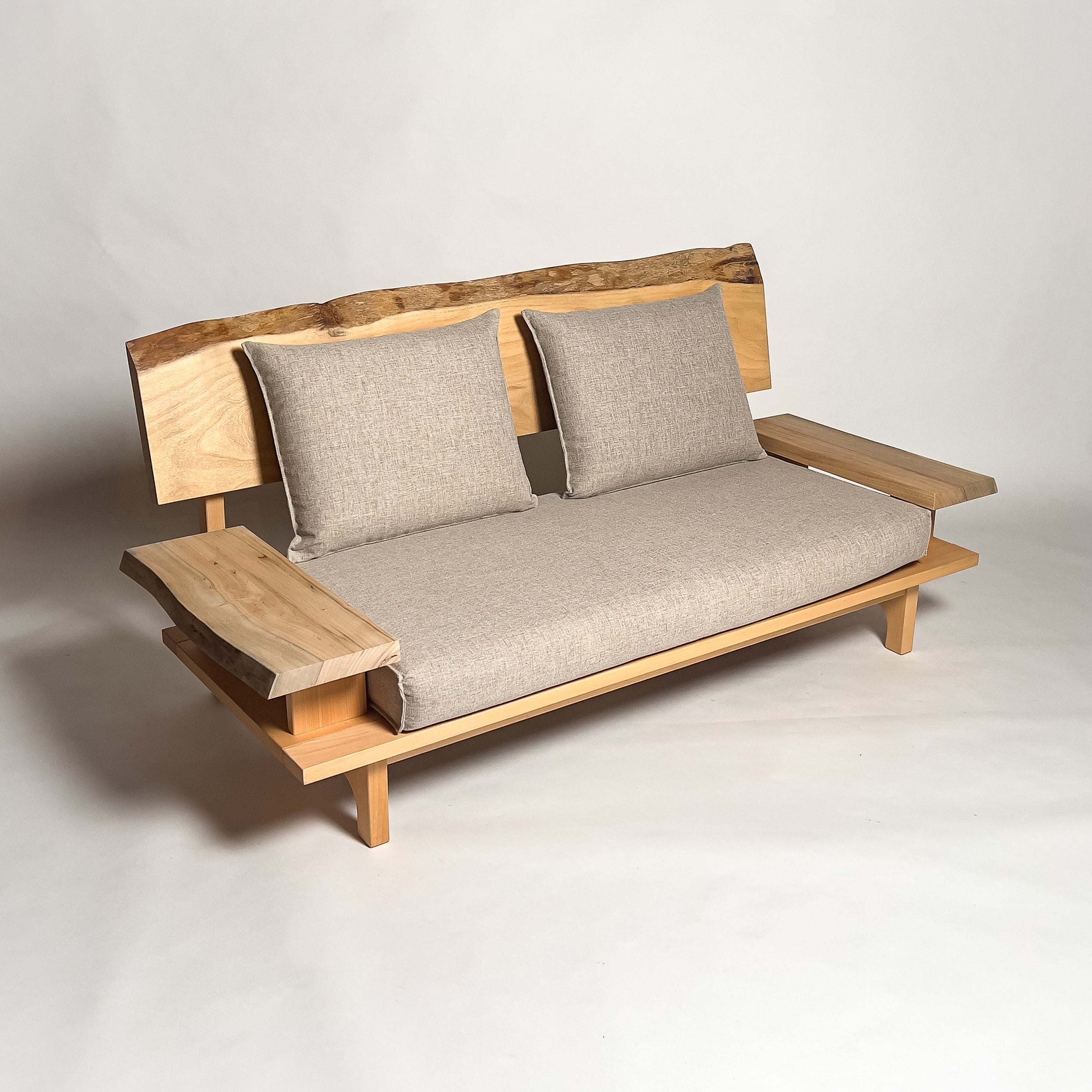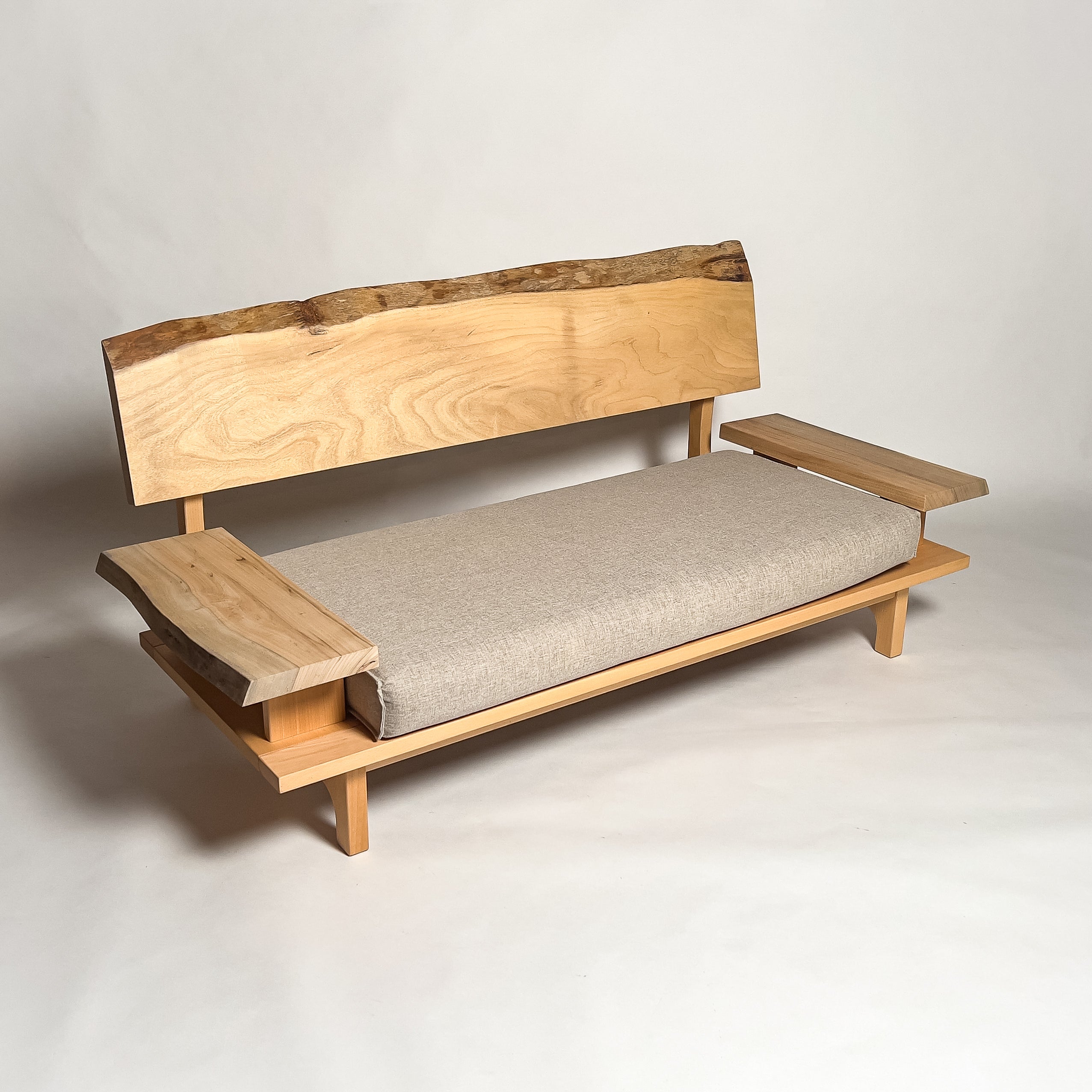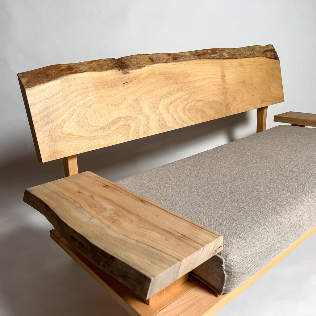 楠の一枚板を背もたれと肘置きに使用した天然木ソファです。穏やかな色合いと木目の流れが上品に映え、自然の躍動を残した造りが空間に温かさと心地よさを添え、上質な寛ぎのひとときを静かに演出します。