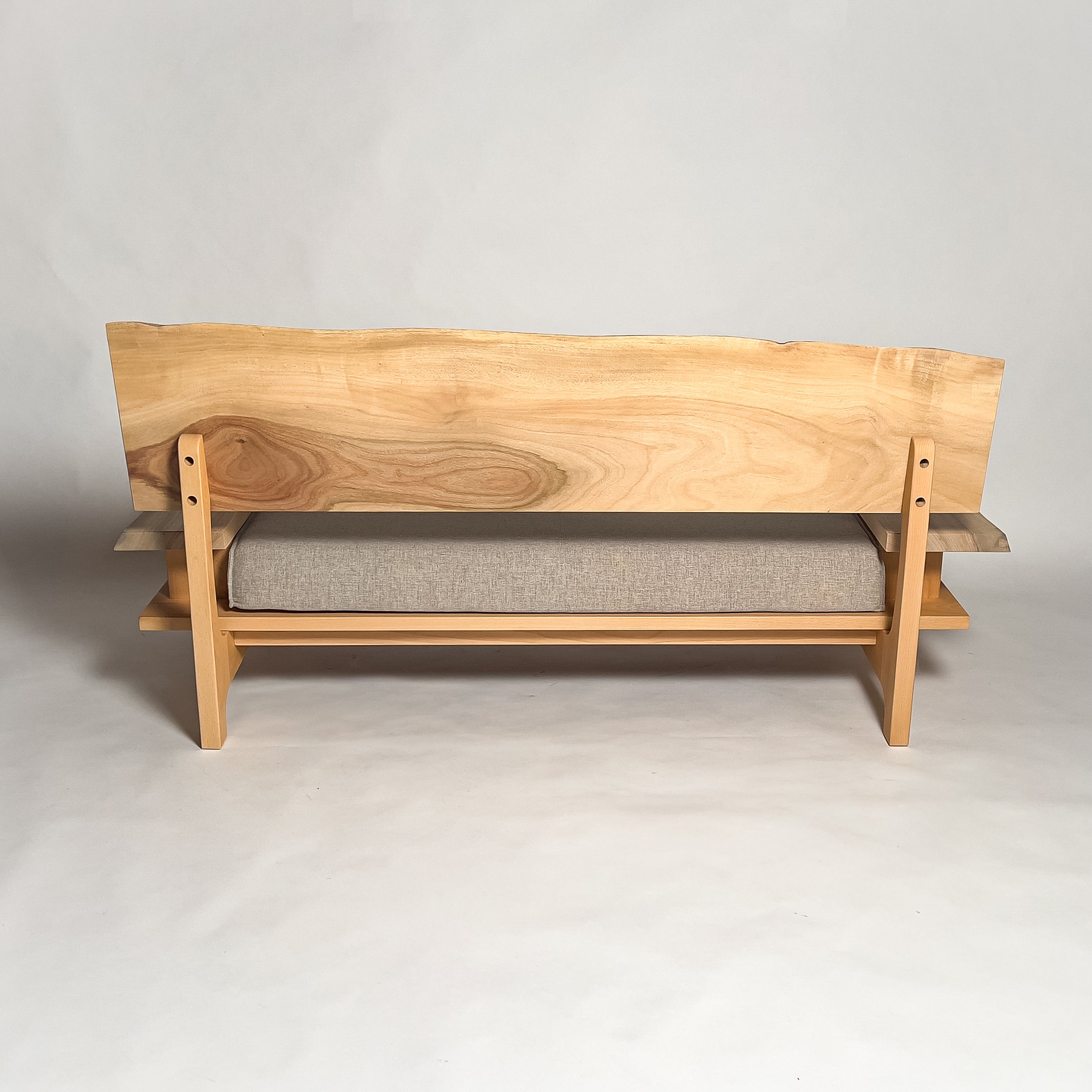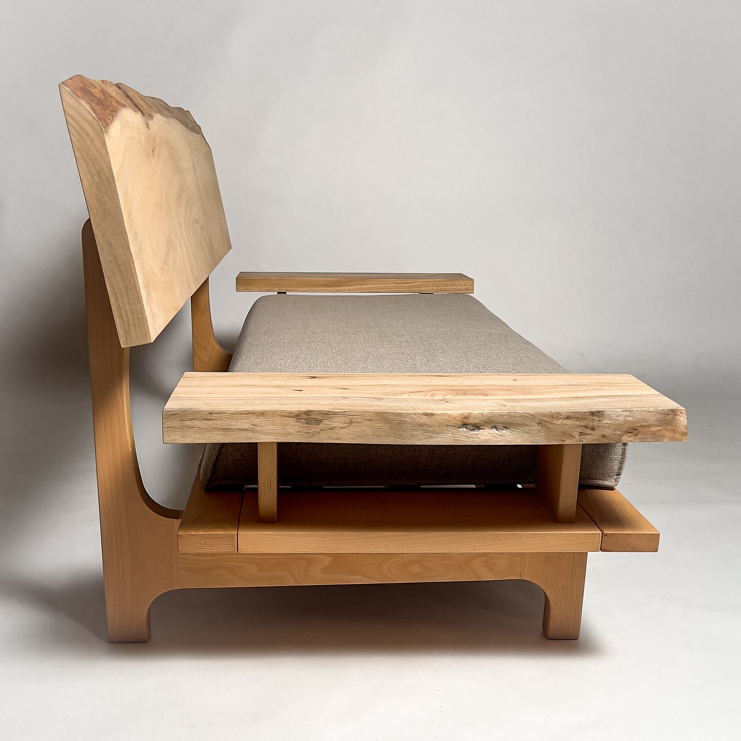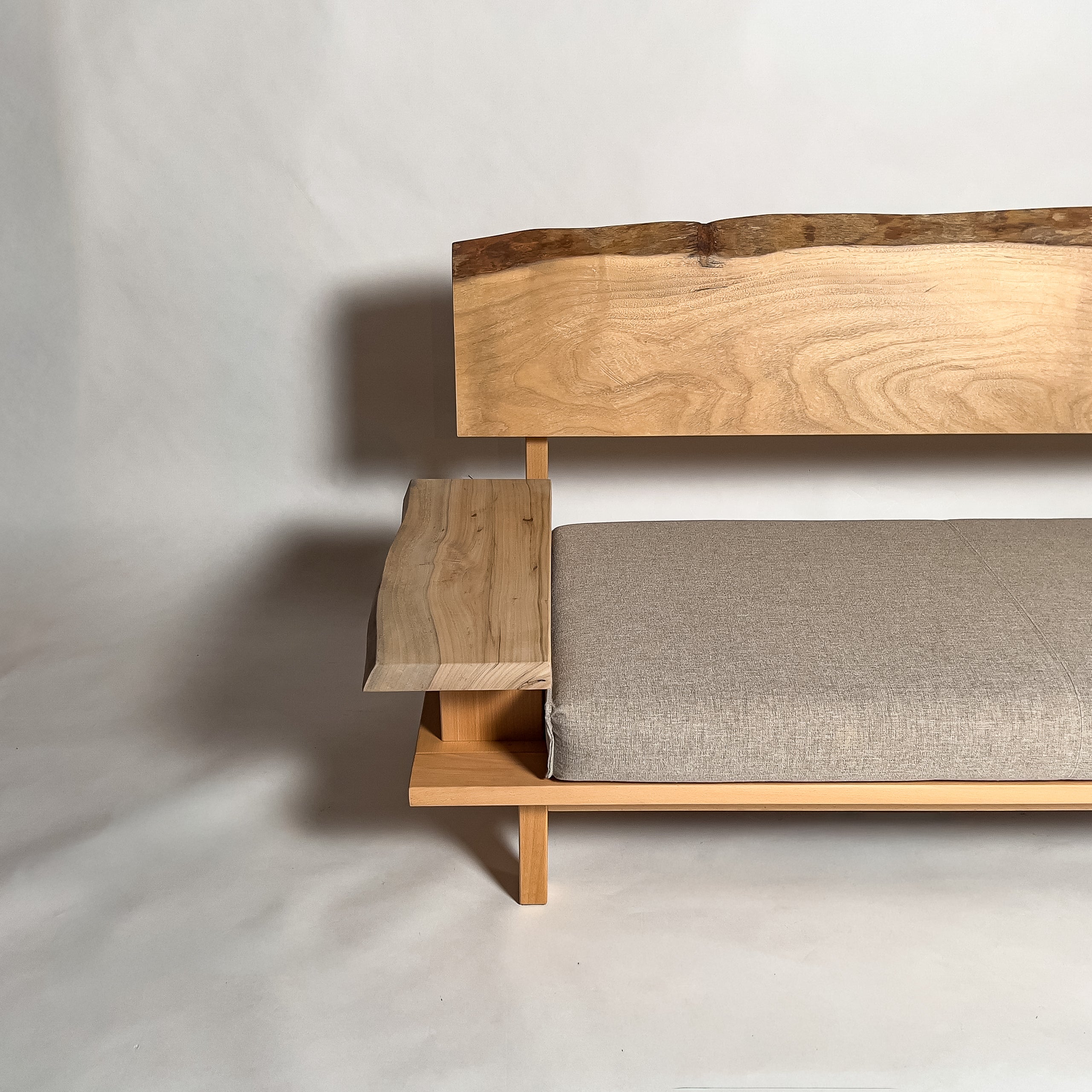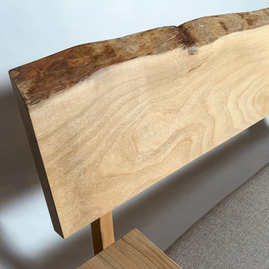 楠の一枚板を背もたれと肘置きに使用した天然木ソファです。穏やかな色合いと木目の流れが上品に映え、自然の躍動を残した造りが空間に温かさと心地よさを添え、上質な寛ぎのひとときを静かに演出します。