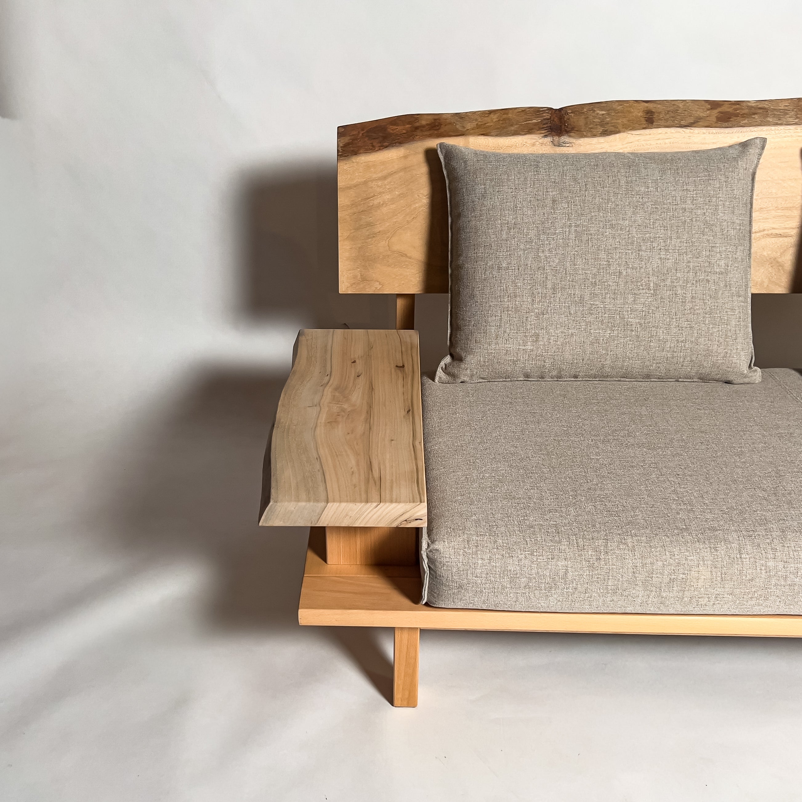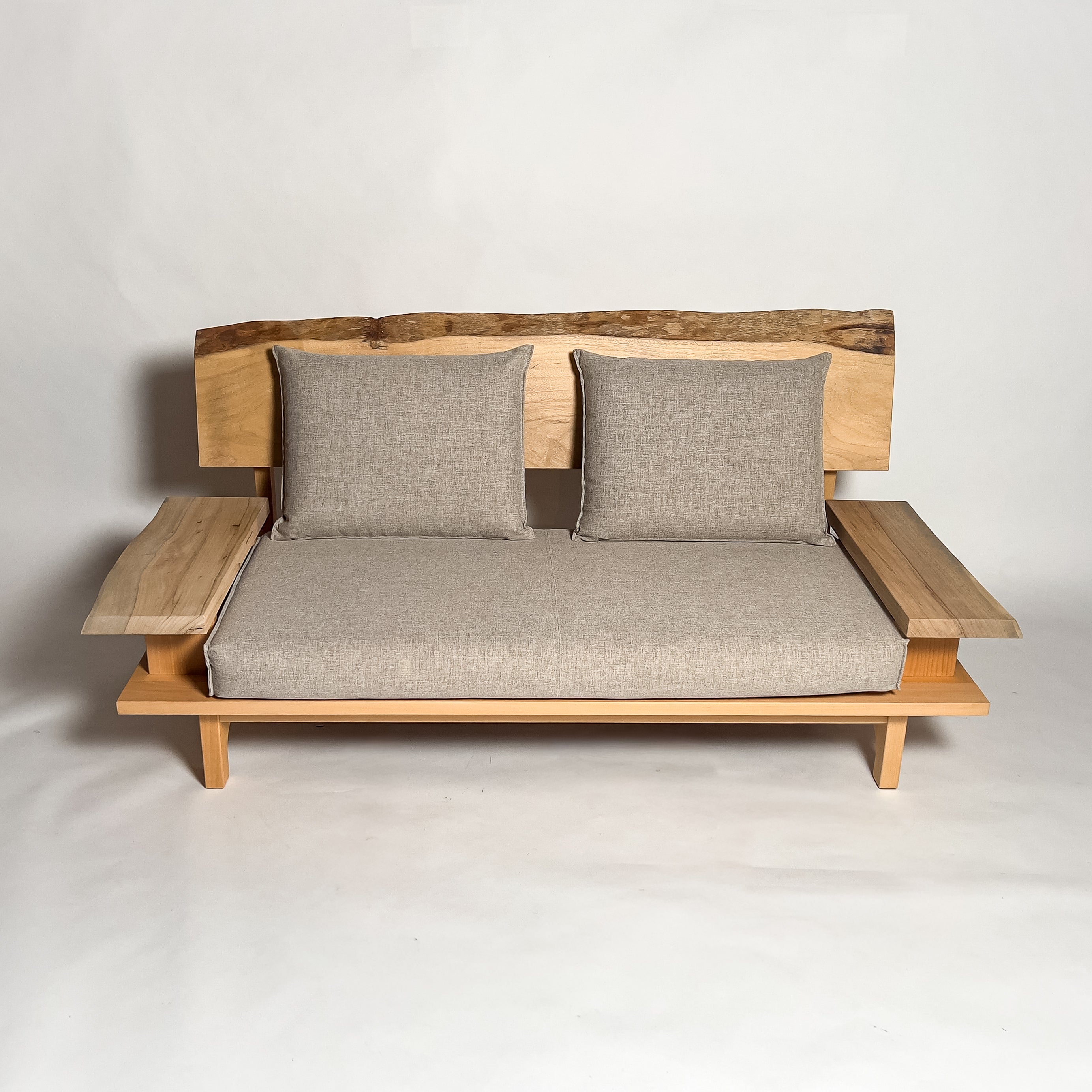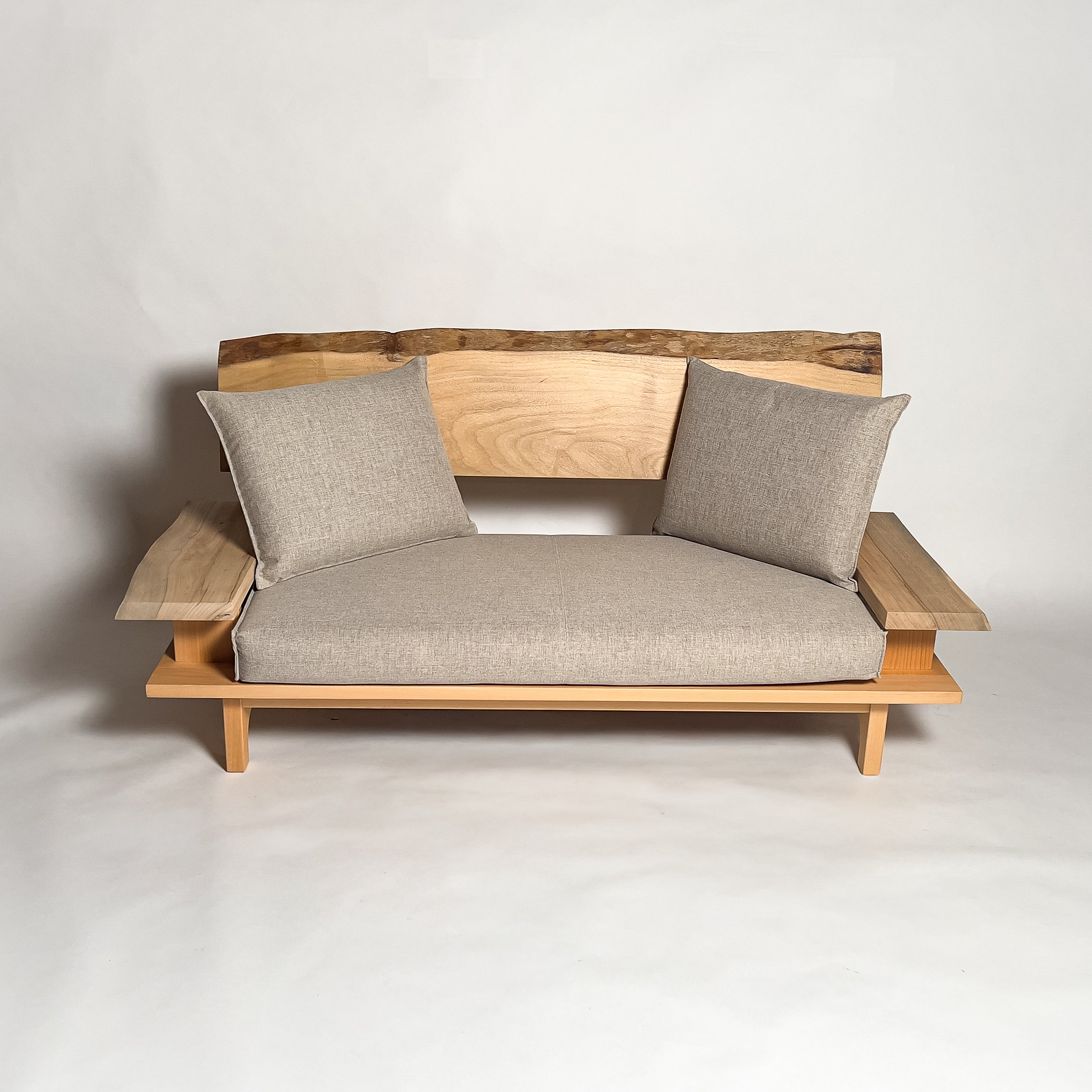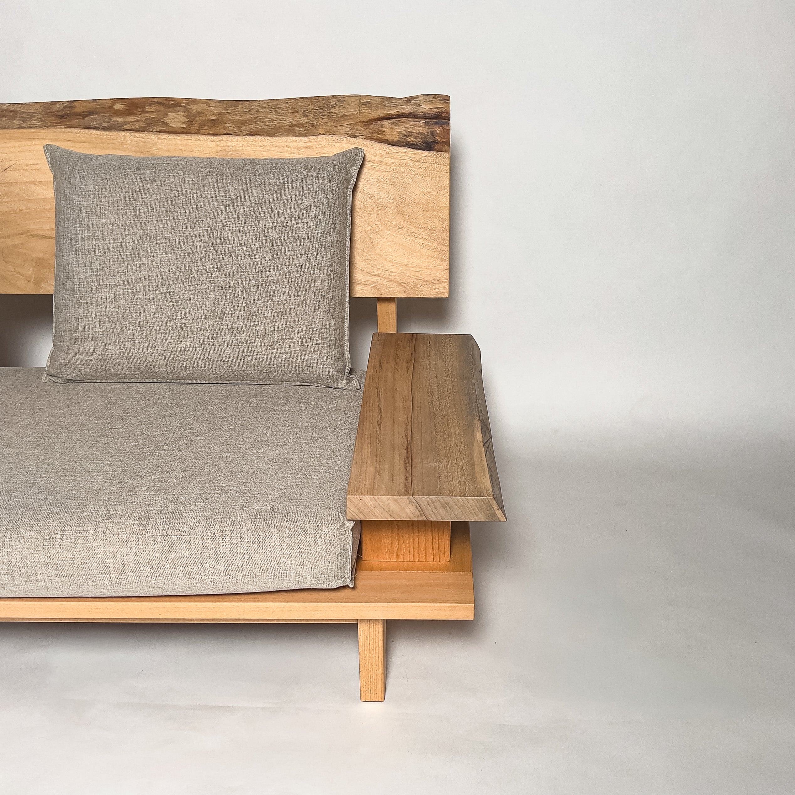 肘置き・背もたれに一枚板をあしらい、空間全体を洗練された雰囲気で包み込む2人掛けソファ。造形の美しさと素材感が空間を格調高く彩ります。さらに、緻密に設計されたクッションが身体をやさしく支え、長時間でも心地よく寛げる使いやすさを実現しました。