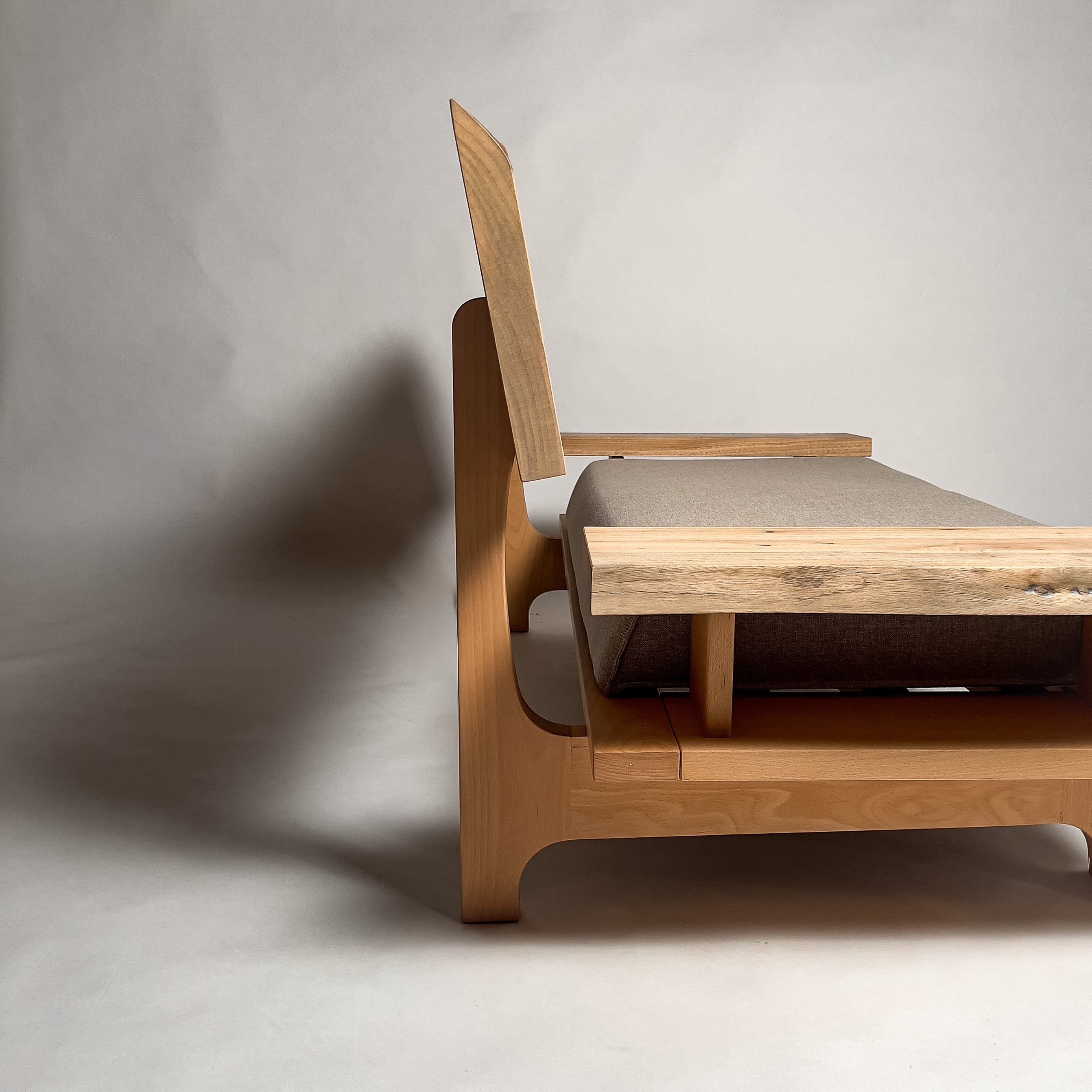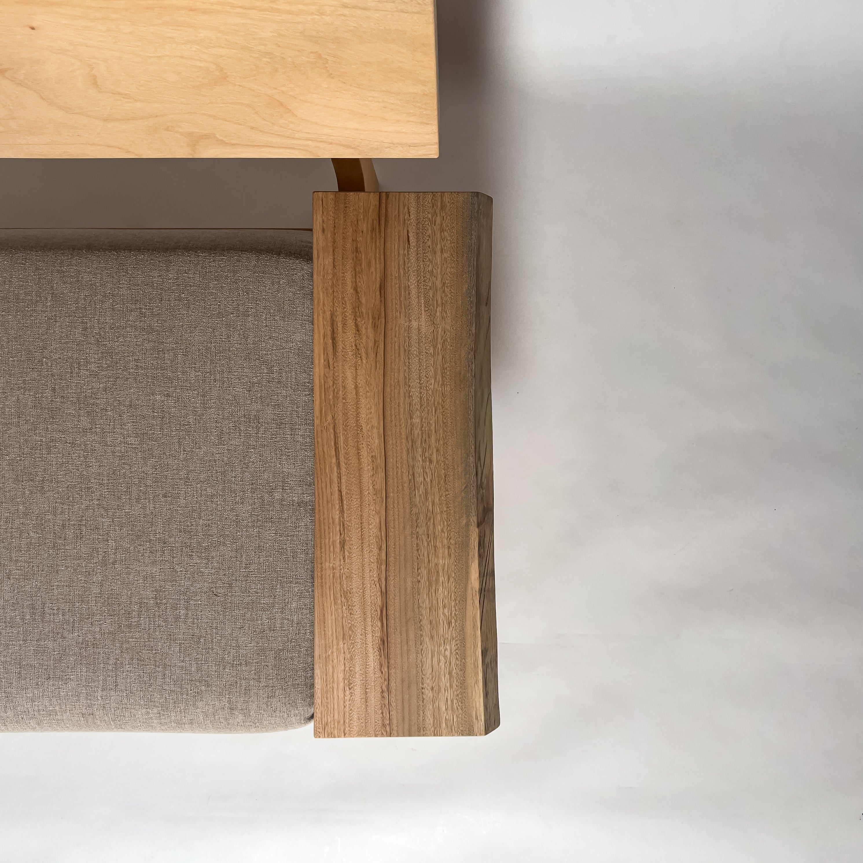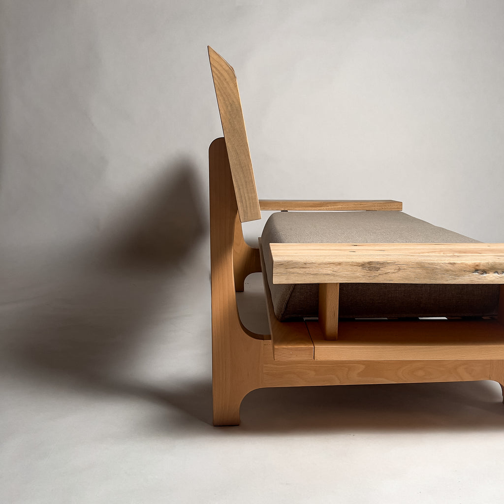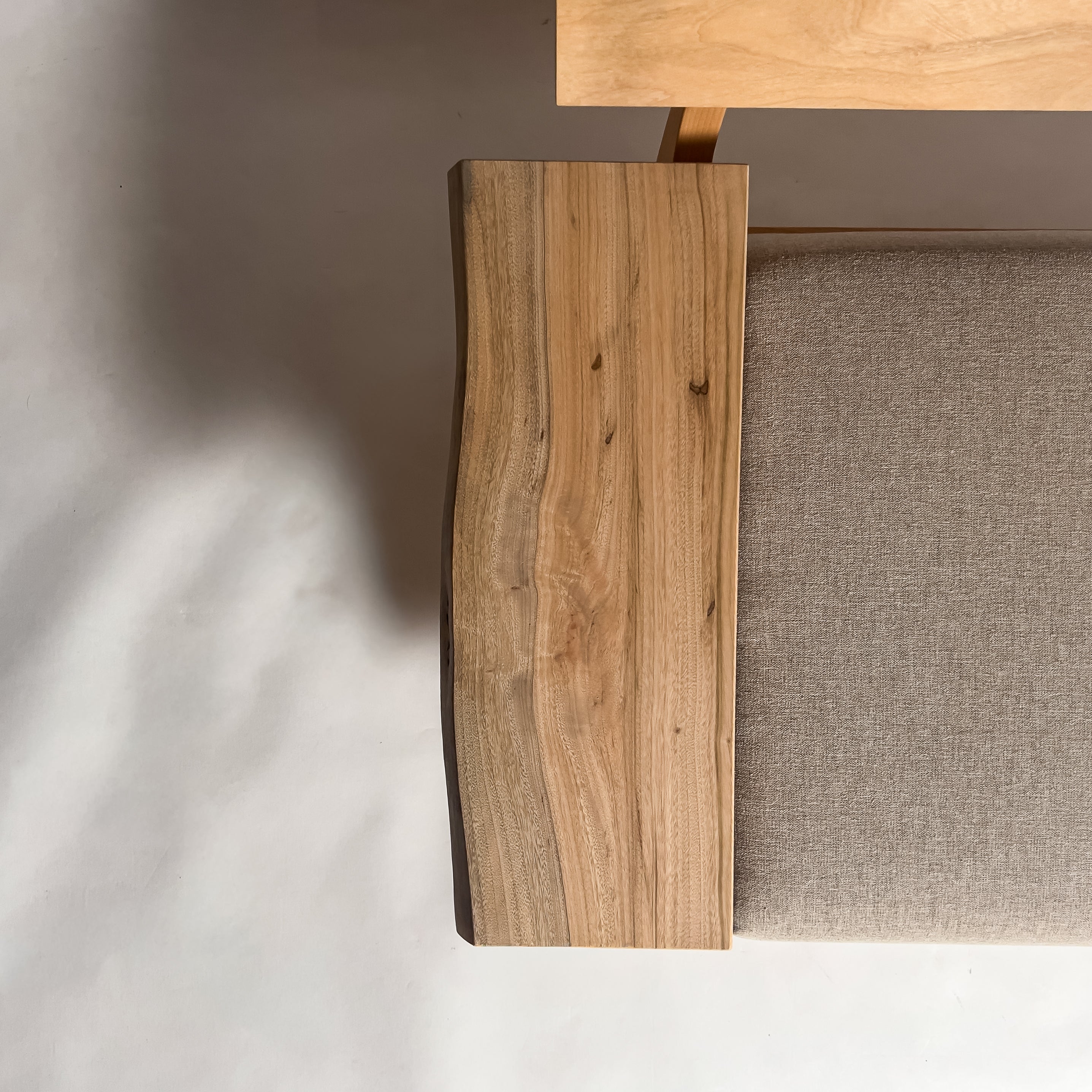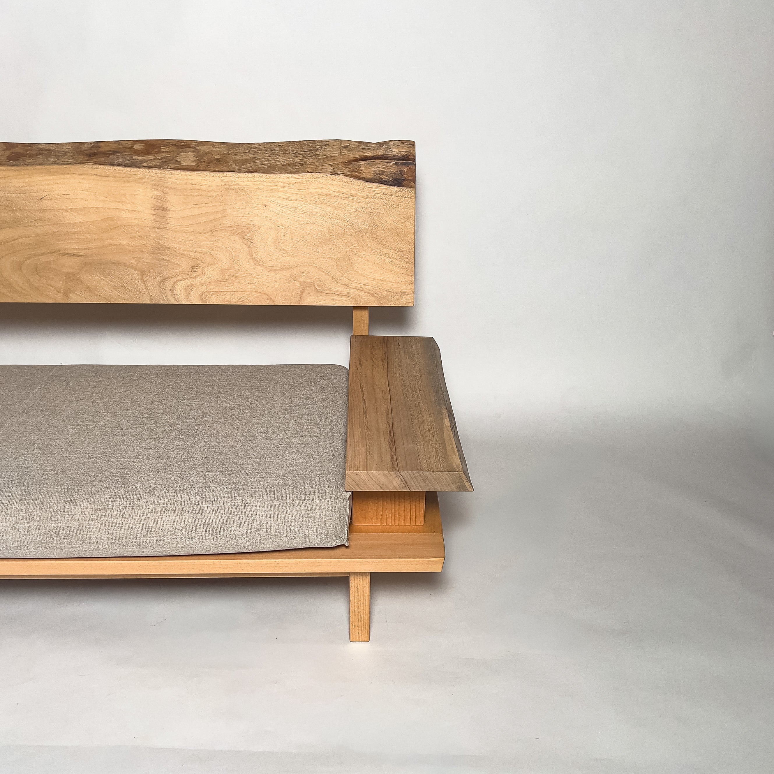 肘置き・背もたれに一枚板をあしらい、空間全体を洗練された雰囲気で包み込む2人掛けソファ。造形の美しさと素材感が空間を格調高く彩ります。さらに、緻密に設計されたクッションが身体をやさしく支え、長時間でも心地よく寛げる使いやすさを実現しました。