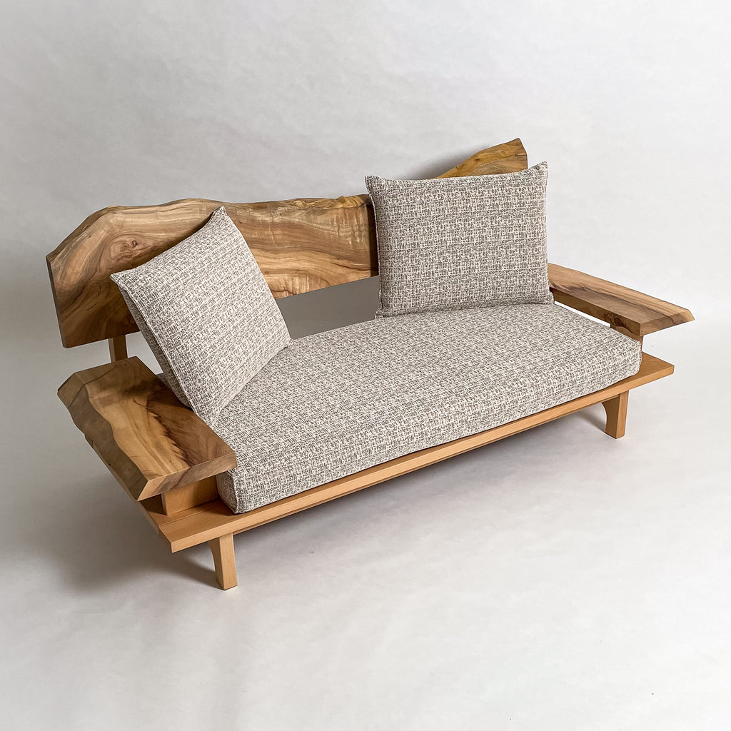肘置き・背もたれに一枚板をあしらい、空間全体を洗練された雰囲気で包み込む2人掛けソファ。造形の美しさと素材感が空間を格調高く彩ります。さらに、緻密に設計されたクッションが身体をやさしく支え、長時間でも心地よく寛げる使いやすさを実現しました。