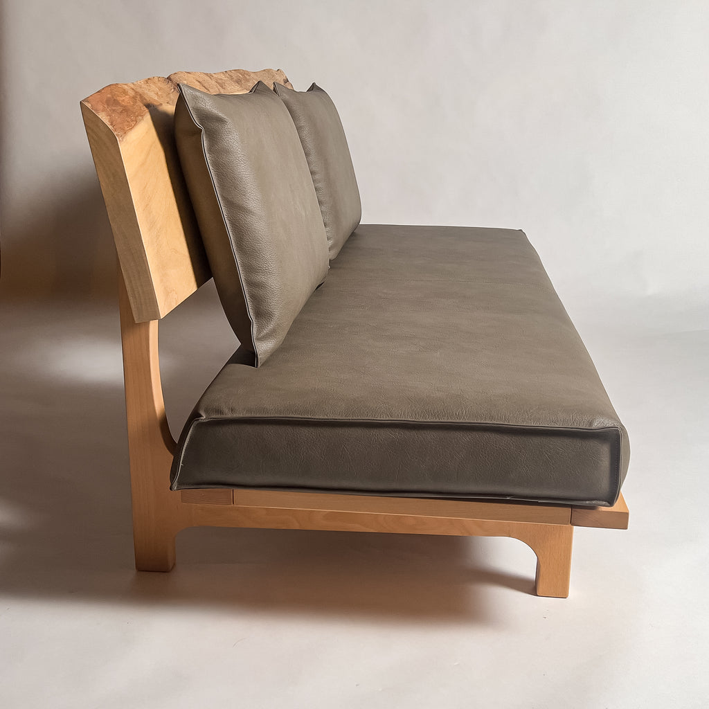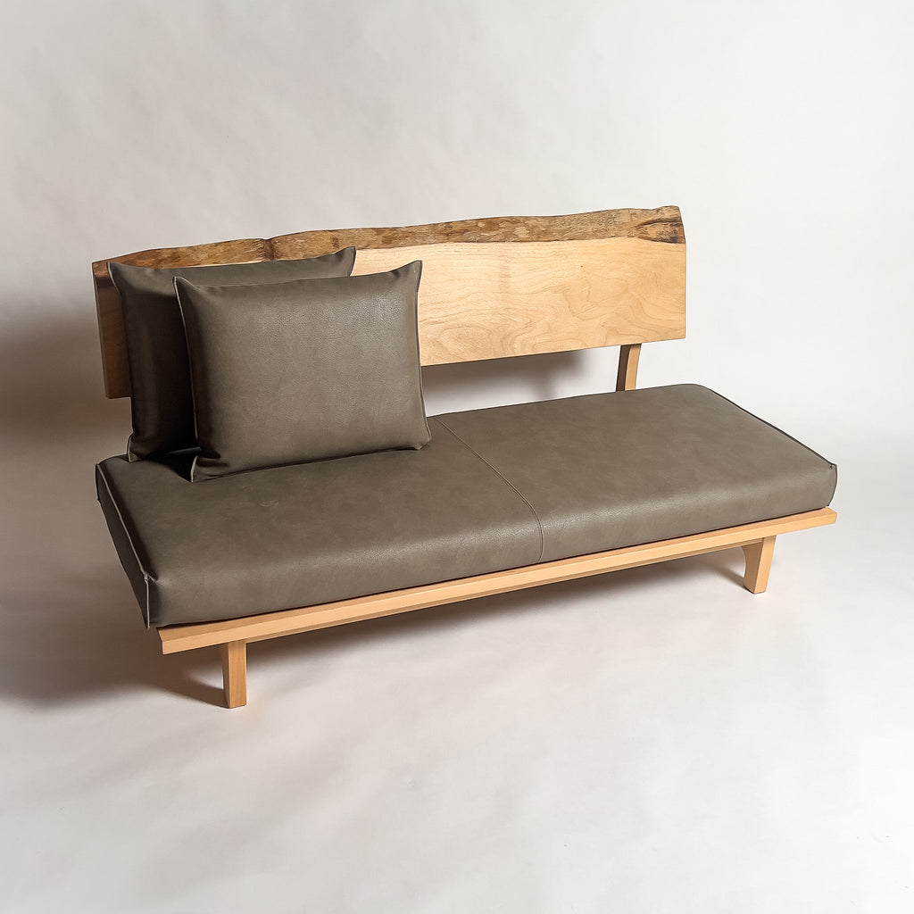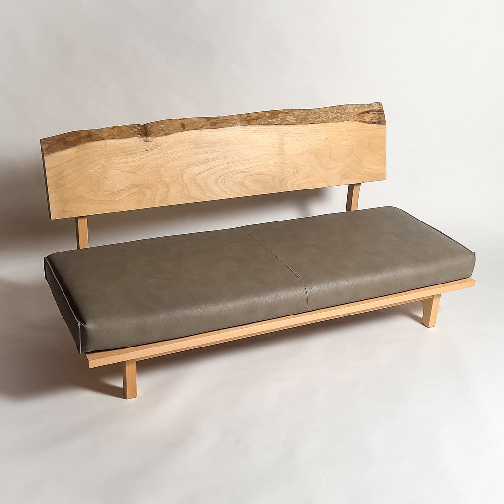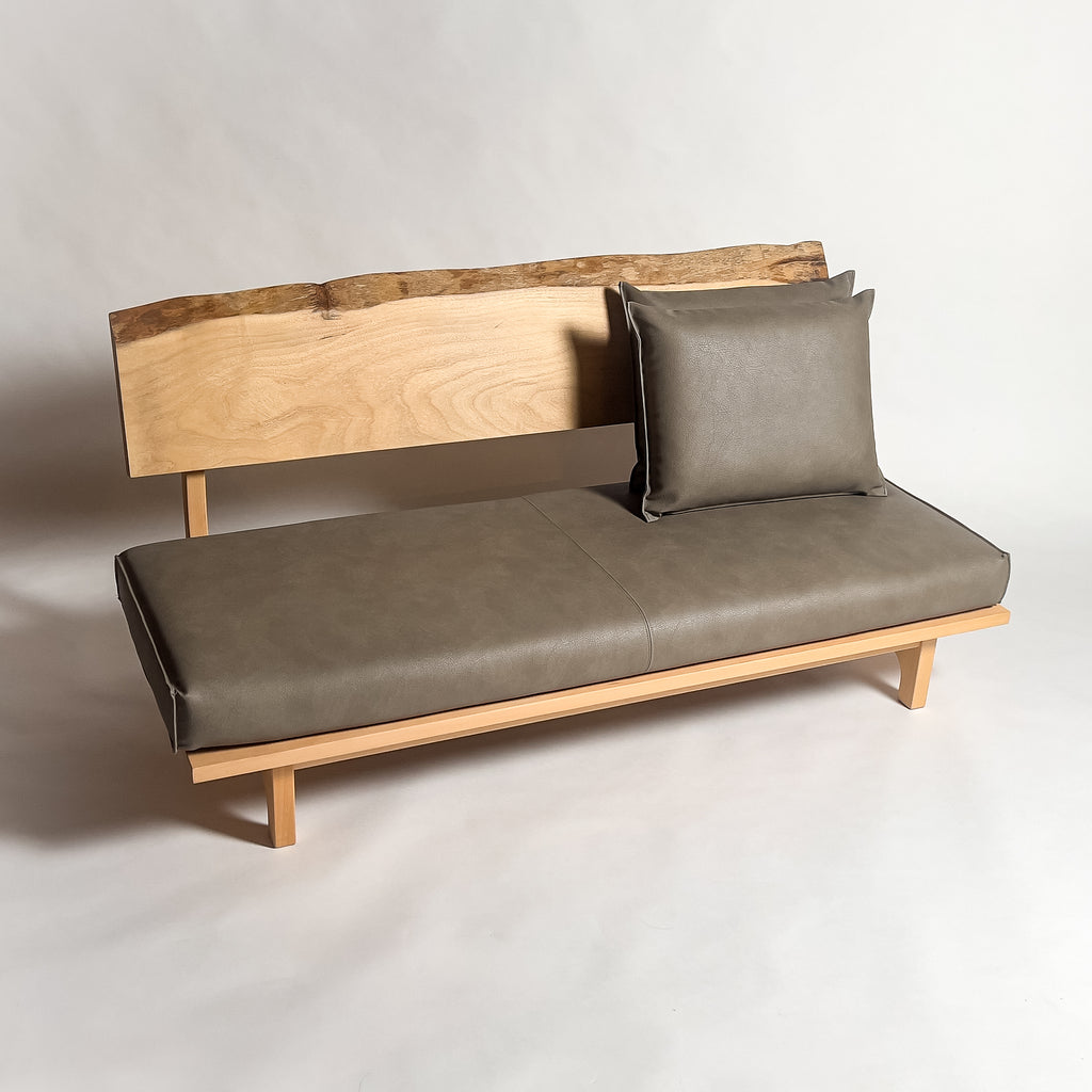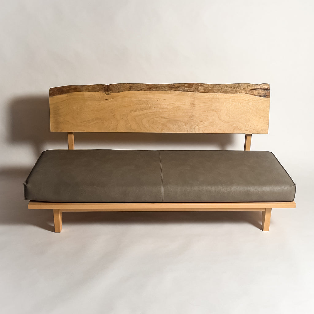 楠の一枚板を背もたれと肘置きに使用した天然木ソファです。穏やかな色合いと木目の流れが上品に映え、自然の躍動を残した造りが空間に温かさと心地よさを添え、上質な寛ぎのひとときを静かに演出します。