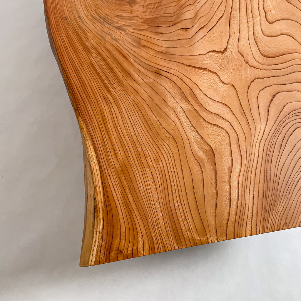 欅が歳月を重ねる中で育んだ「玉杢」が、やわらかく広がる景色。荒々しさを抑えた端部の仕上げは、職人が自然の流れを損なわないよう整えた証です。淡い飴色の表情には、森で育った時間の香りが息づいています。