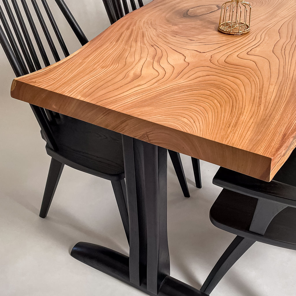 「際立つ」「美しい」という語源を持つほど美しい杢目が魅力。また、国産材最高峰の硬さ・耐久性能を持ち傷がつきにくい特徴を持つ欅は、テーブルに適した上質な素材。
