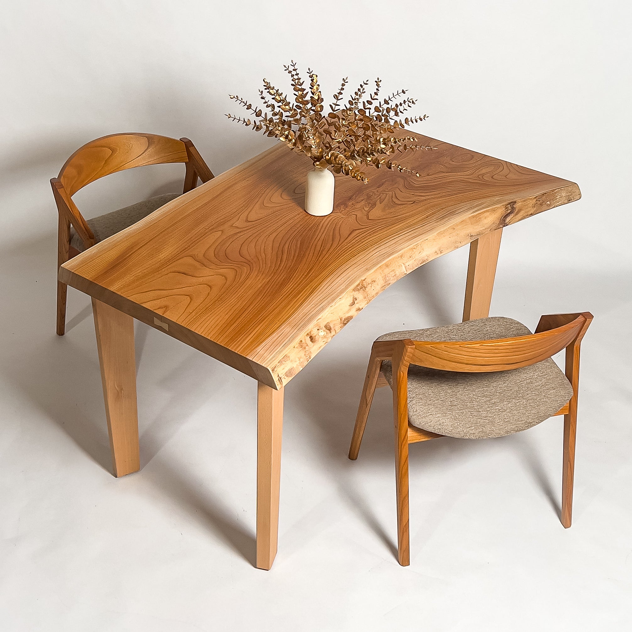「際立つ」「美しい」という語源を持つほど美しい杢目が魅力。また、国産材最高峰の硬さ・耐久性能を持ち傷がつきにくい特徴を持つ欅は、テーブルに適した上質な素材。