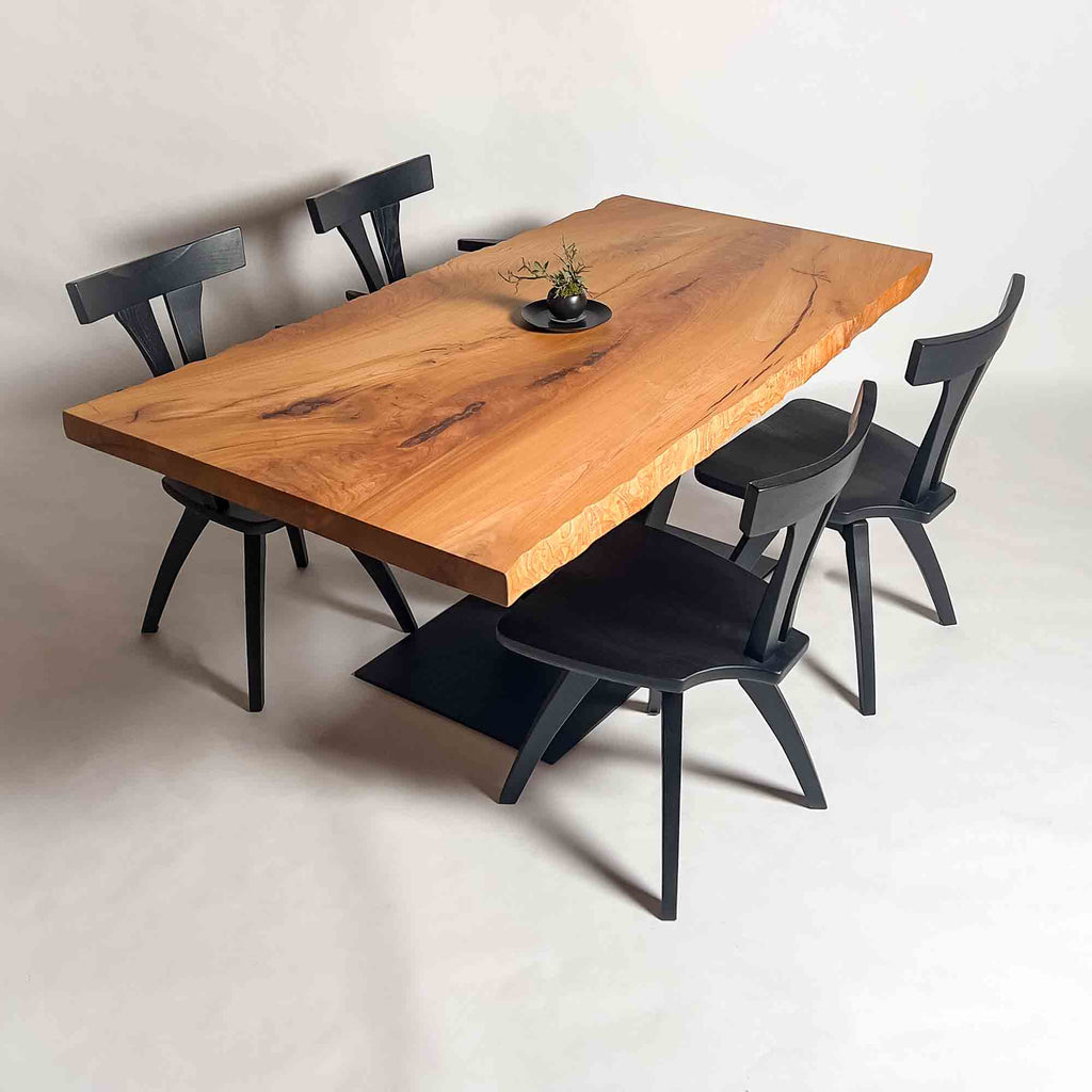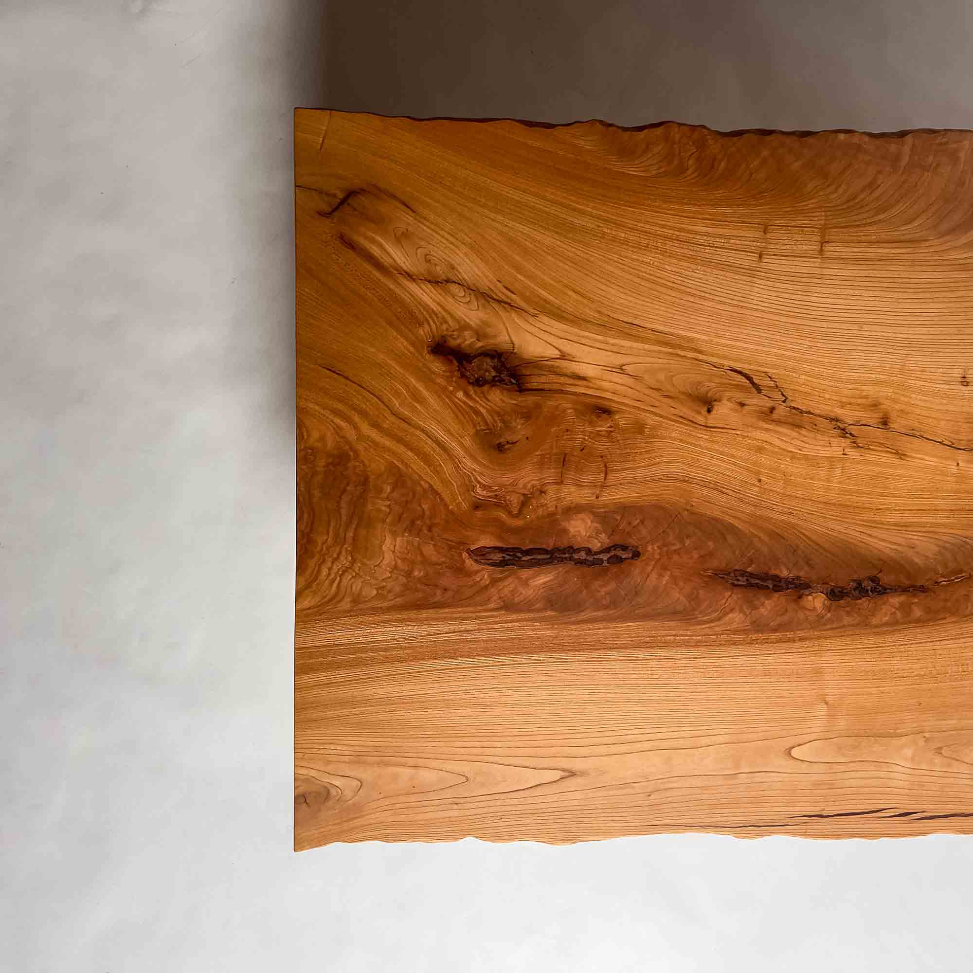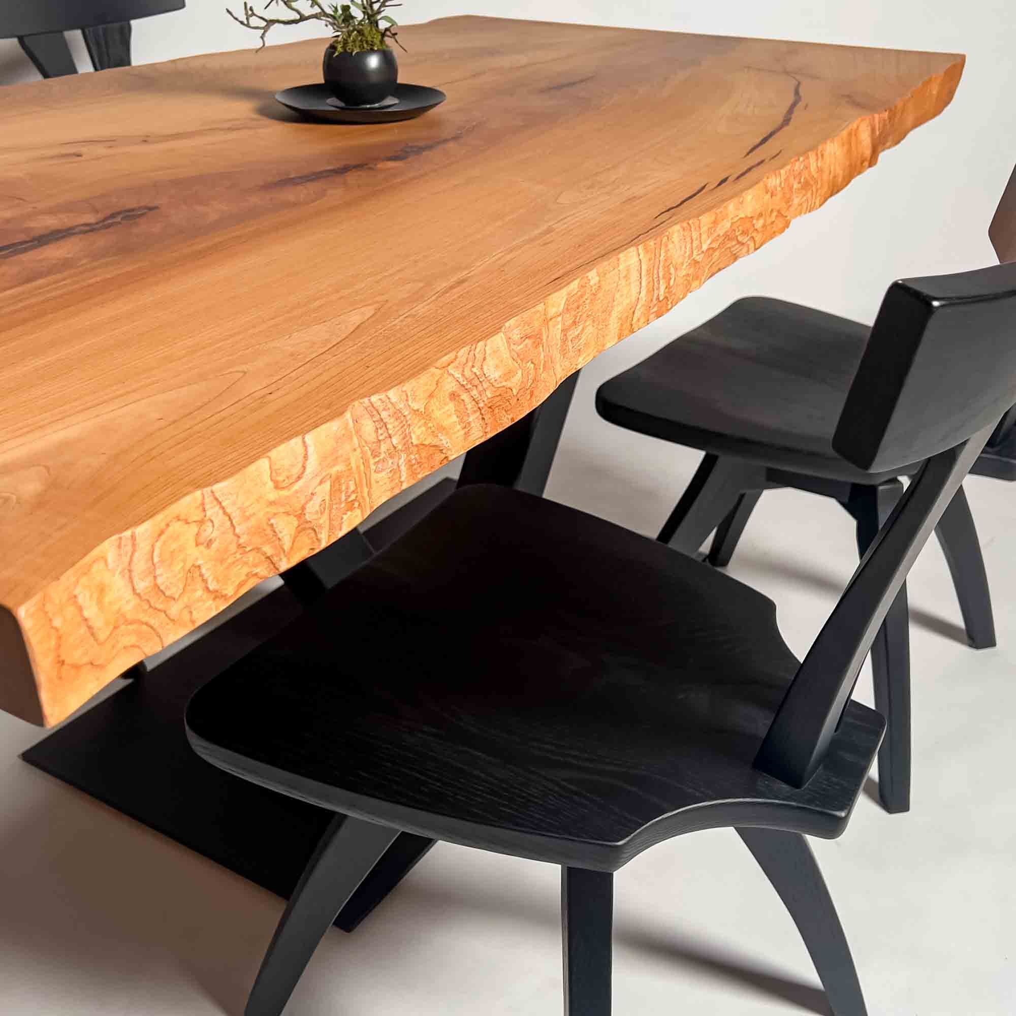 現代の空間に映えるモダンな佇まいを意識しつつ、一枚板ごとに素材感と存在感の出方を見極め、加工を行います。造形を整えすぎず、木が本来持つ表情を残すことを大切にしています。 ![]() |