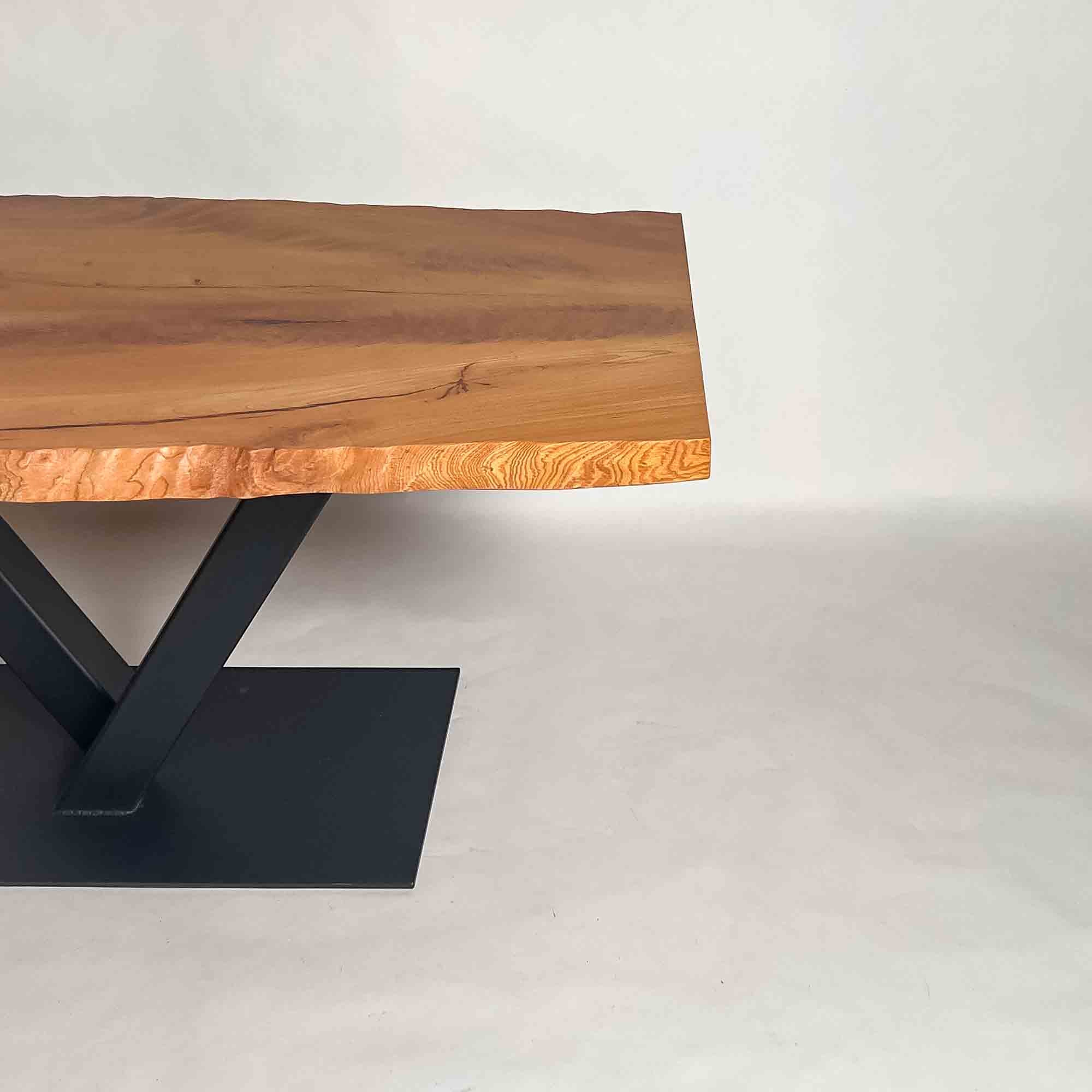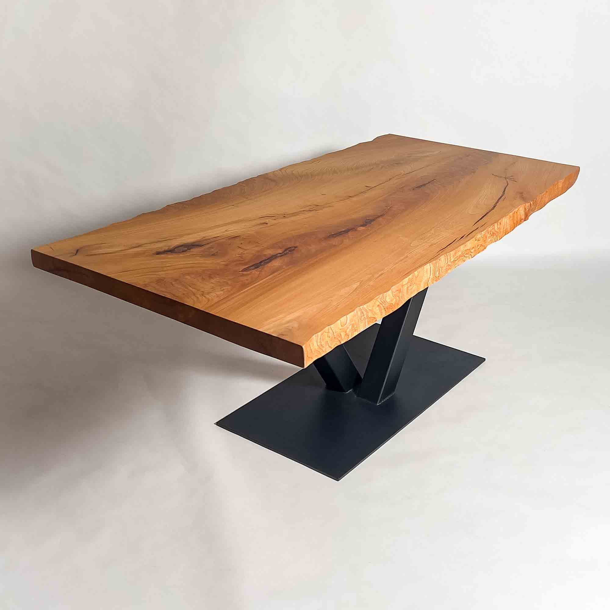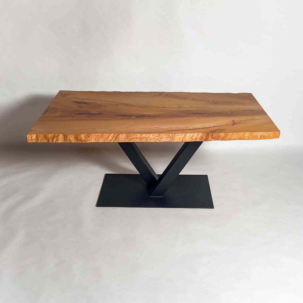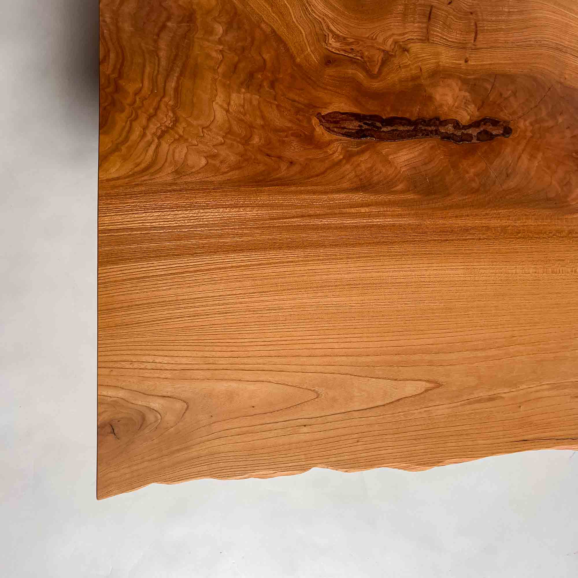 中央に向かって奥行が広がる非対称の輪郭と、中央を貫く濃色の木目が印象に残る欅の天板。耳の揺らぎと木目の強い流れが面全体に動きを生み、1600サイズながら視線を自然に中央へ導く構成になっています。