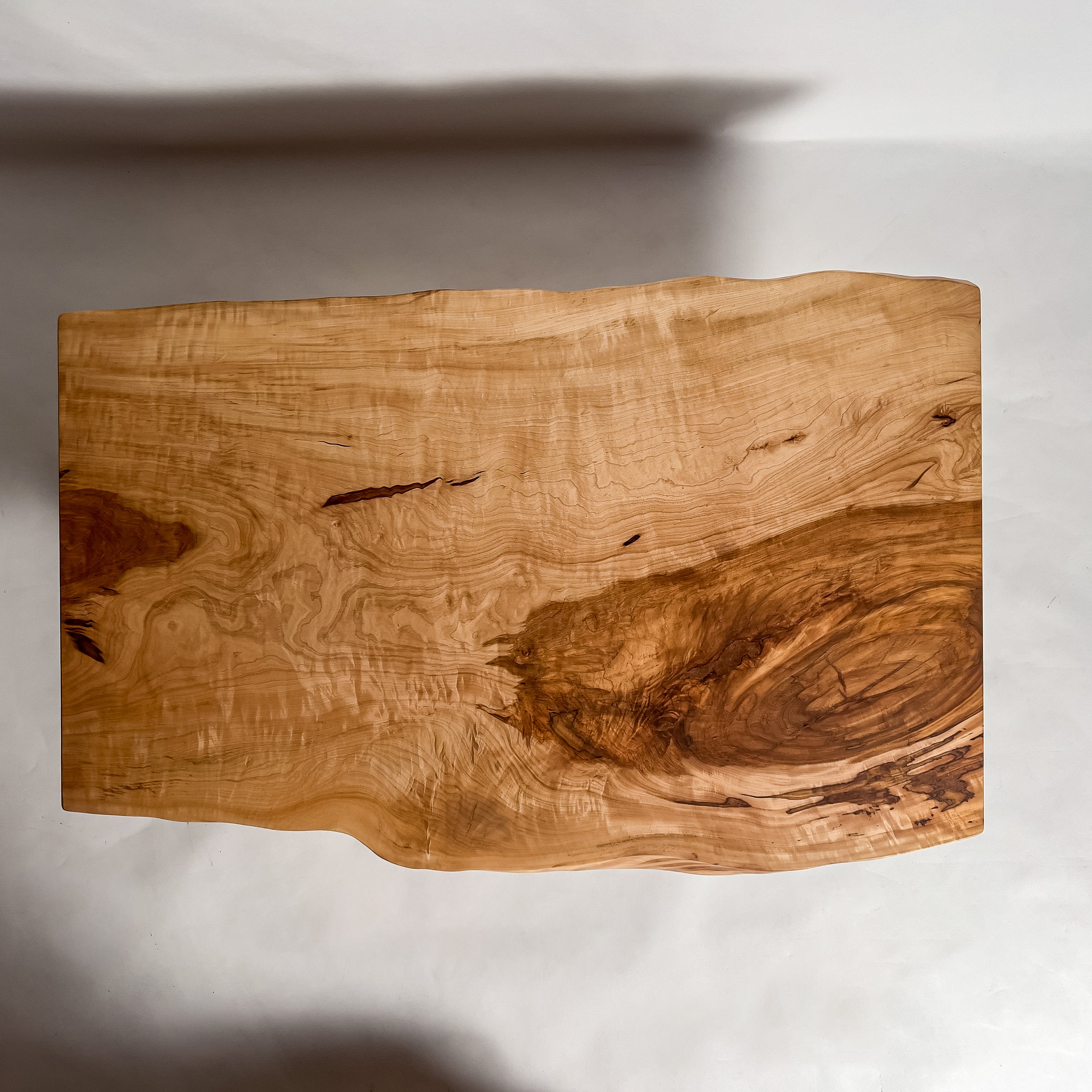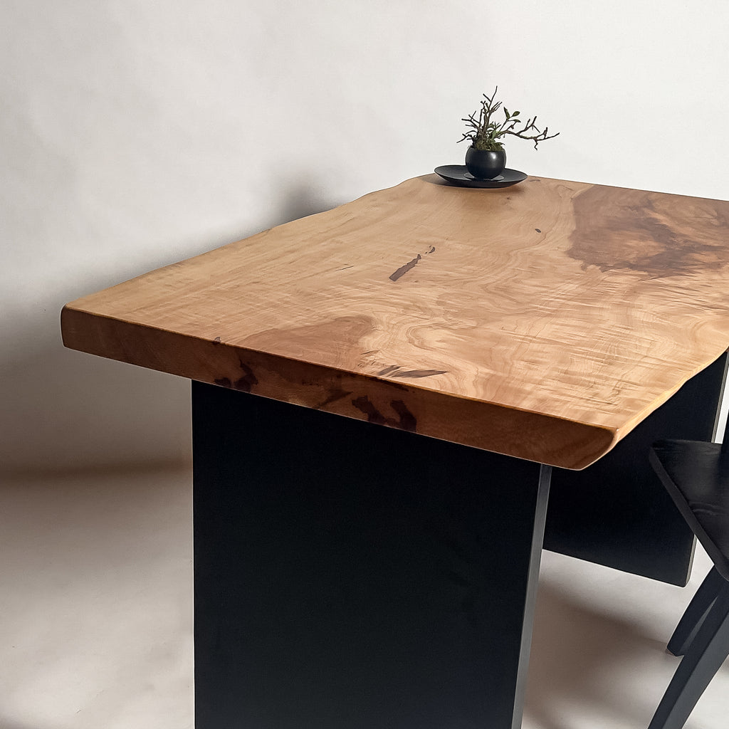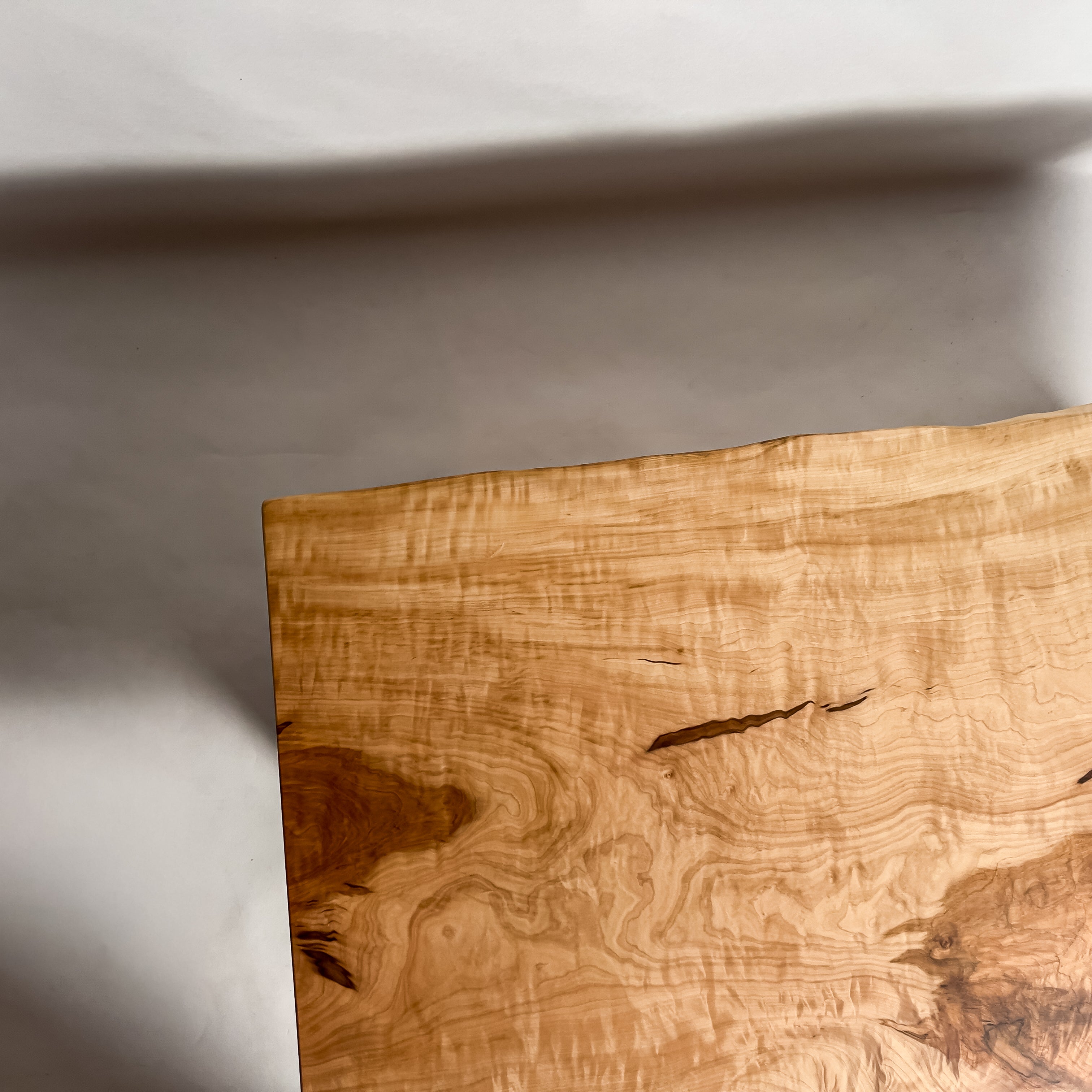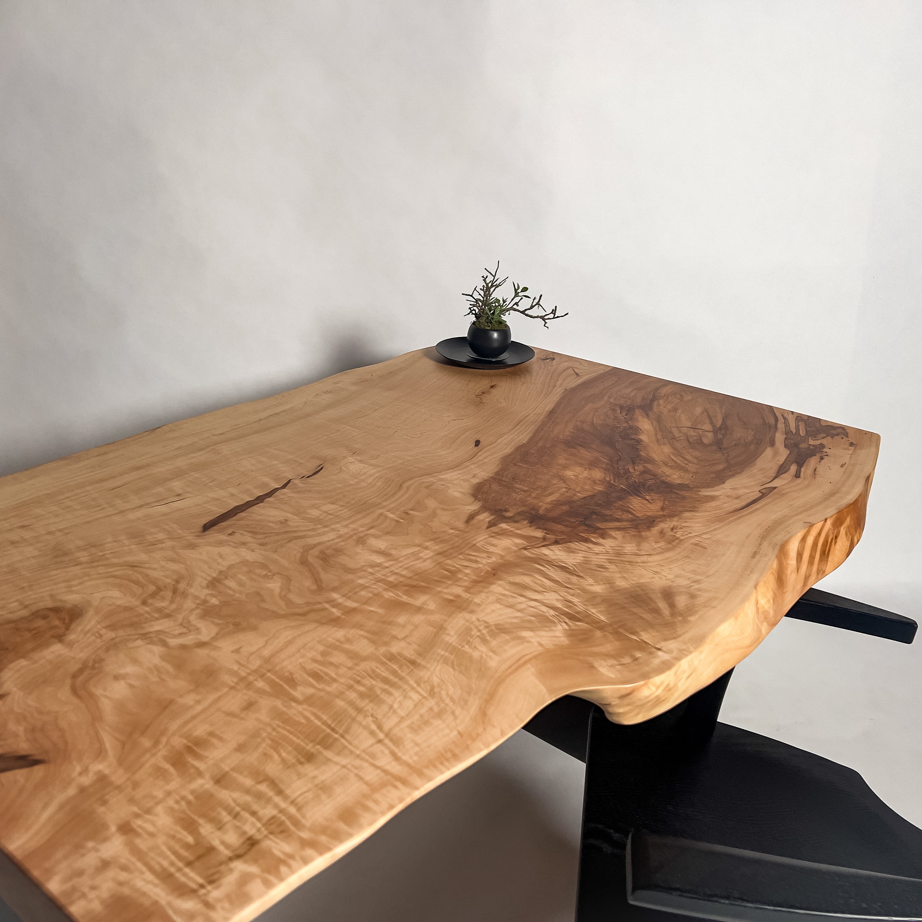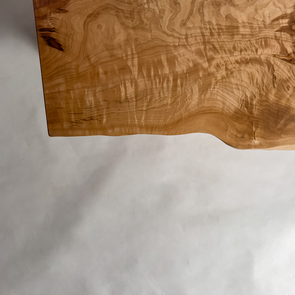山間部や水辺近くで豊富な水分を吸い上げて育った栃が、年輪の揺らぎとともに縮み杢を宿し、右側に大きく広がる濃色の杢目と淡色部の対比を描いています。自然の色味を残し光沢を抑えた仕上げが面の起伏を穏やかに整え、成長の軌跡がそのまま天板に息づいています。