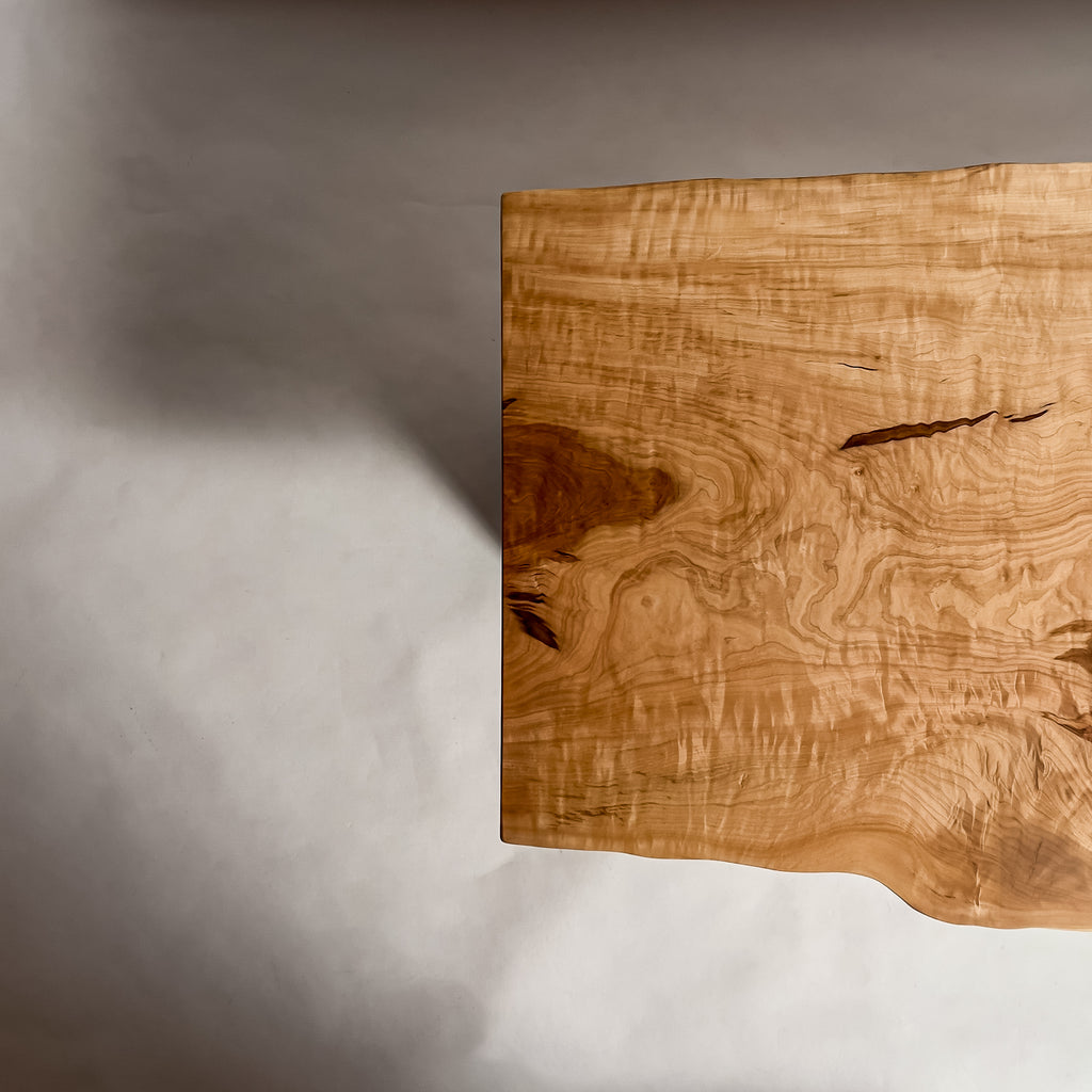 | 自然が生み出した不均一な表情を 読み解き、素材の持つ品格や奥行きが際立つよう、細部まで配慮した加工で完成度を高める。 | 一枚板単体の美しさだけでなく、置かれる空間や光の入り方までを思い描き、その場に自然と溶け込む佇まいへと仕上げる。 | |