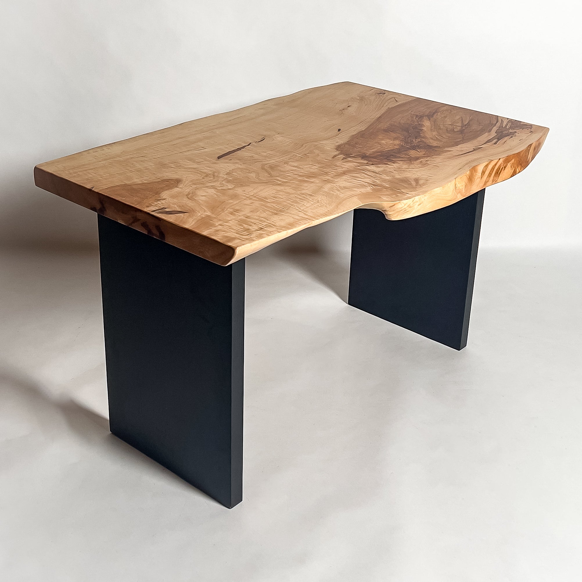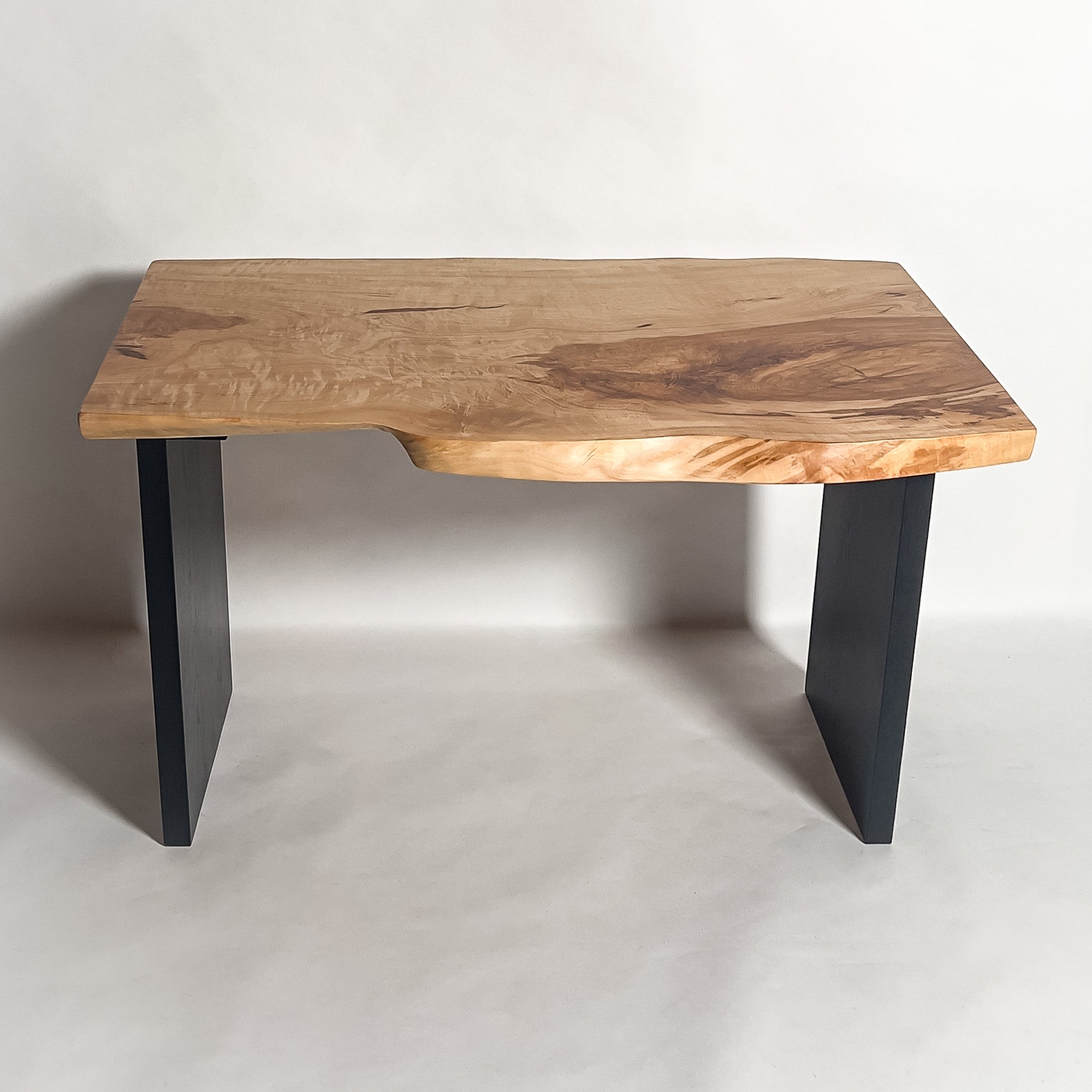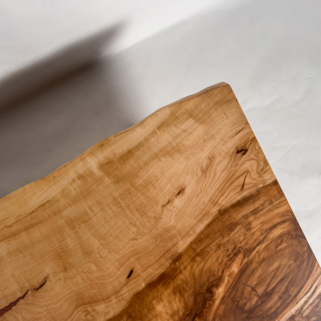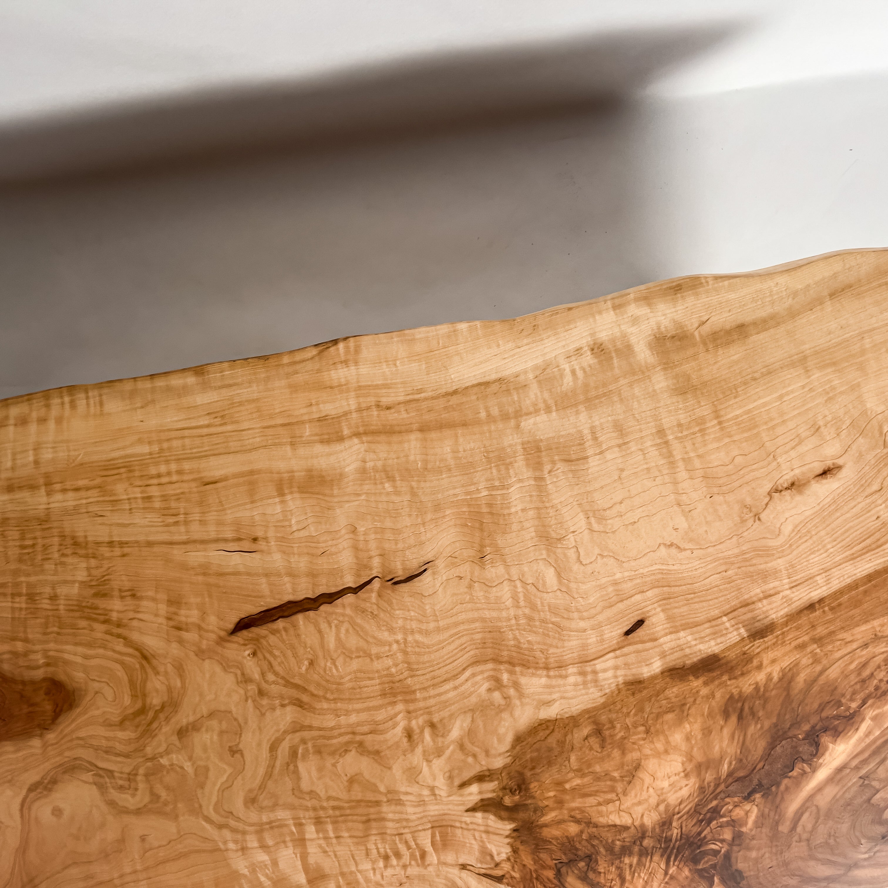 この一枚板の希少性:高い 長手途中に大きな濃色杢が広がり、下辺の耳が緩やかに波打つ様子が一体で現れています。同様の杢の発現と耳のまとまりが揃う原木は限られるため希少性が高いです。 |