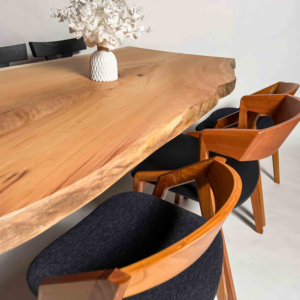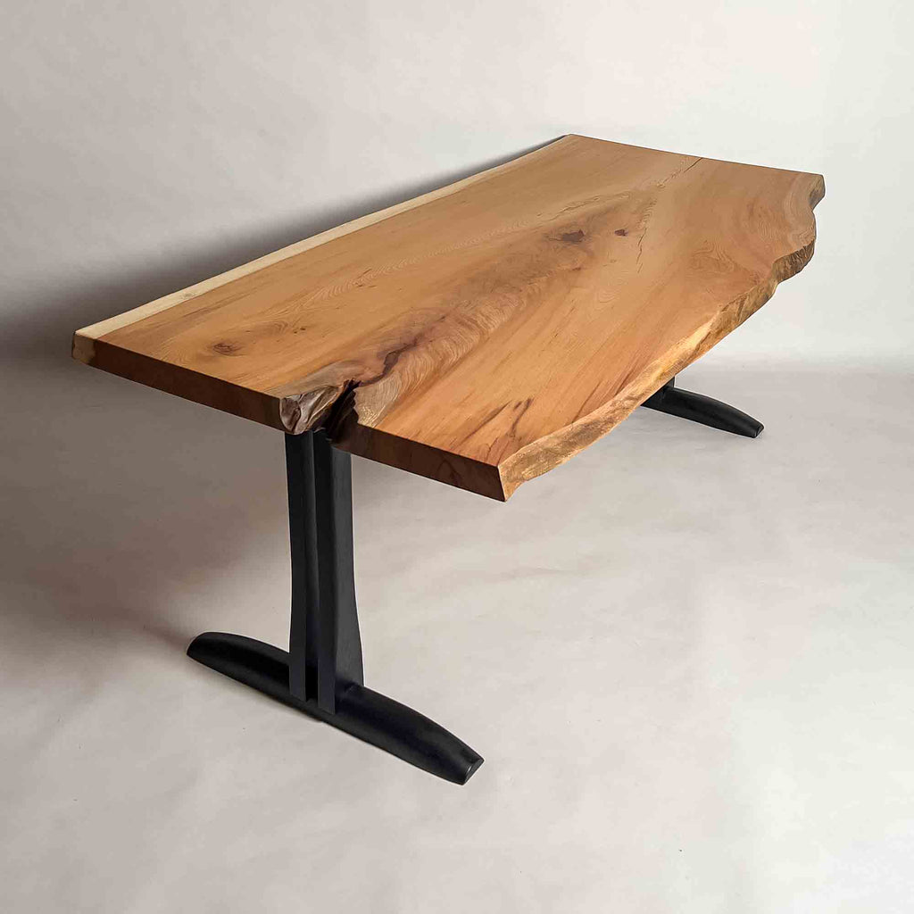 中央に膨らむ非対称の輪郭と節を起点にした木目の流れが天面を横断し、広い奥行を活かして配膳と対面が同時に成立する構成です