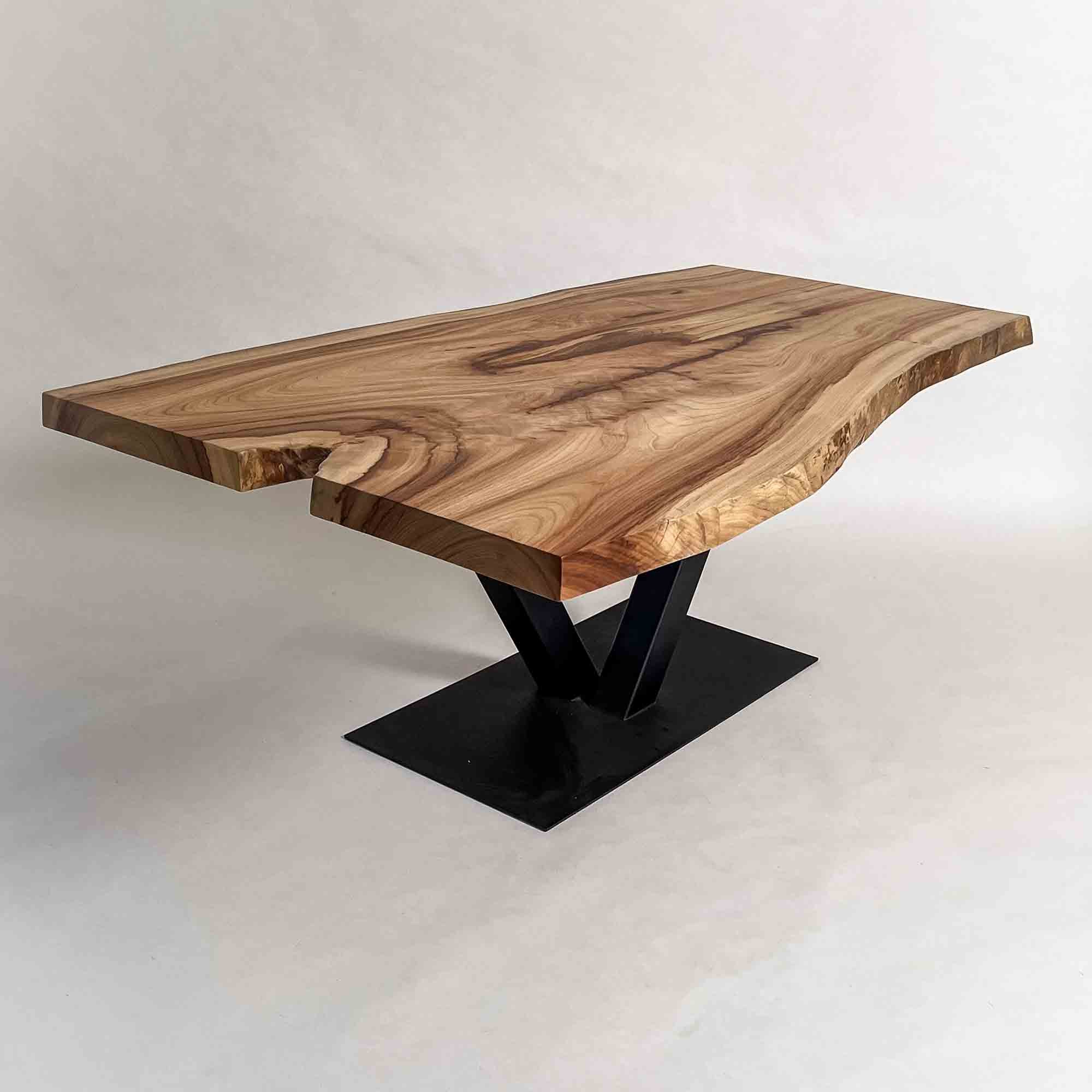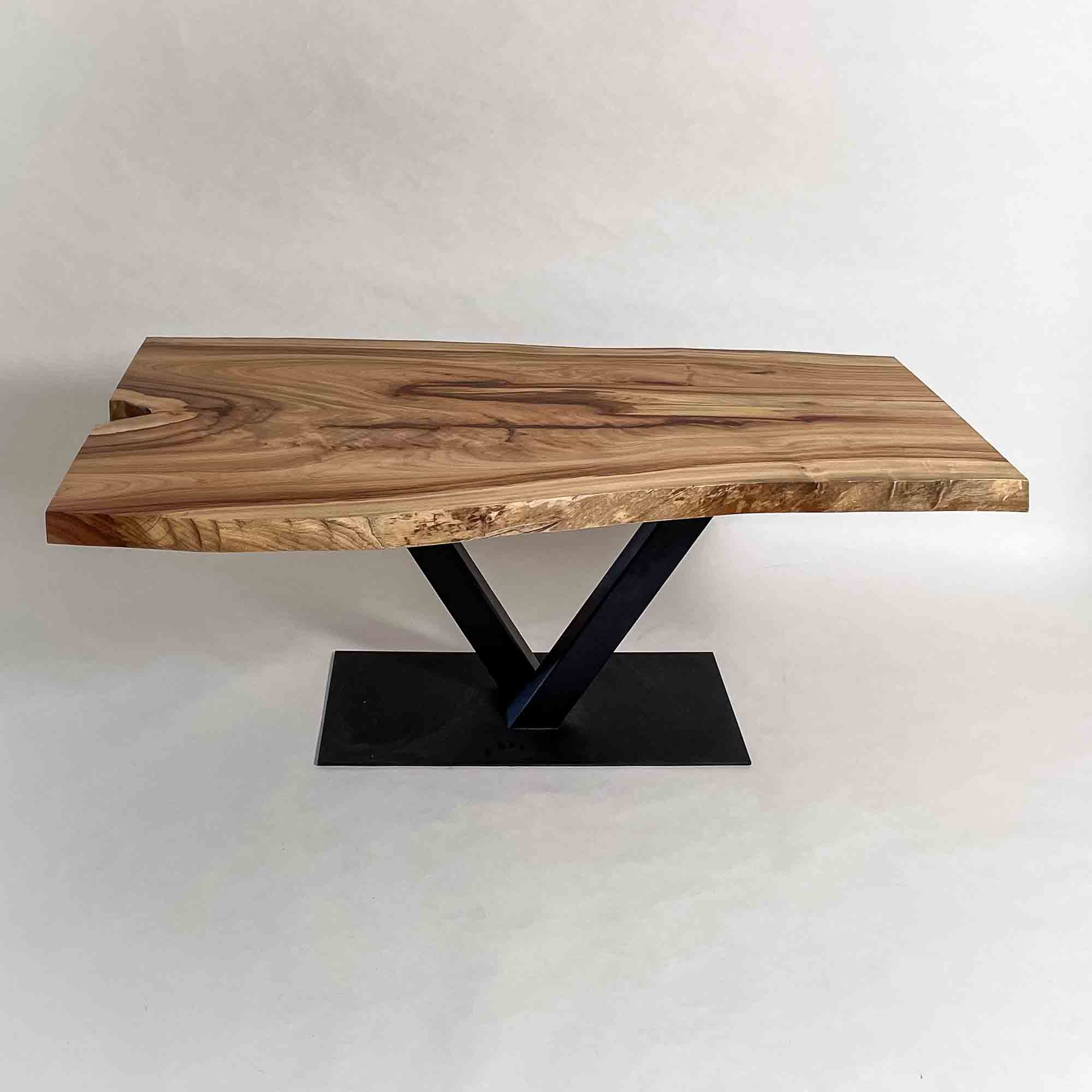 中央に溜まる濃色部と流れ込む木目が連続し、非対称に広がる輪郭が天板全体の視線を引き寄せる一枚です