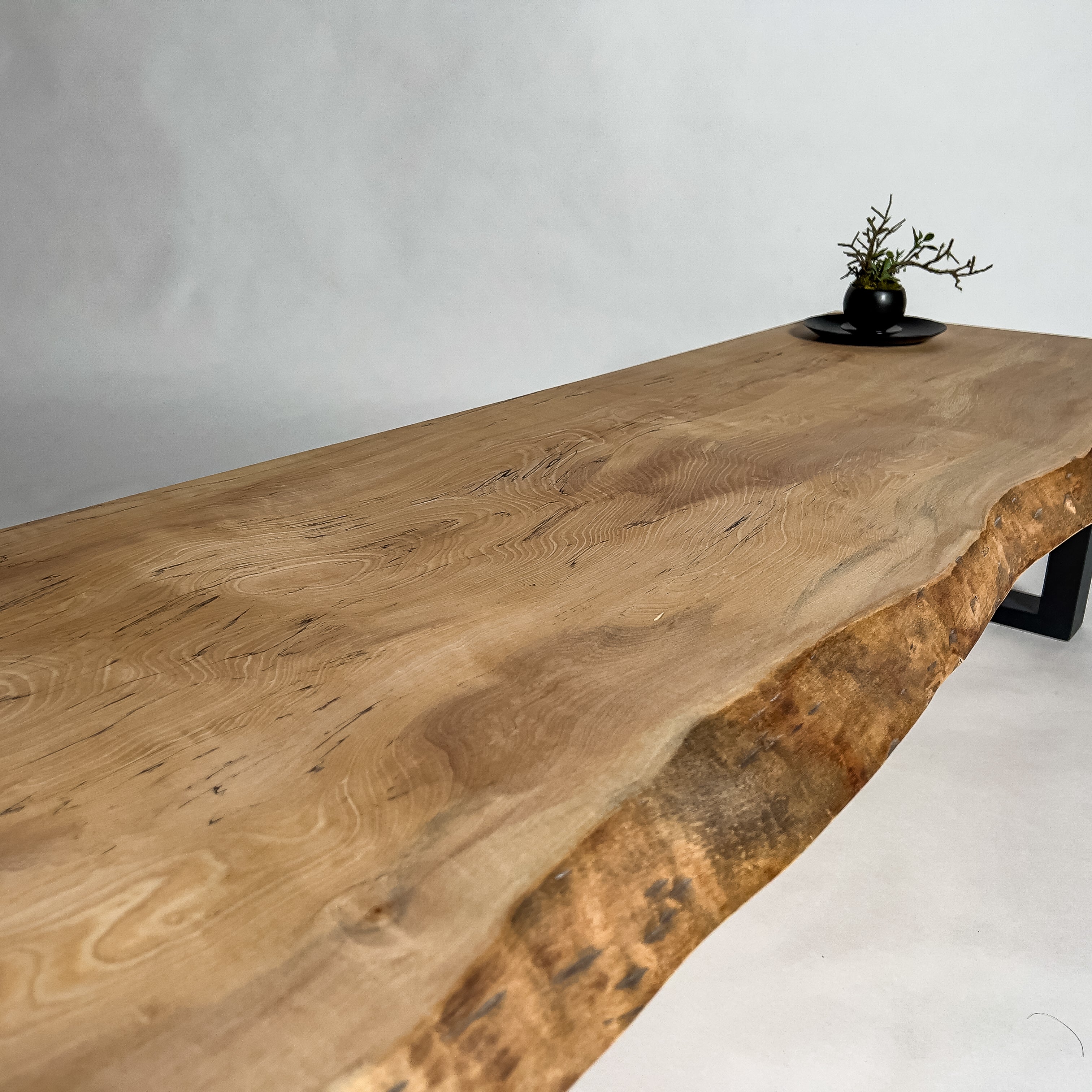 複数の板をつなぎ合わせたものとは異なり、途切れることなく続く杢目は自然の美しさをそのまま映し出します。