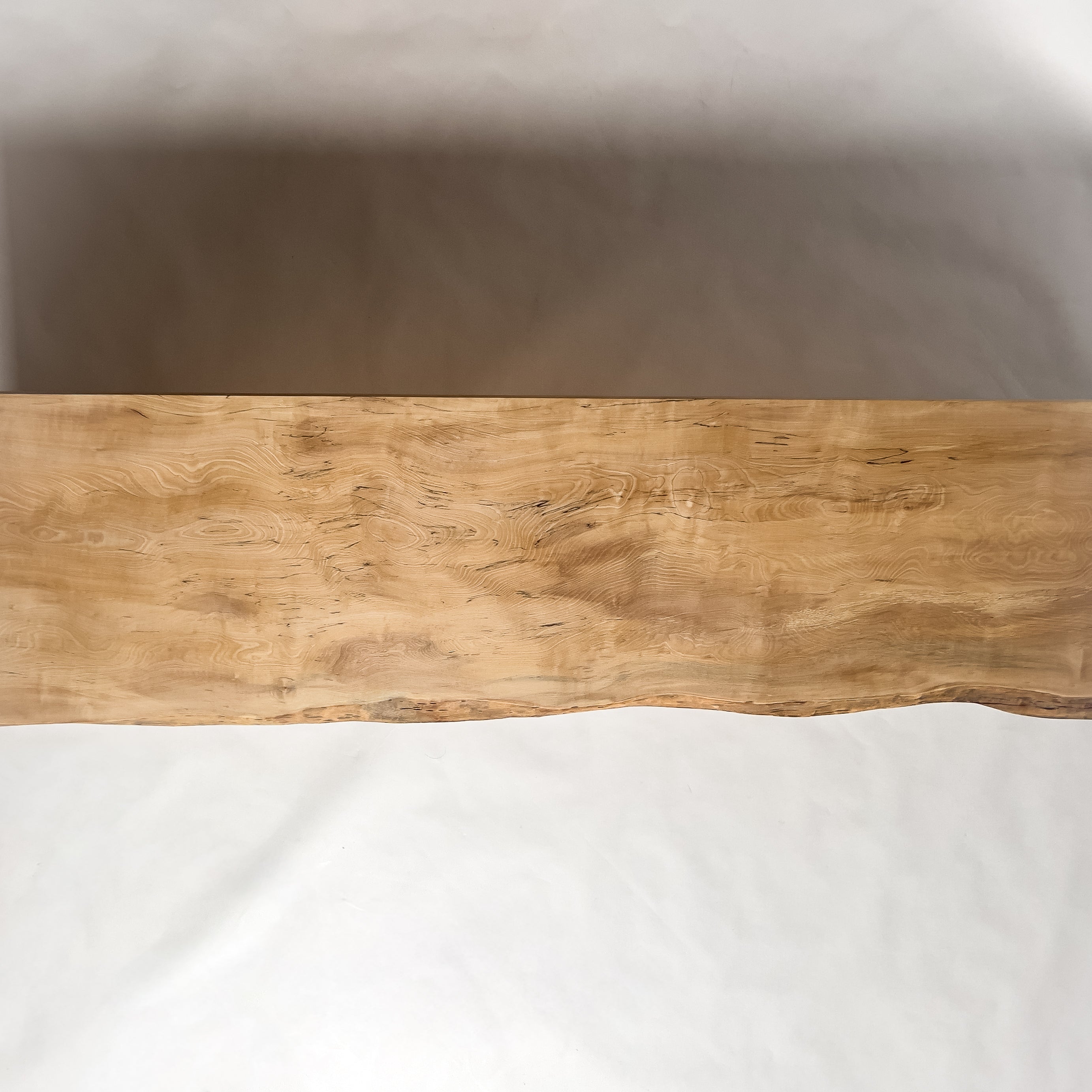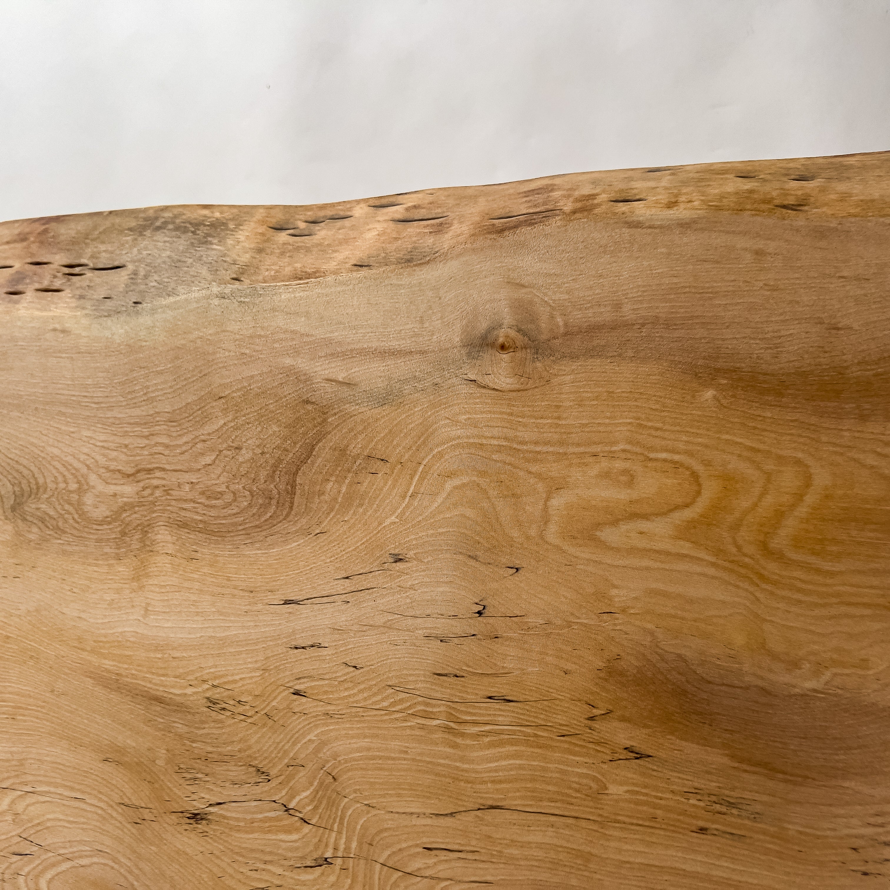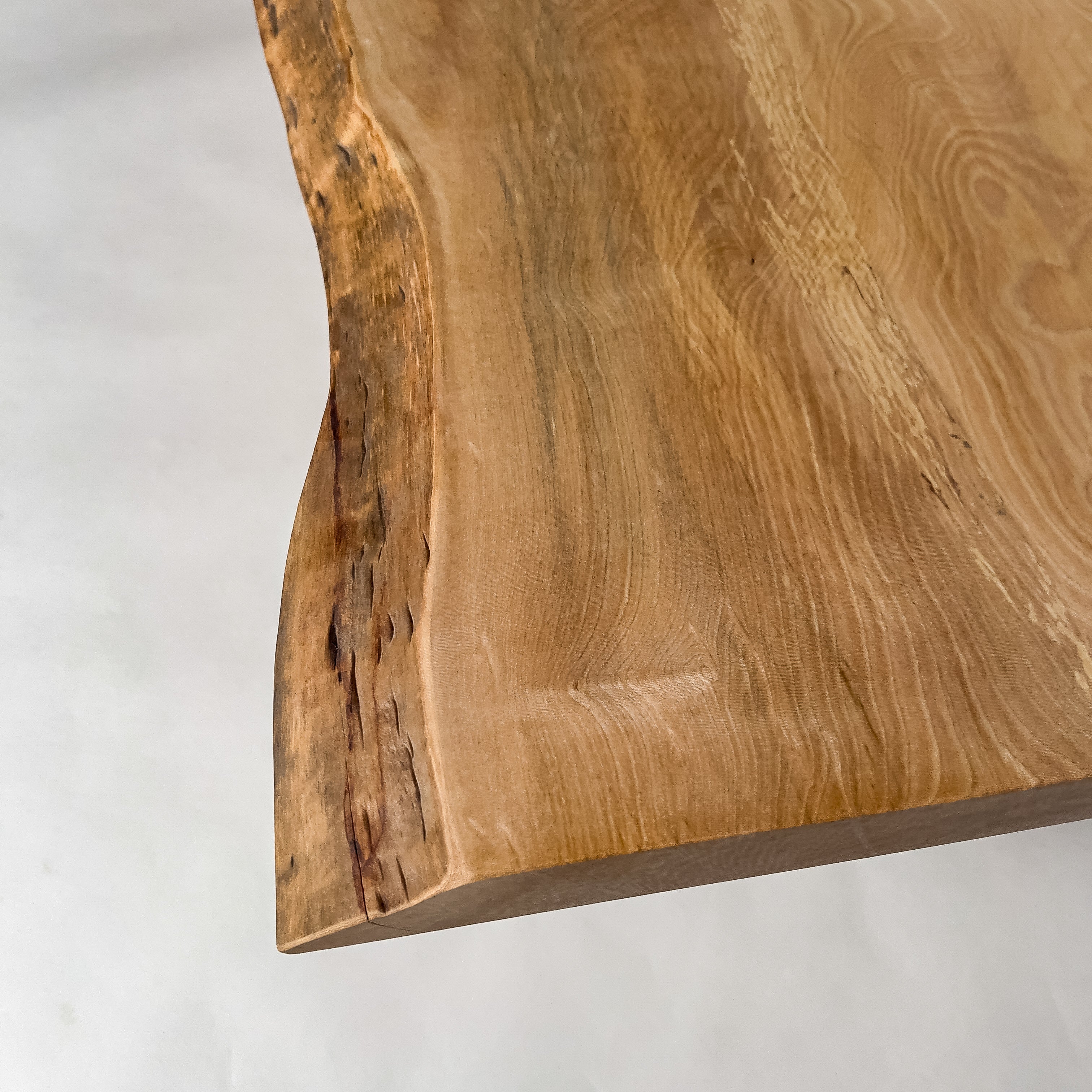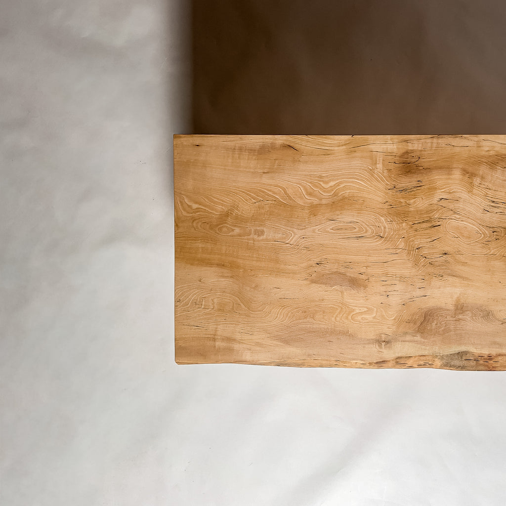 淡い色味の栃に、雪深い土地でゆっくり育った年輪が重なります。揺らぐような縮み杢は成長の証。形を活かす加工で躍動感を残した佇まい、静かな存在感。使うほどに表情が深まり、暮らしに自然と馴染んでいきます。