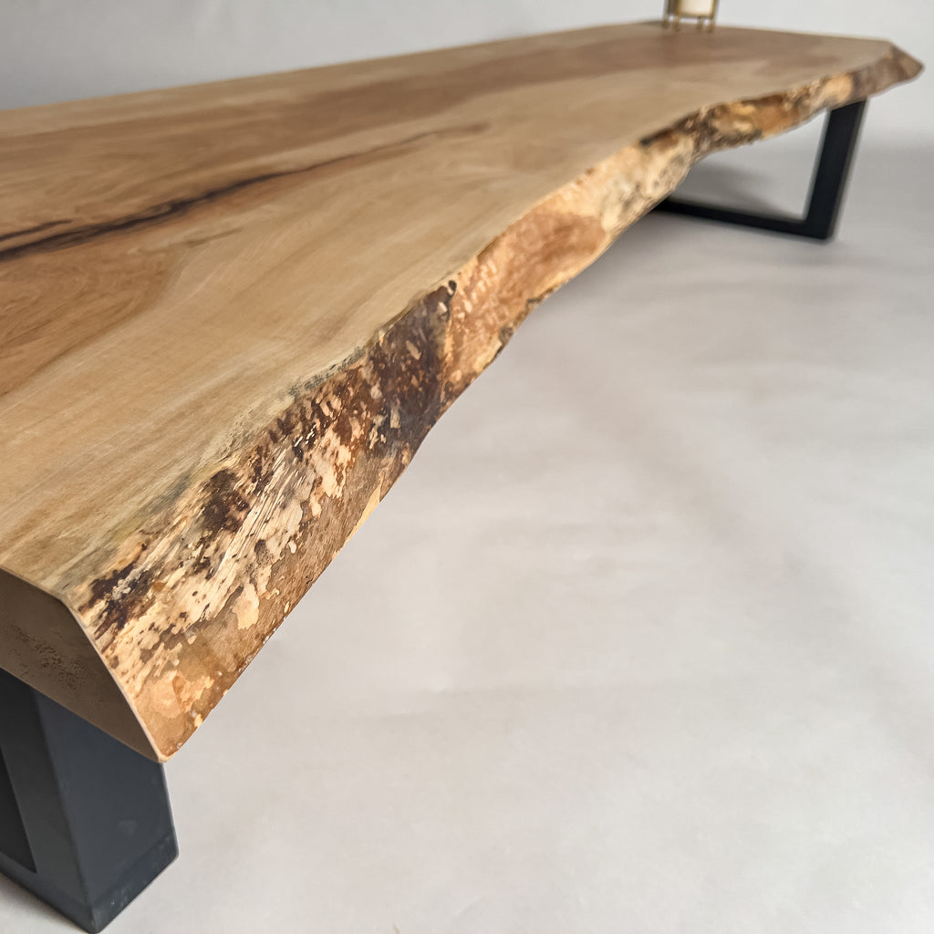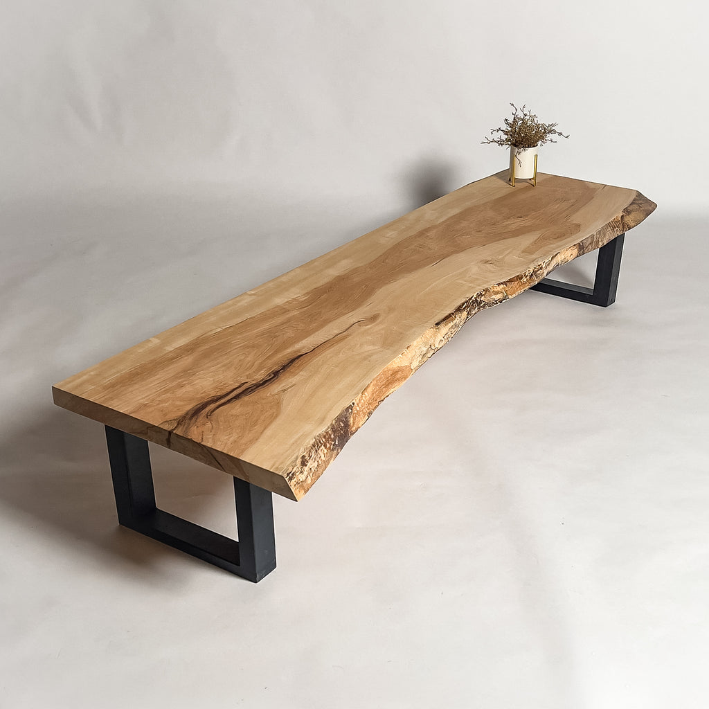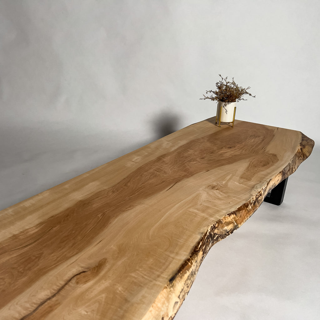 自然が生み出した不均一な表情を 読み解き、素材の持つ品格や奥行きが際立つよう、細部まで配慮した加工で完成度を高める。 一枚板単体の美しさだけでなく、置かれる空間や光の入り方までを思い描き、その場に自然と溶け込む佇まいへと仕上げる。