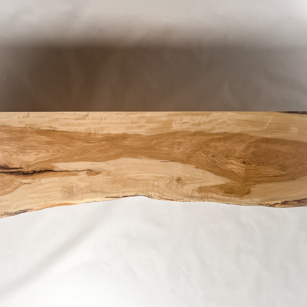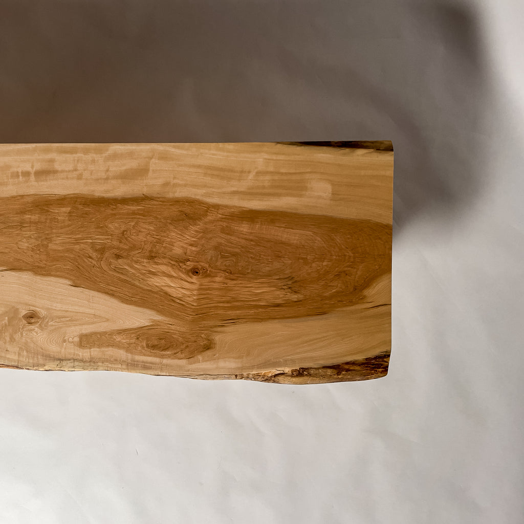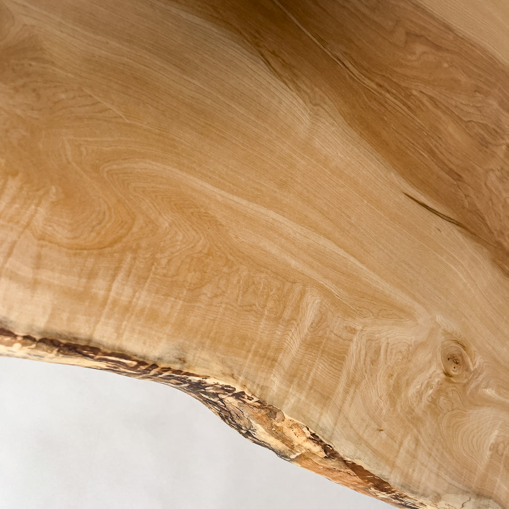 仕上がりの質感や印象にまで細やかに気を配り、使われる空間や暮らしを見据えた、やわらかな佇まいへと丁寧に仕上げる。 木が持つ節や皮、杢目の表情に寄り添い、その一つひとつを活かすことで、唯一無二の素材美を際立たせた一枚板づくりを行う。