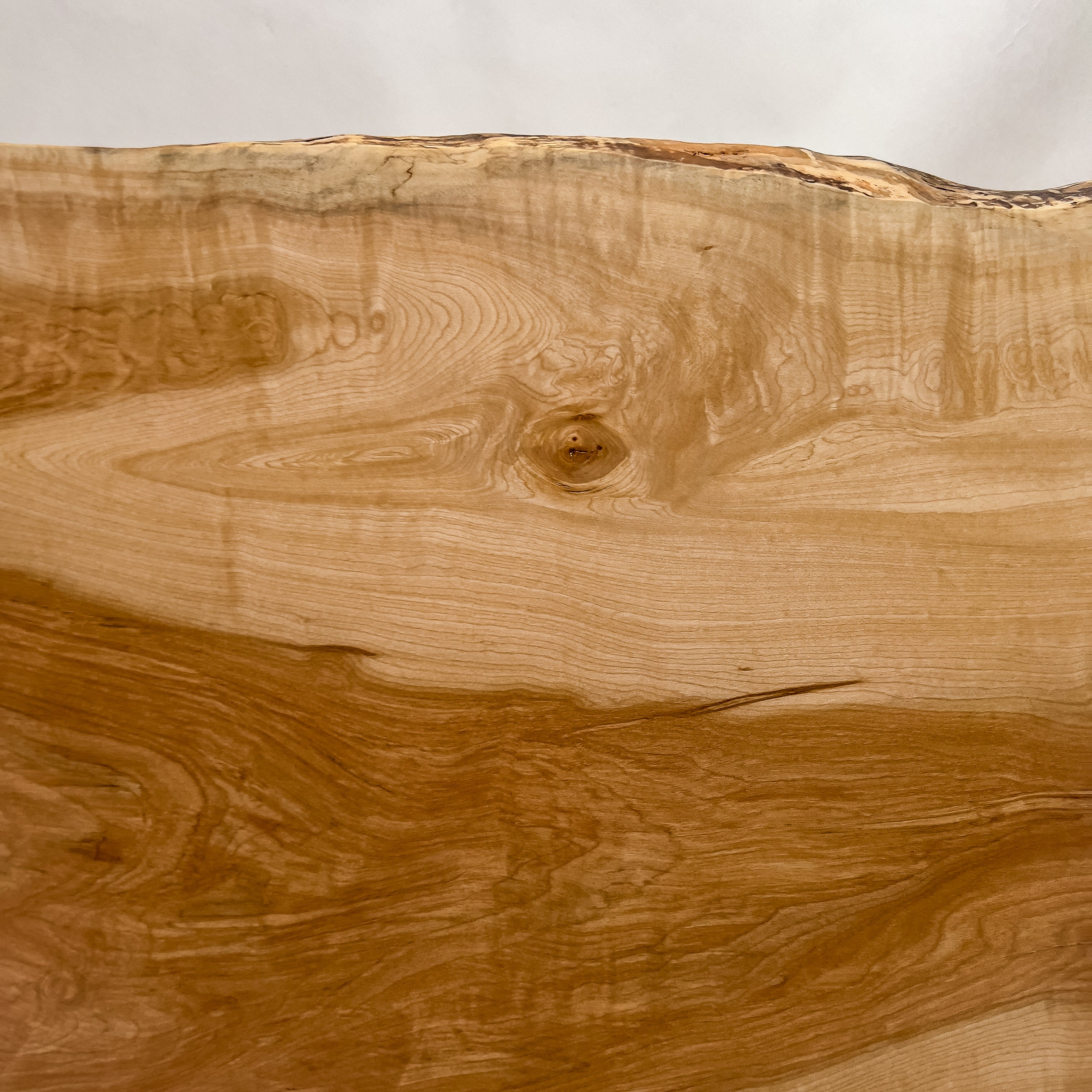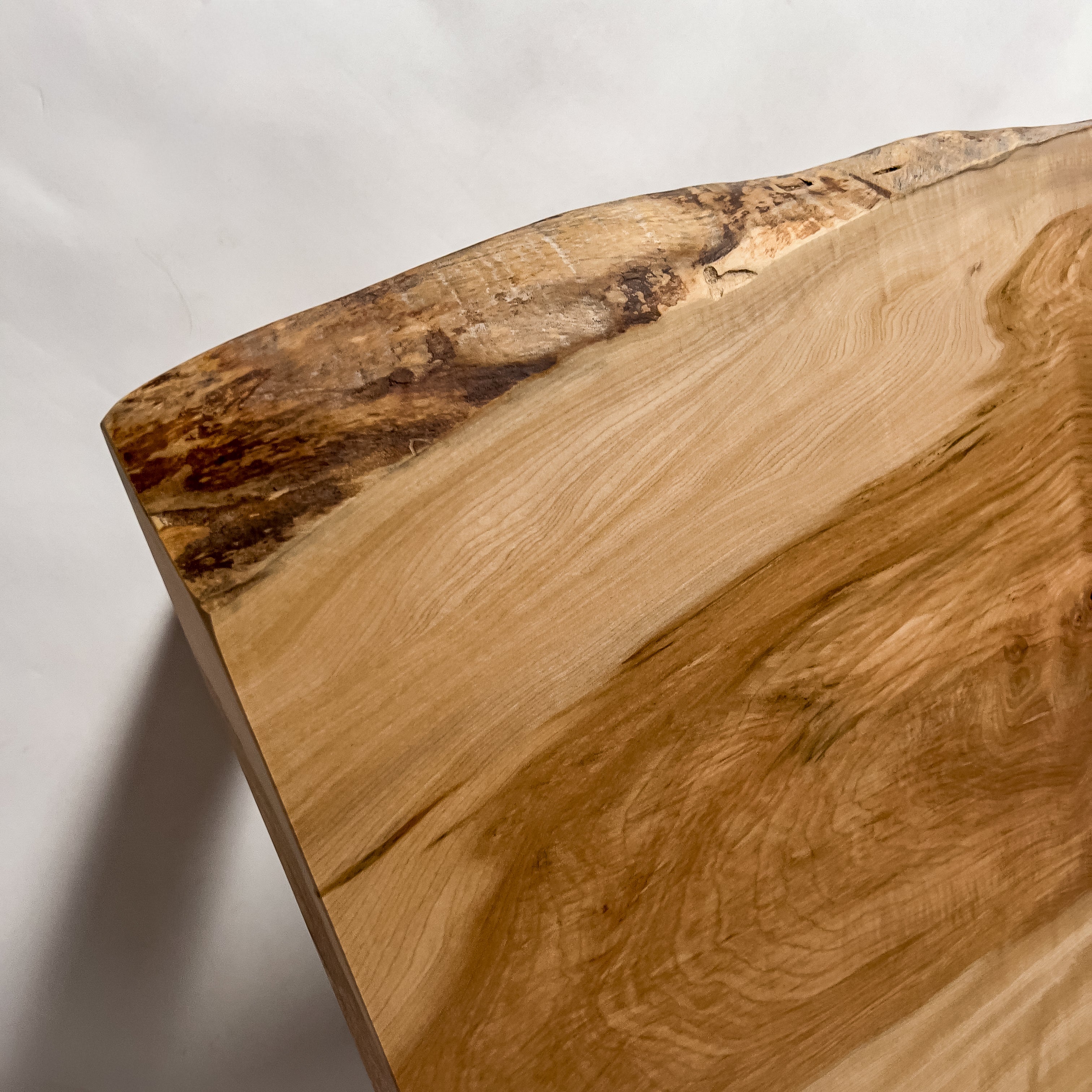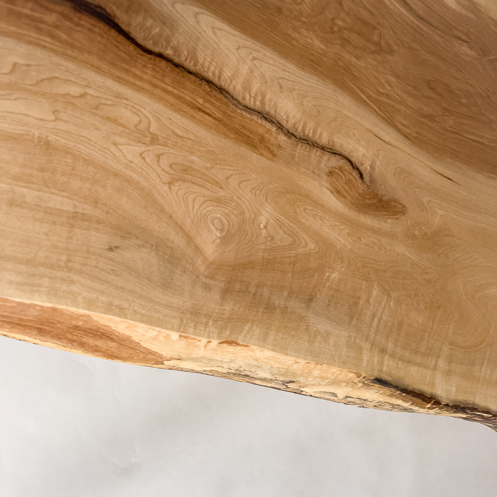 仕上がりの質感や印象にまで細やかに気を配り、使われる空間や暮らしを見据えた、やわらかな佇まいへと丁寧に仕上げる。 木が持つ節や皮、杢目の表情に寄り添い、その一つひとつを活かすことで、唯一無二の素材美を際立たせた一枚板づくりを行う。