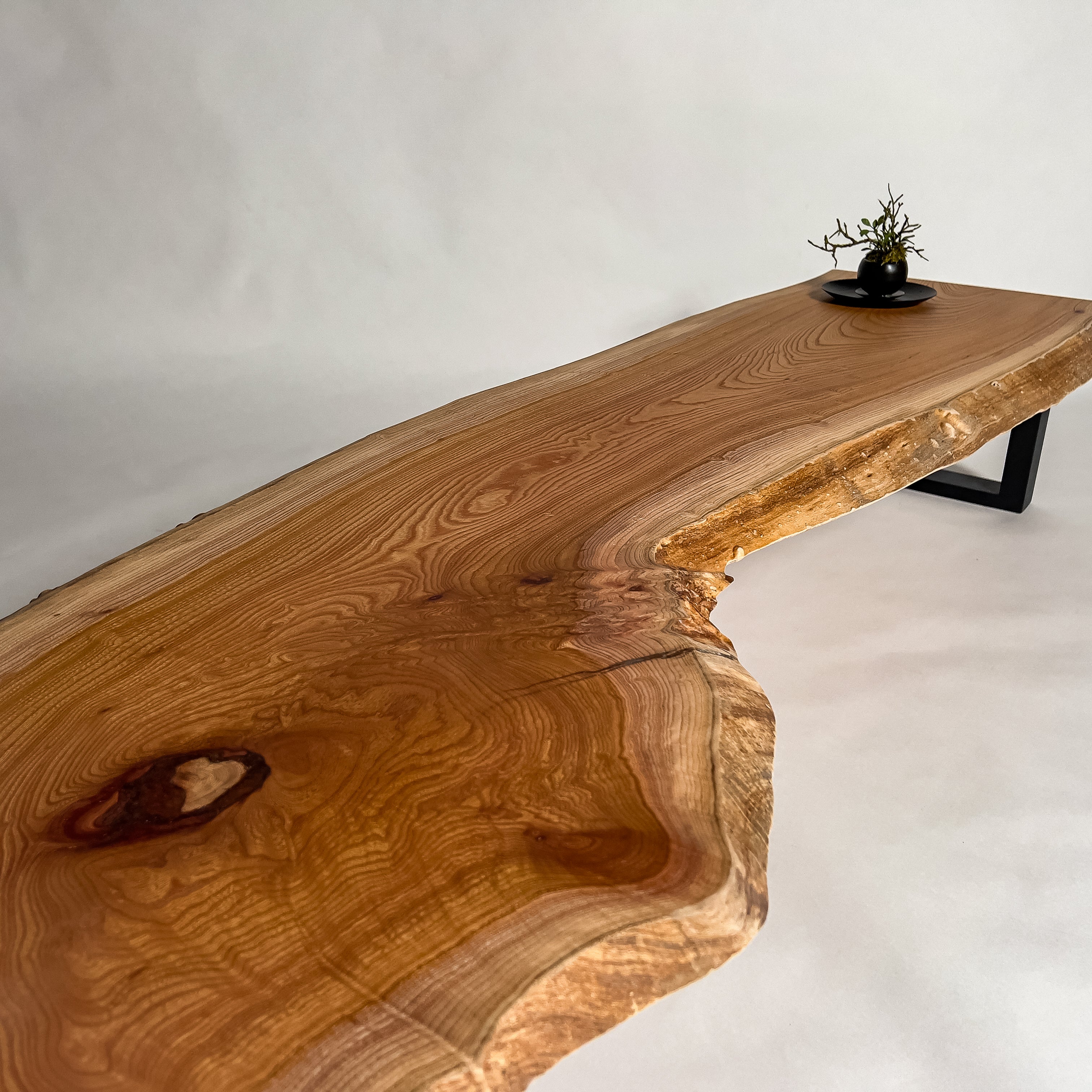 自然が生み出した不均一な表情を 読み解き、素材の持つ品格や奥行きが際立つよう、細部まで配慮した加工で完成度を高める。 一枚板単体の美しさだけでなく、置かれる空間や光の入り方までを思い描き、その場に自然と溶け込む佇まいへと仕上げる。