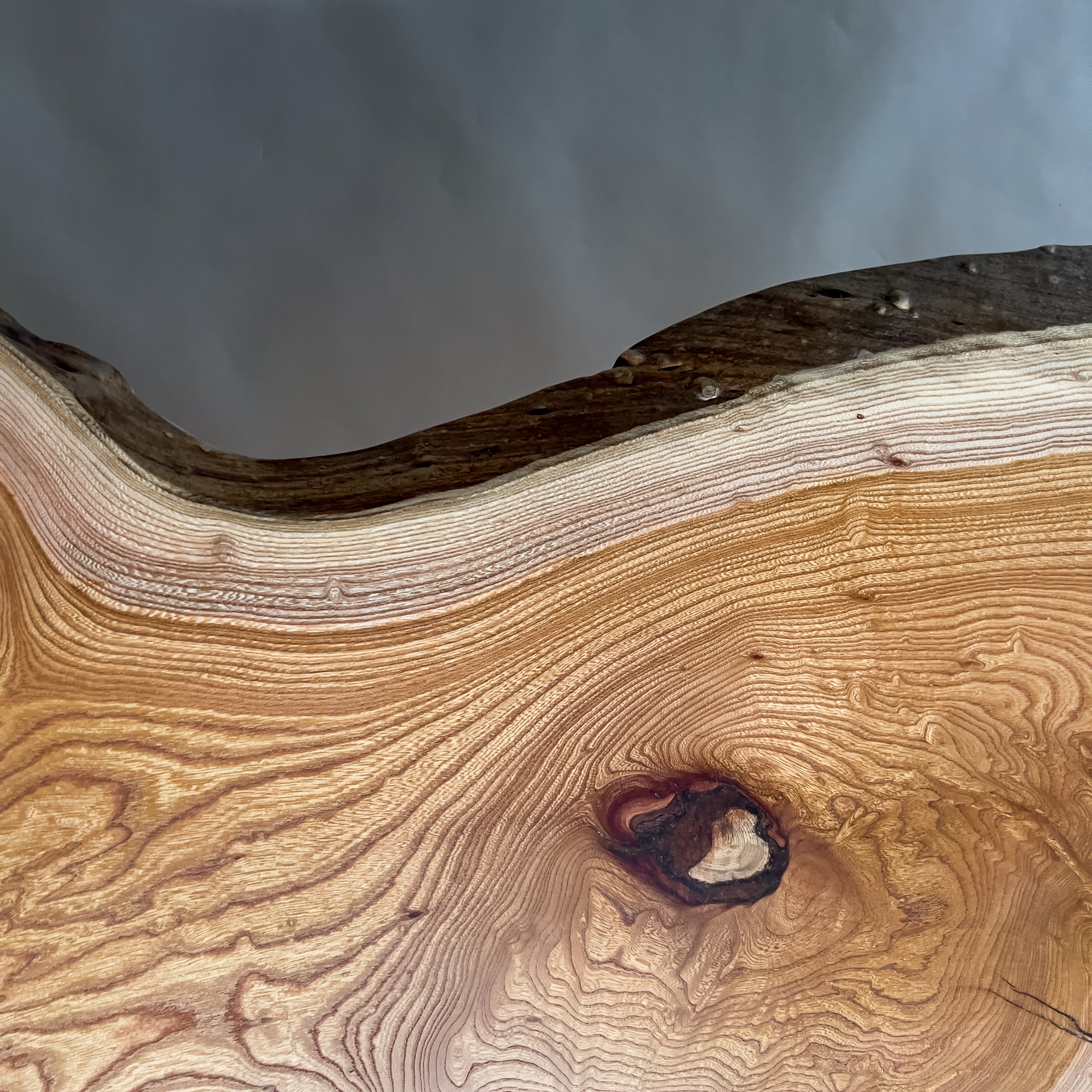 仕上がりの質感や印象にまで細やかに気を配り、使われる空間や暮らしを見据えた、やわらかな佇まいへと丁寧に仕上げる。 木が持つ節や皮、杢目の表情に寄り添い、その一つひとつを活かすことで、唯一無二の素材美を際立たせた一枚板づくりを行う。