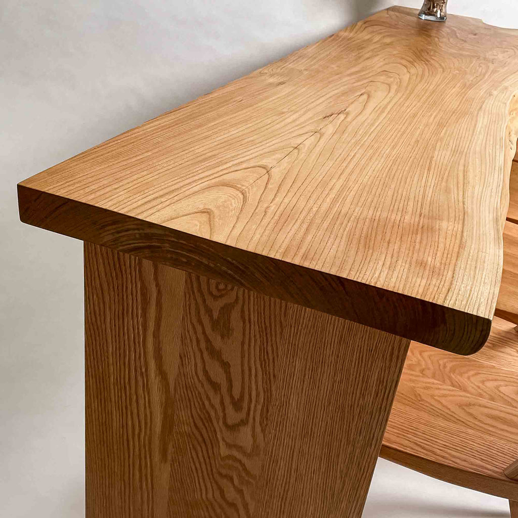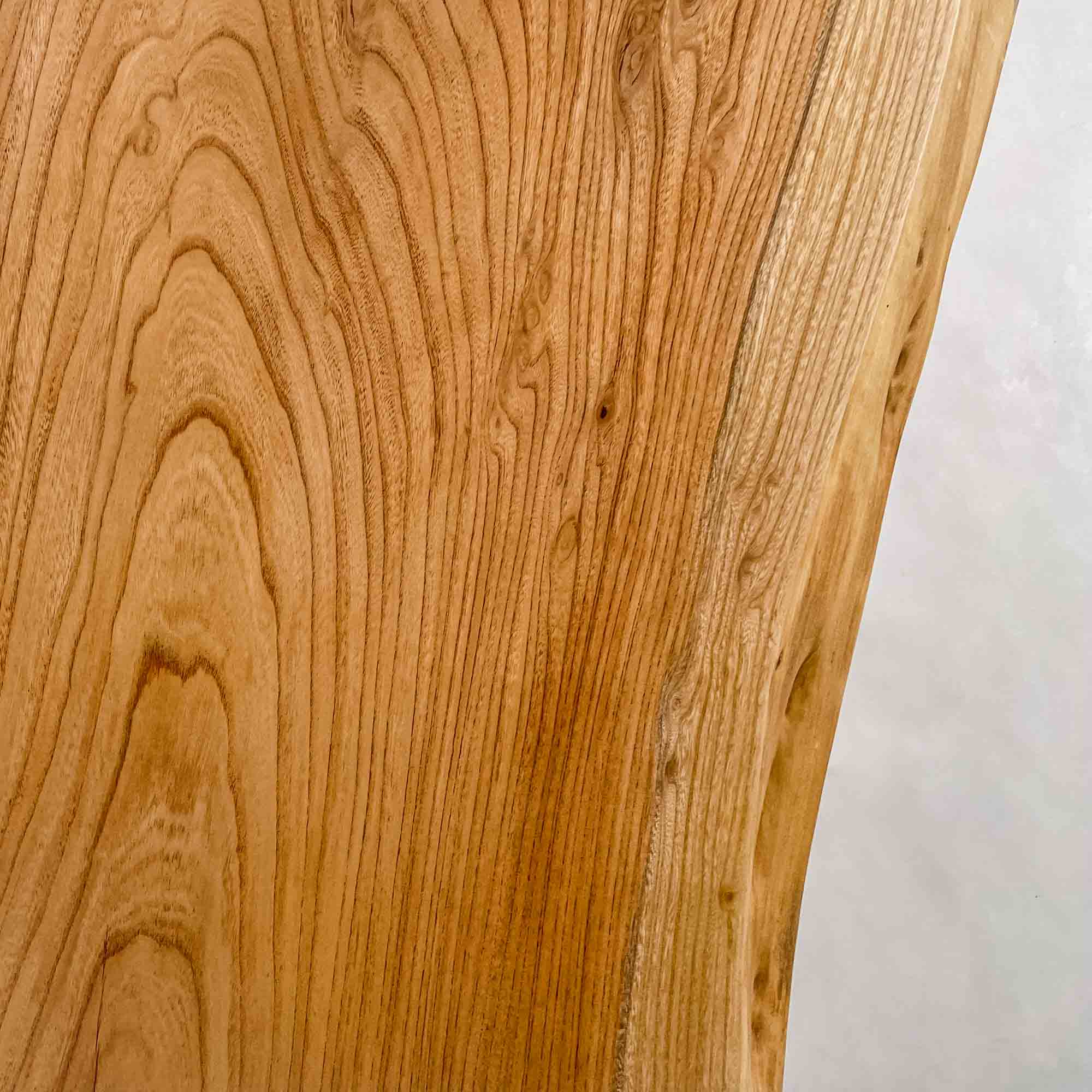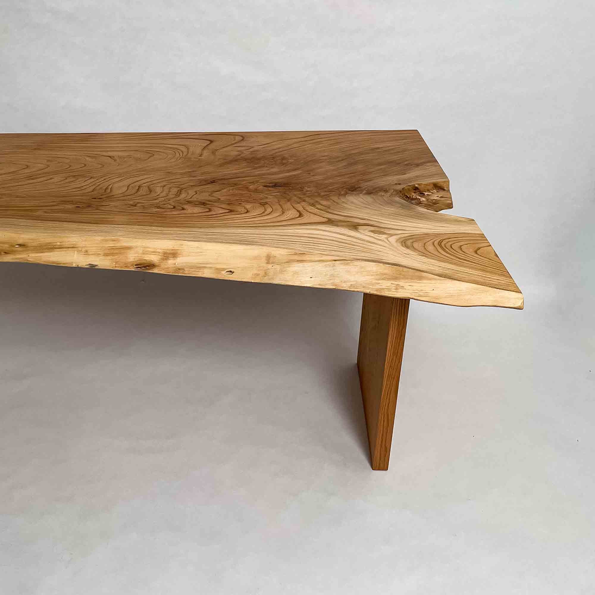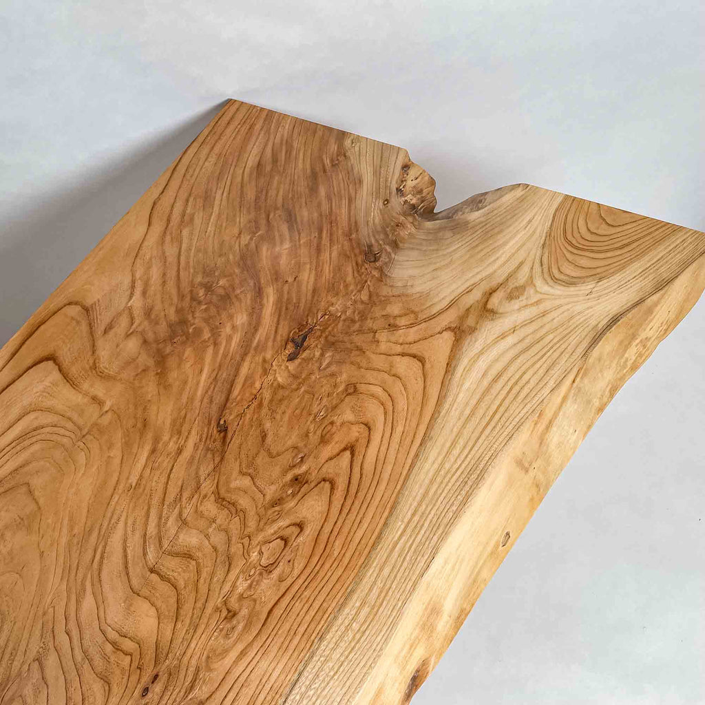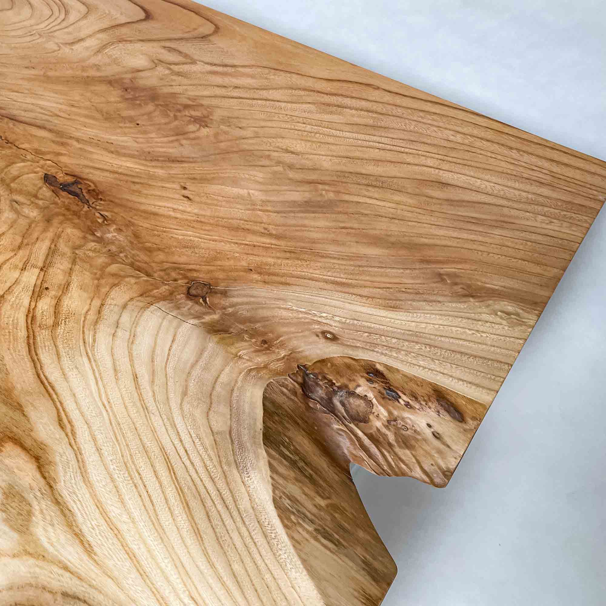 中央が絞られ右側へ大きく広がる非対称の天板に、力強く流れる年輪が重なり、食事や作業の位置によって視線と使い方が変わる一枚です。細い側と広い側で役割を分けやすく、日常の動きに自然な変化を生みます。