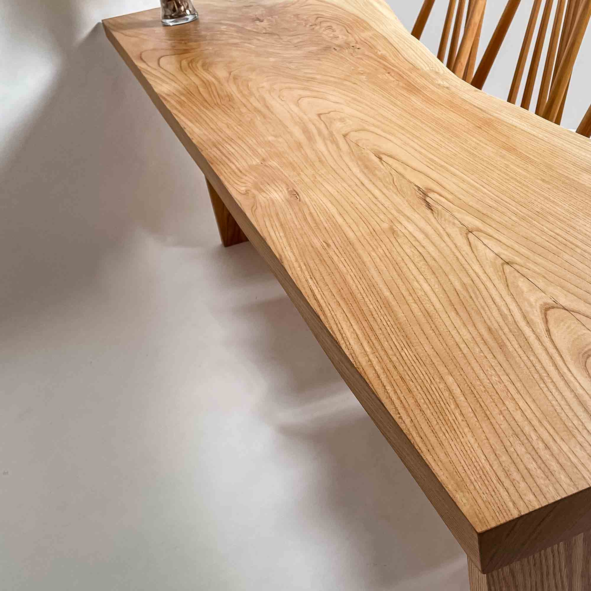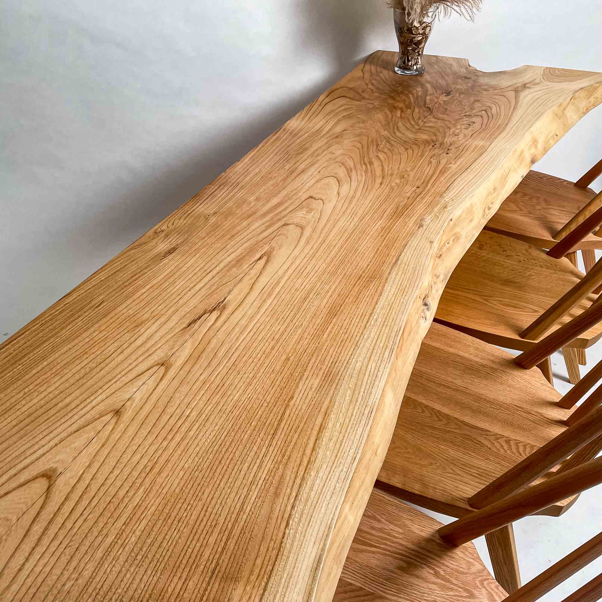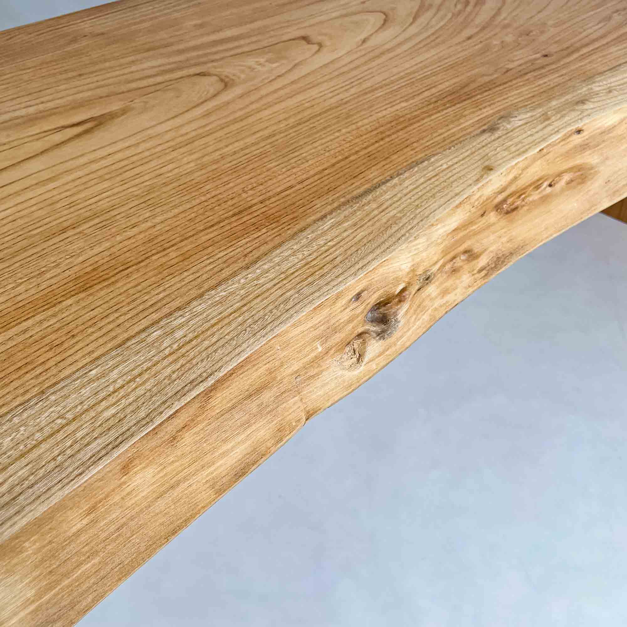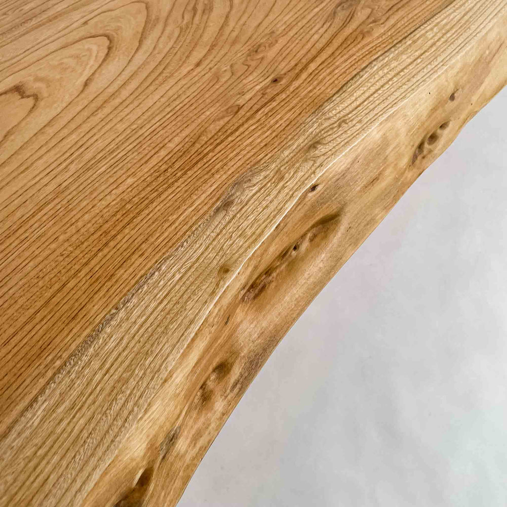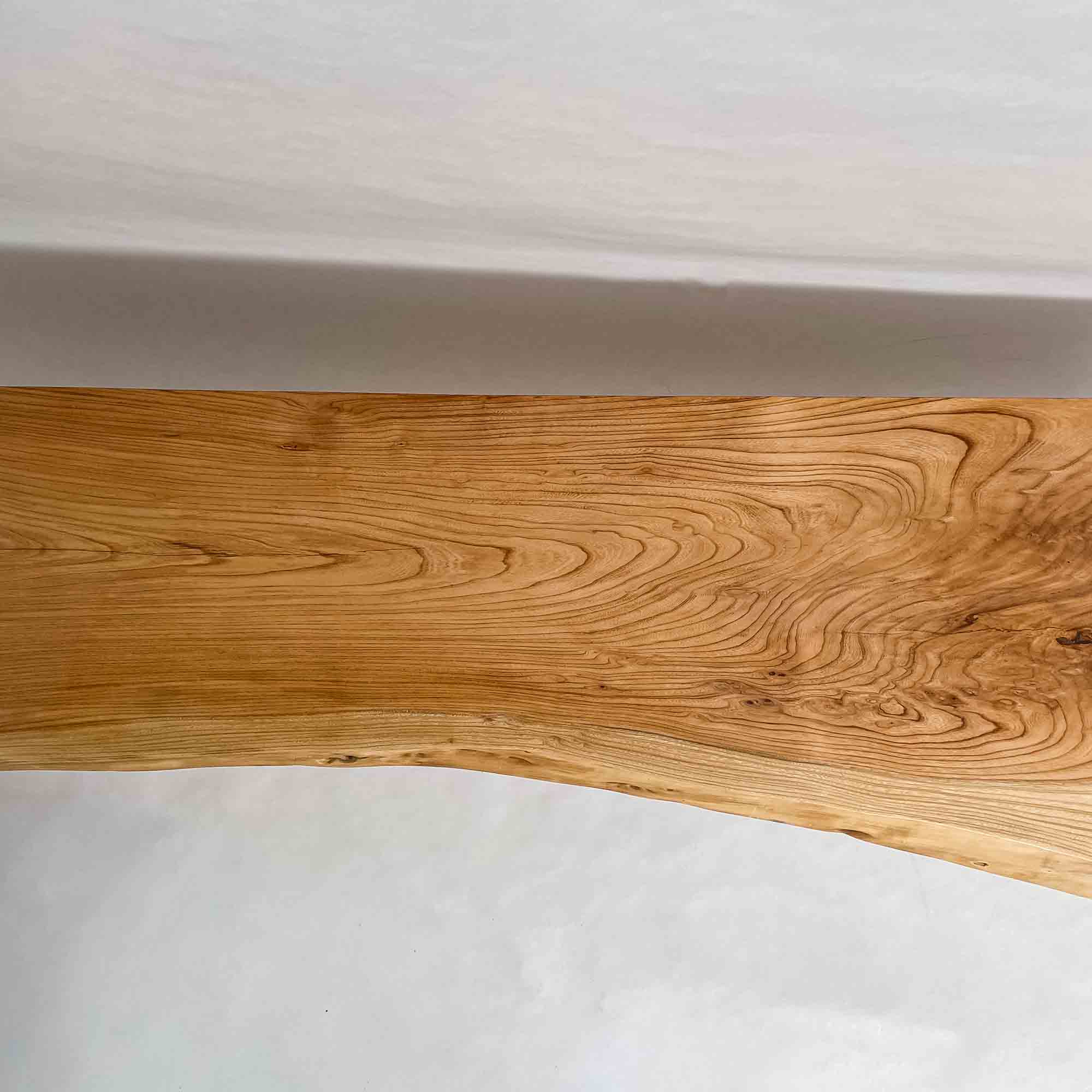 中央が絞られ右側へ大きく広がる非対称の天板に、力強く流れる年輪が重なり、食事や作業の位置によって視線と使い方が変わる一枚です。細い側と広い側で役割を分けやすく、日常の動きに自然な変化を生みます。