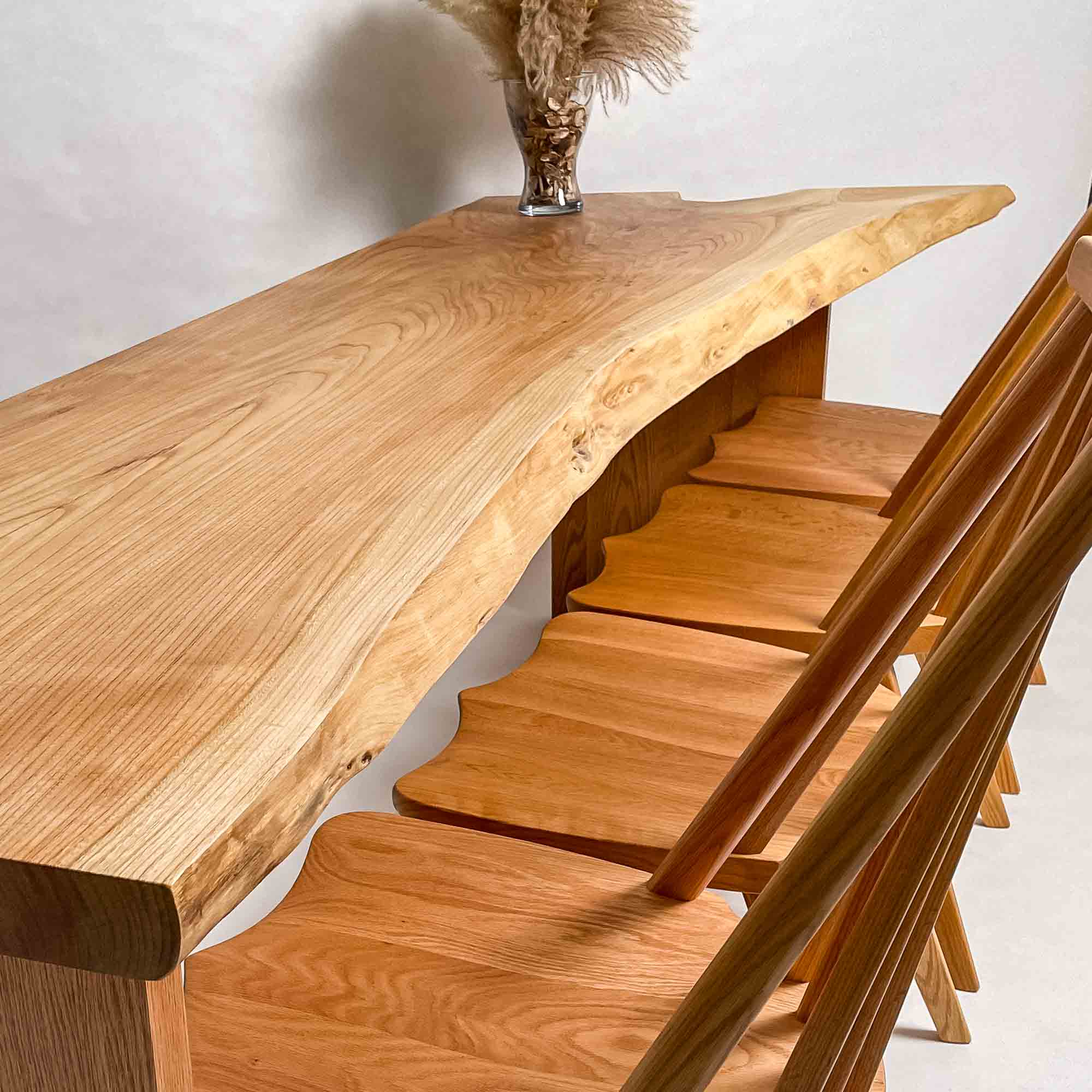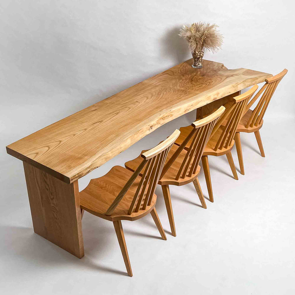| 時代を超えて受け継がれる機能性と、現代の暮らしに寄り添うデザイン性を兼ね備えた一枚板家具の製作を手がける。 | 現代の空間に映えるモダンなデザイン性を取り入れながら、一枚板の持つ素材感と存在感を活かした加工・製作を行う。 | |