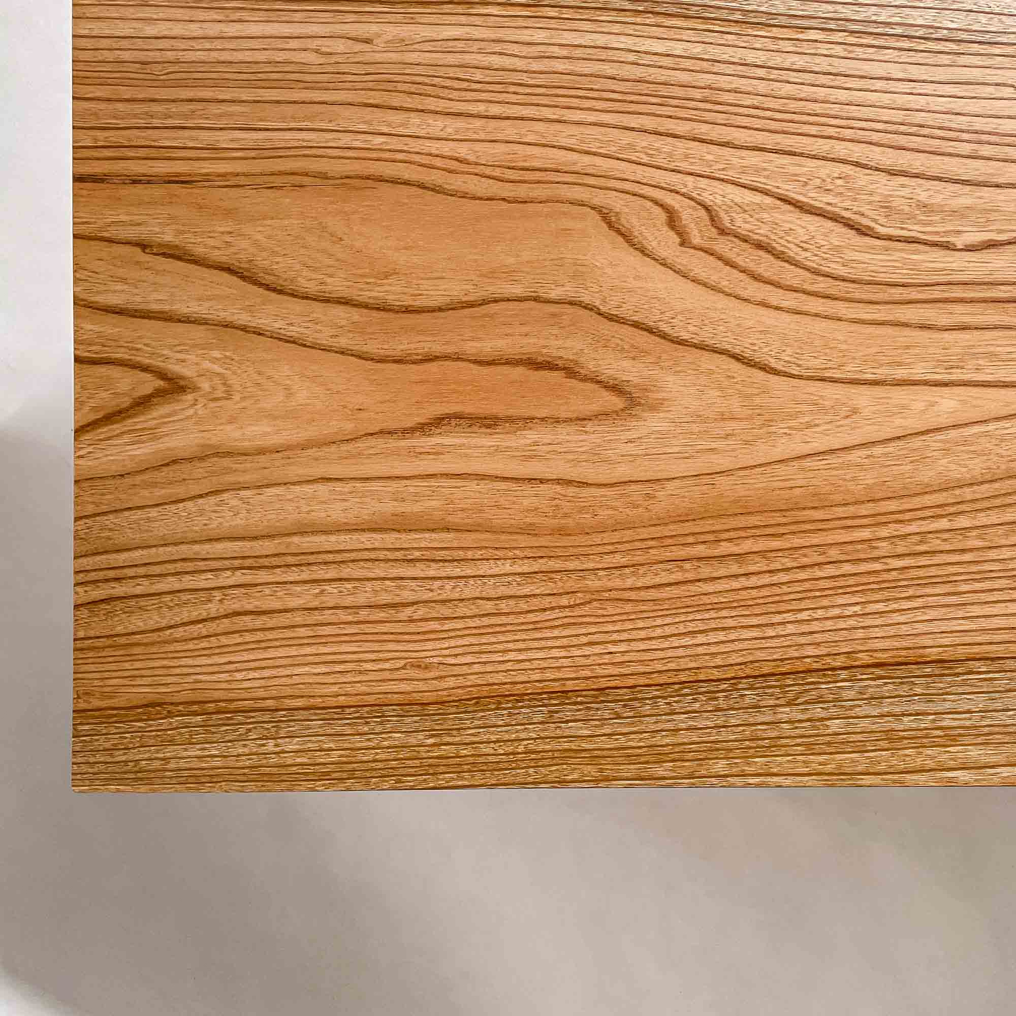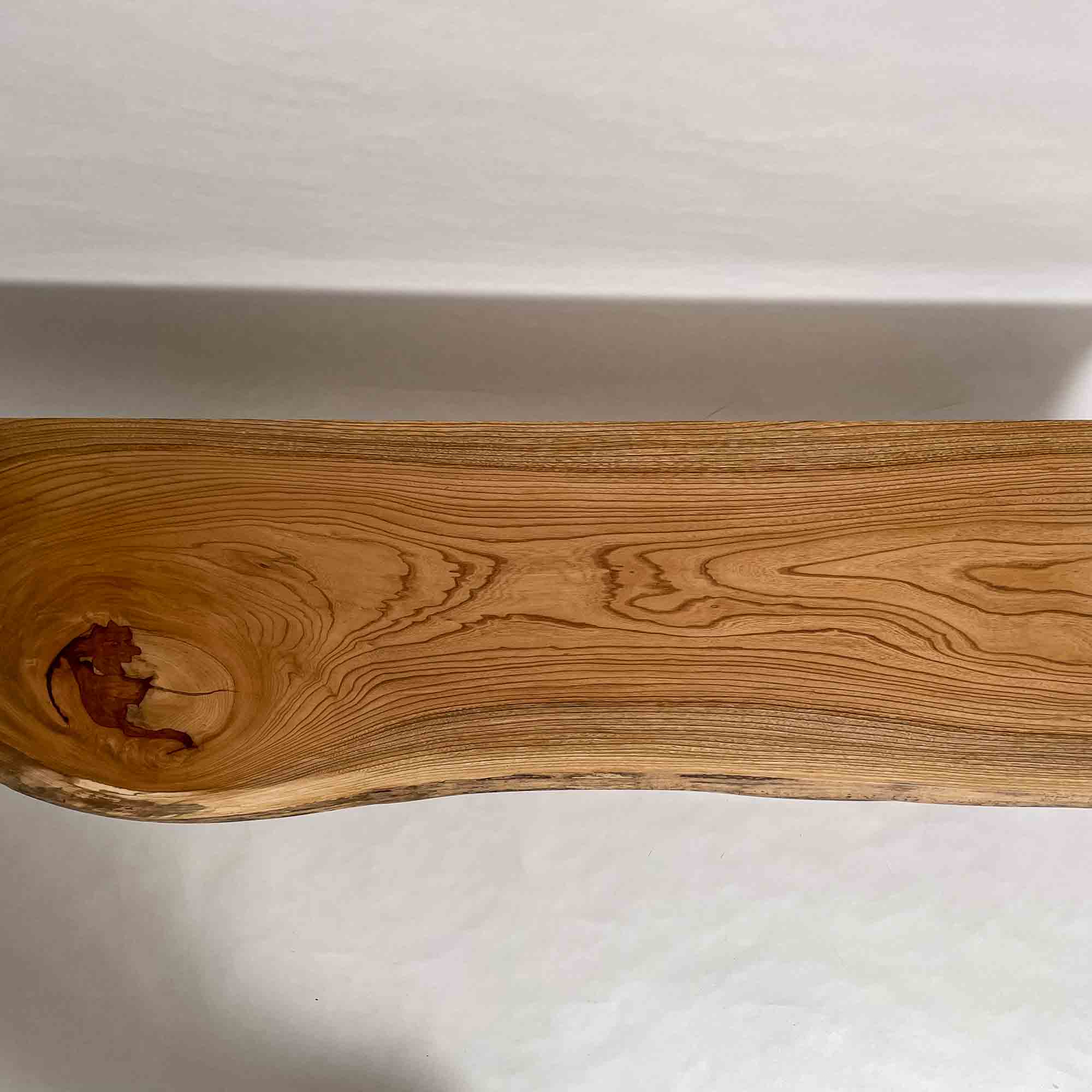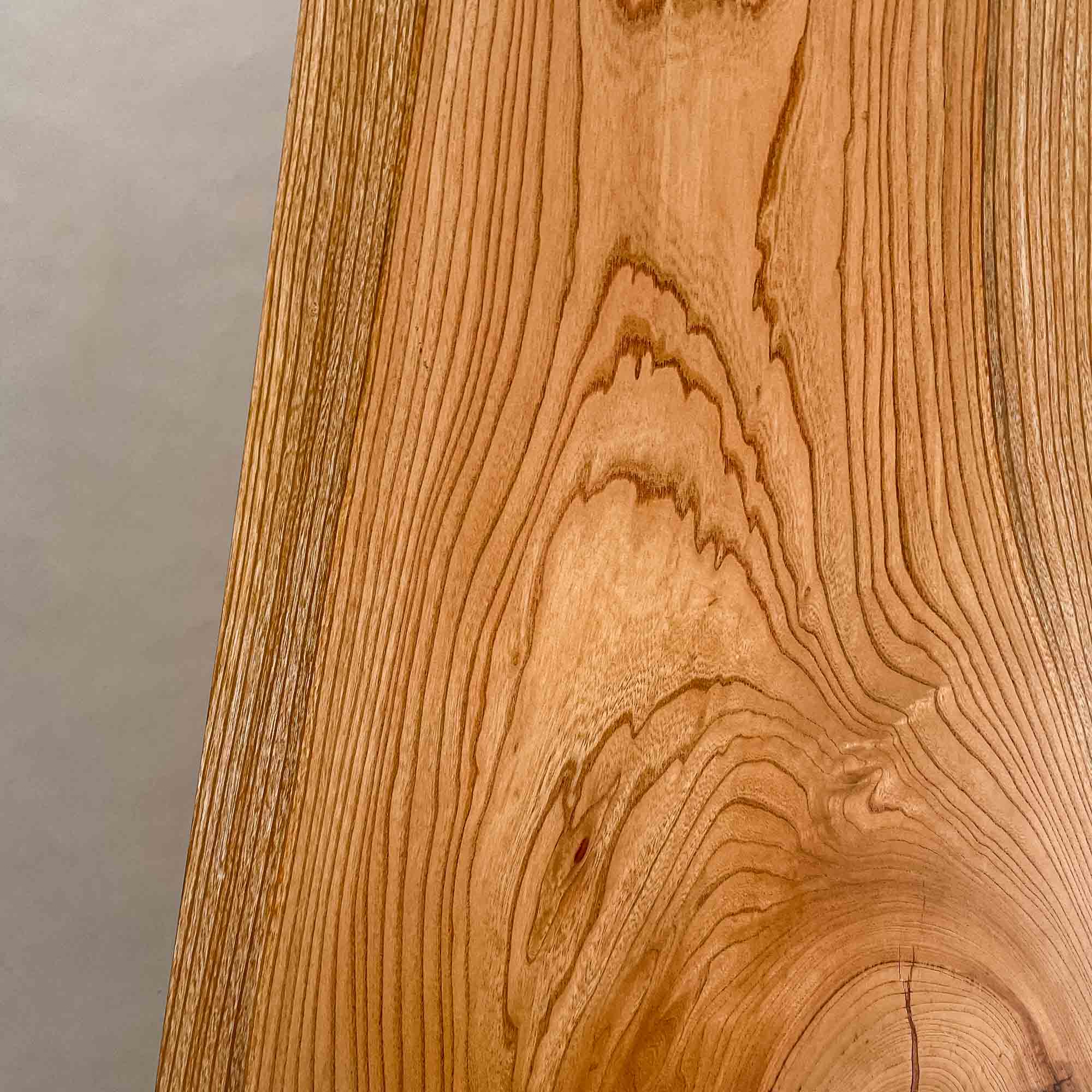 左端の大きな節を起点に木目が中央へほどけるように流れ、細身の輪郭の中に欅らしい力強さと軽やかな使いやすさが並ぶ一枚です。