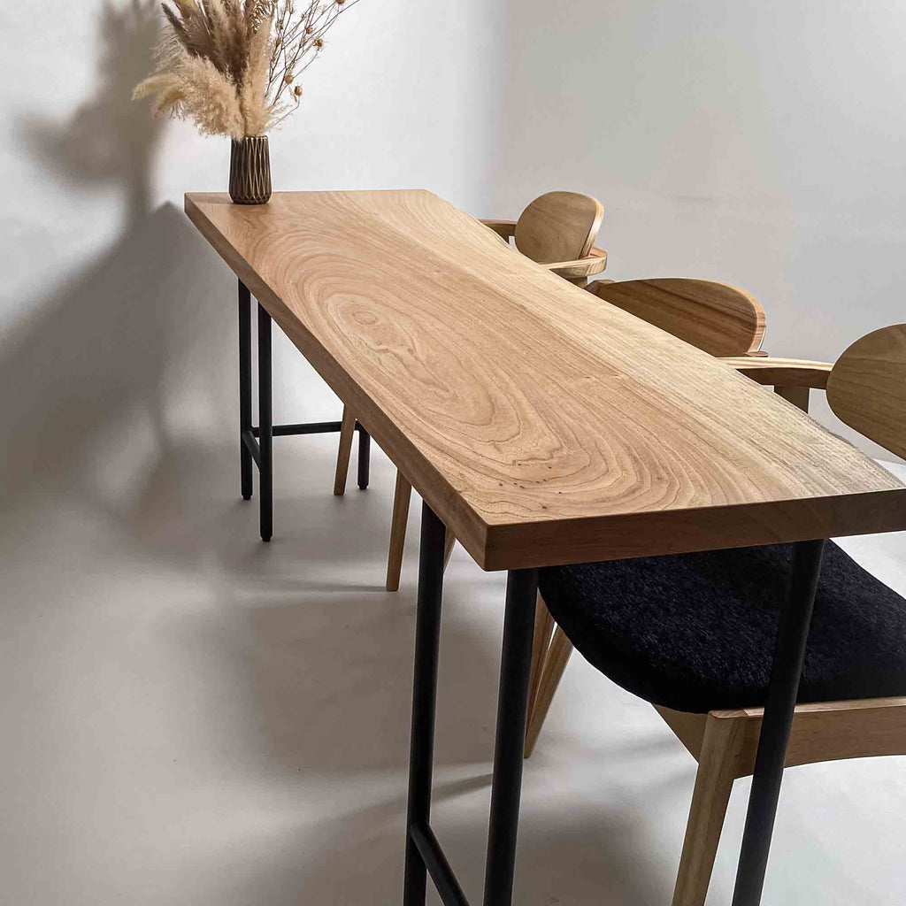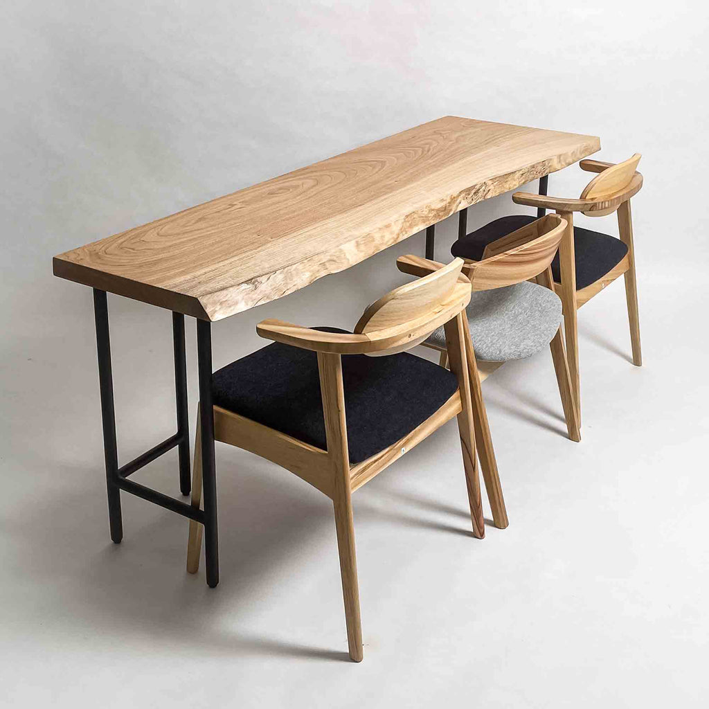 | 時代を超えて受け継がれる機能性と、現代の暮らしに寄り添うデザイン性を兼ね備えた一枚板家具の製作を手がける。 | 現代の空間に映えるモダンなデザイン性を取り入れながら、一枚板の持つ素材感と存在感を活かした加工・製作を行う。 | |